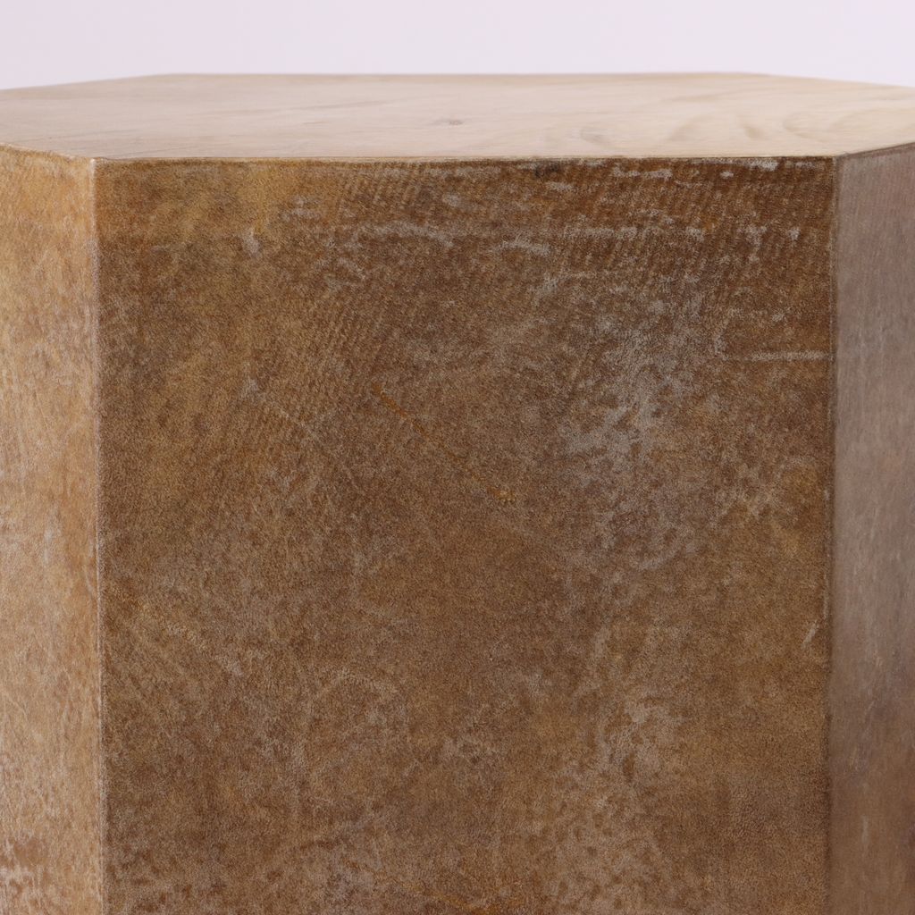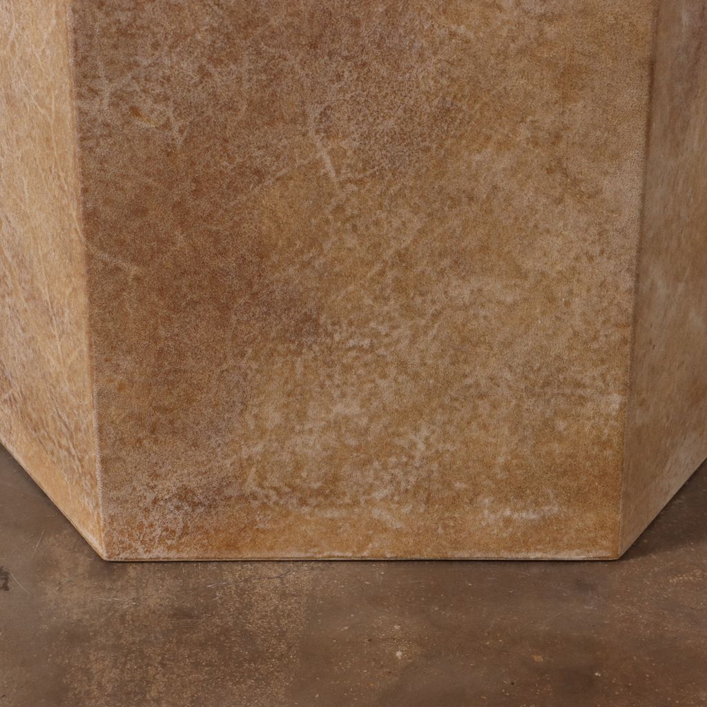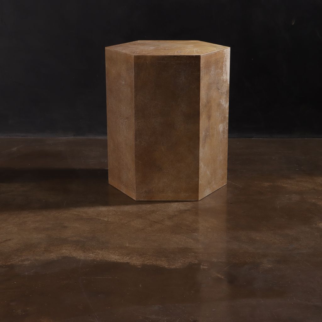 Our line of Hex tables are understated geometric forms that can be used alone or grouped together to form larger modular pieces. The Pergamino Hex employs sustainably sourced goatskin from Argentina whose natural coloration and texture complement the piece's minimal form.
