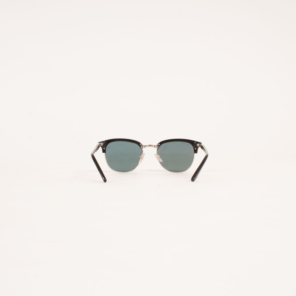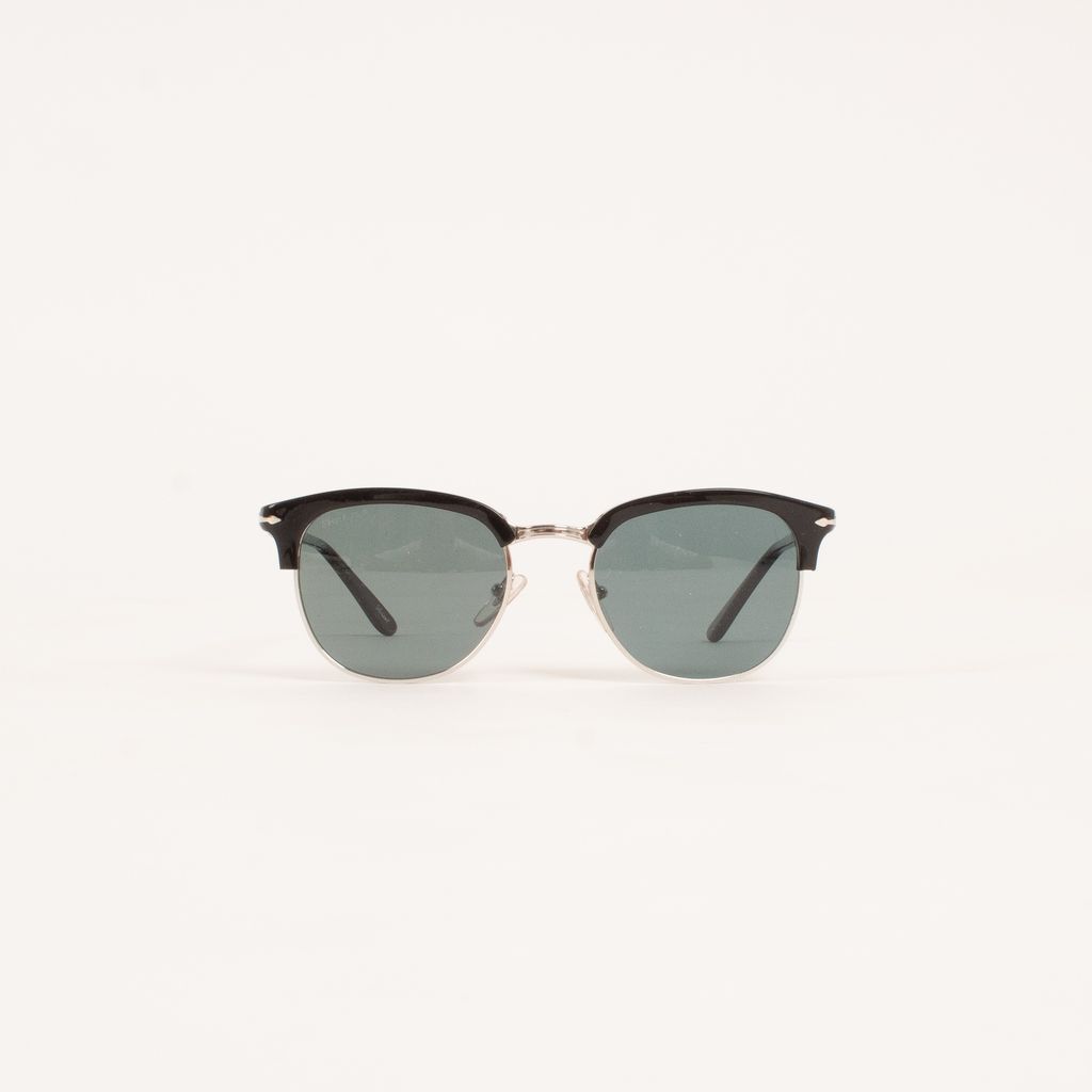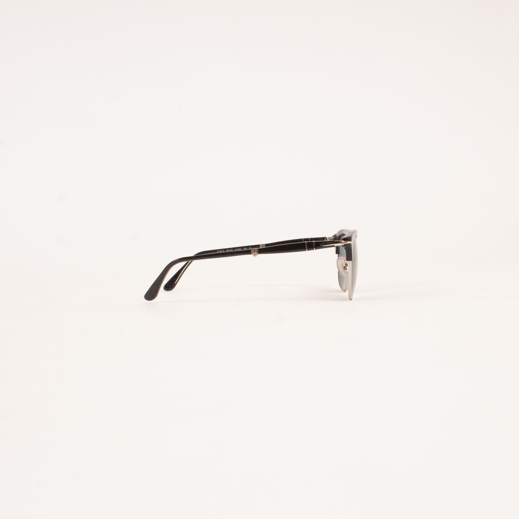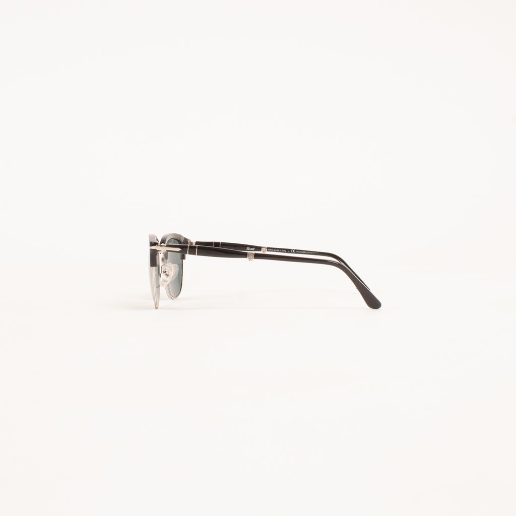 From legendary eyewear brand Persol, come these current iterations of their famous folding sunglasses design. Features blue tinted lenses, silver hardware, black frame detailing, and mutli-hinge fold down design.