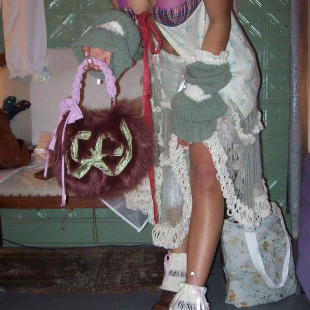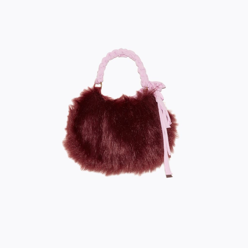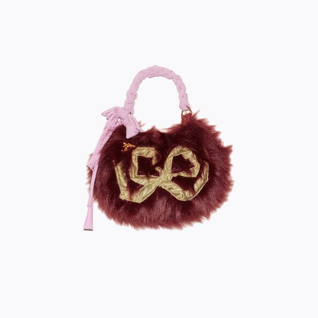 Faux fur mini bag featuring hand made t shirt ripcord handle, raw silk bow motif & adorned with a surprise vintage gold pin. Each bag is unique, bow shape, and gold pin will vary.