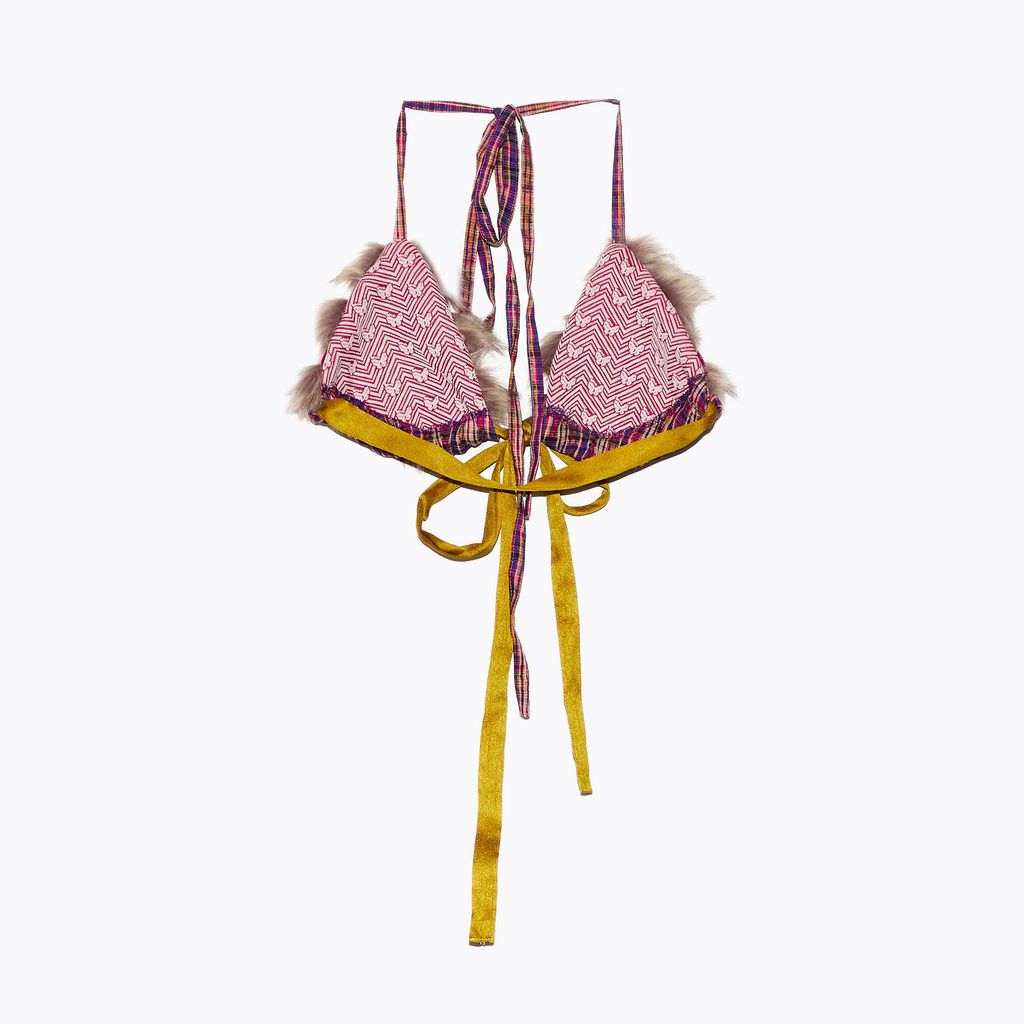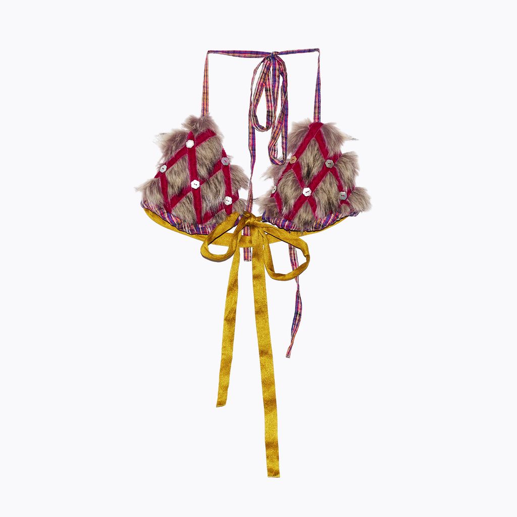 Open size faux fur bra adorned with velvet ribbon, mother of pearl buttons and raw silk ribbon.