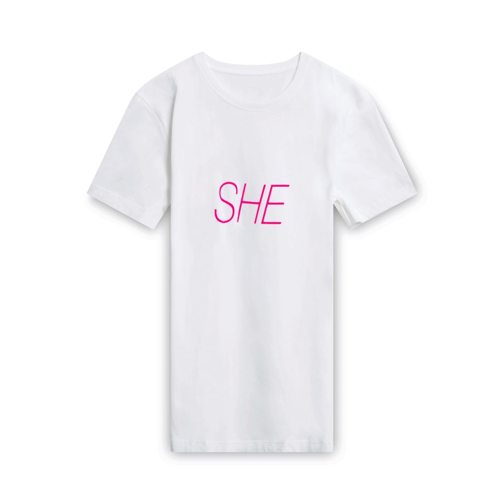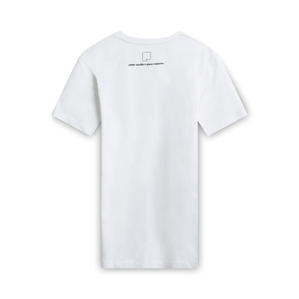 Peter Saville x Paco Rabanne "She" T-Shirt in White features "SHE" in velvet hot pink script and "Peter Saville x Paco Rabanne" logo on the back.