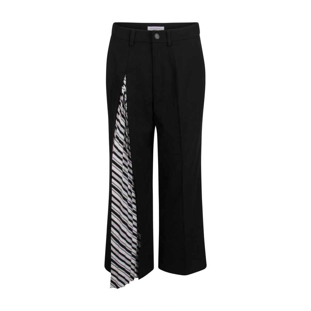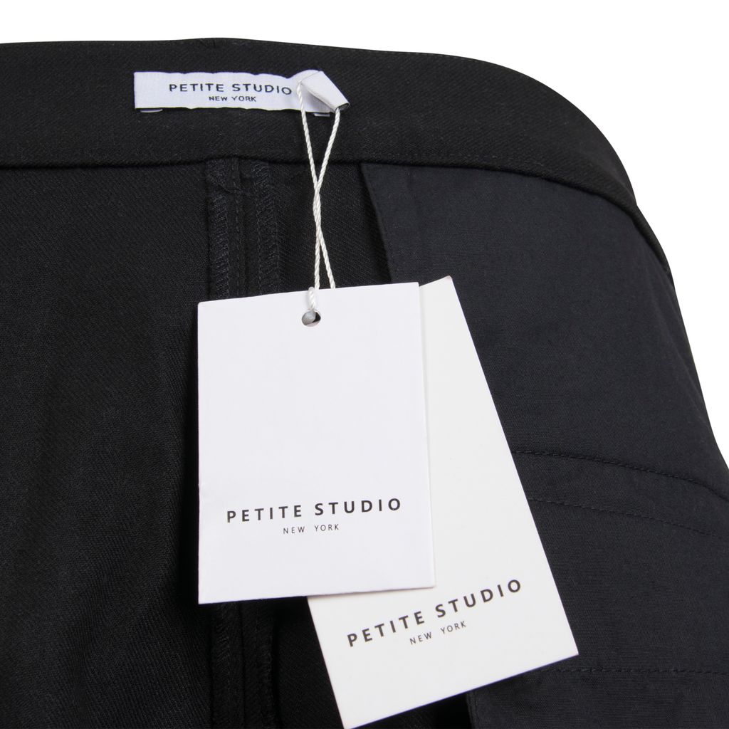 In easy-to-wear black these pants by Petite Studio feature a pleated panel of striped fabric on the right leg, functional side pockets, and have a high waist wide-leg silhouette. Dress yours up with heels or point-toe boots for a more edgy look. Brand new, tags attached.