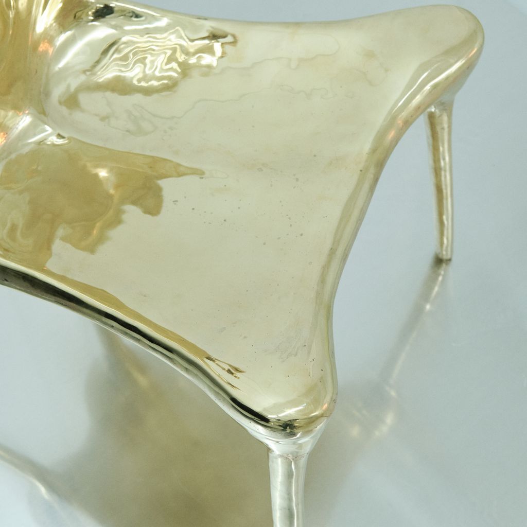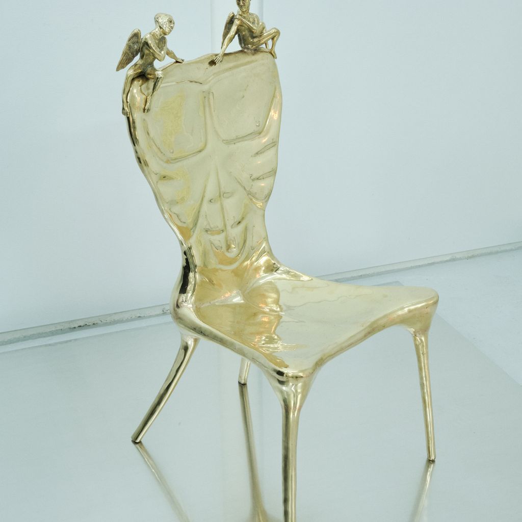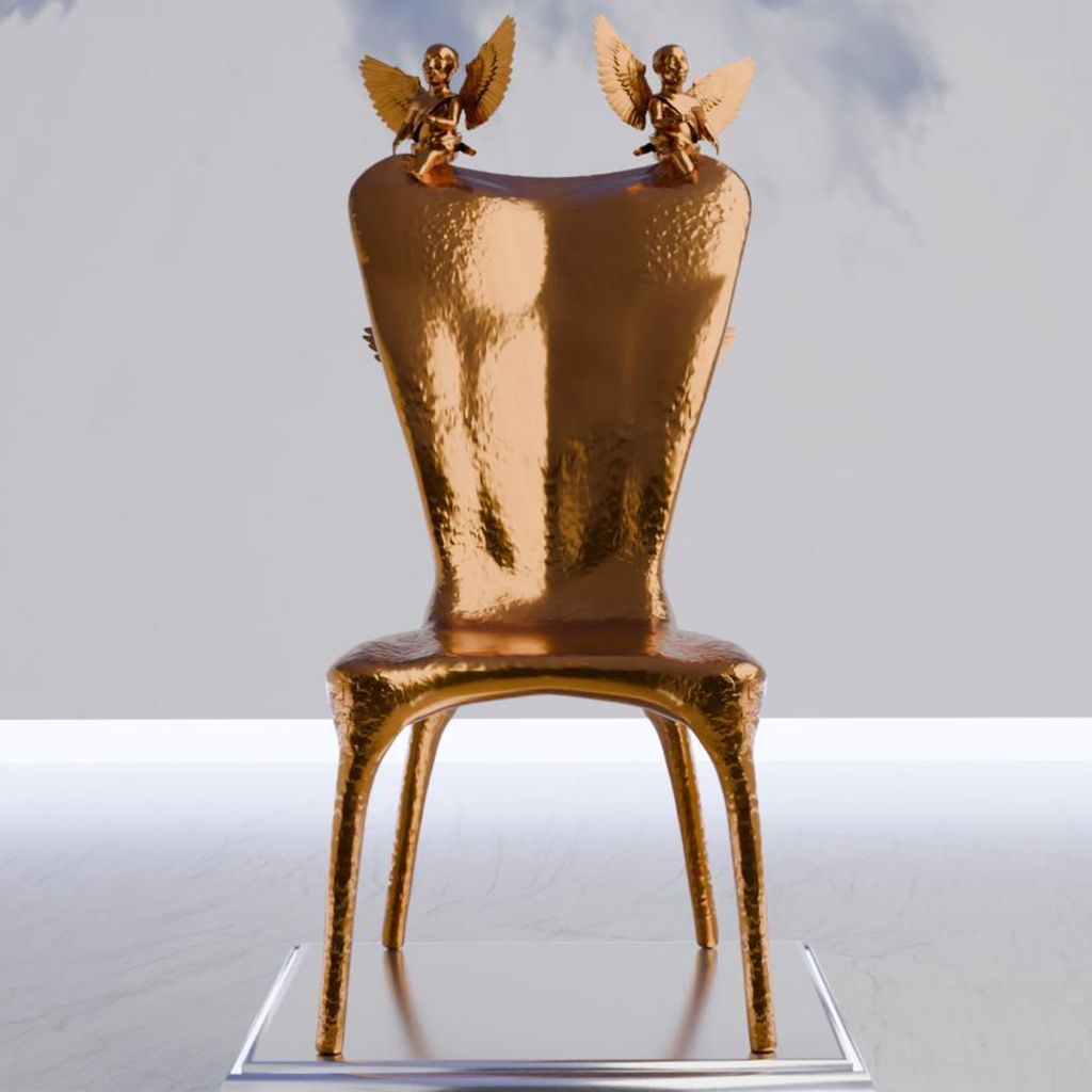 An experiential/furniture/art piece from Pharrell's Echoes series showed last winter in Curio Design Miami virally interacted by Gen Z and endorsed by pop star celebrity Rihanna, the chair is cast in bronze with a luminous supreme gold finish. More than a supreme design object, it is a meditative vessel of soulful furniture as the Shamekh says - an interactive symbol inviting reflection on intention, empowerment, and inner transformation.