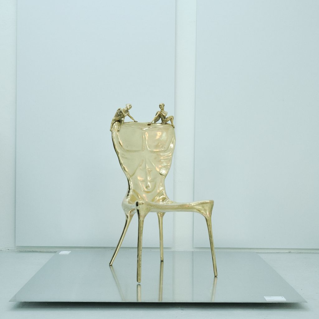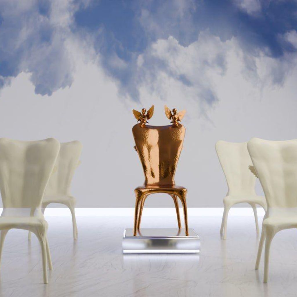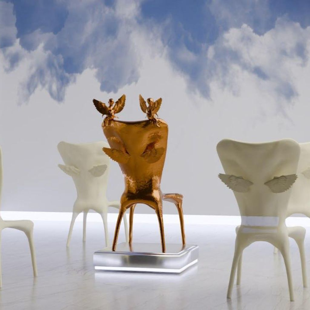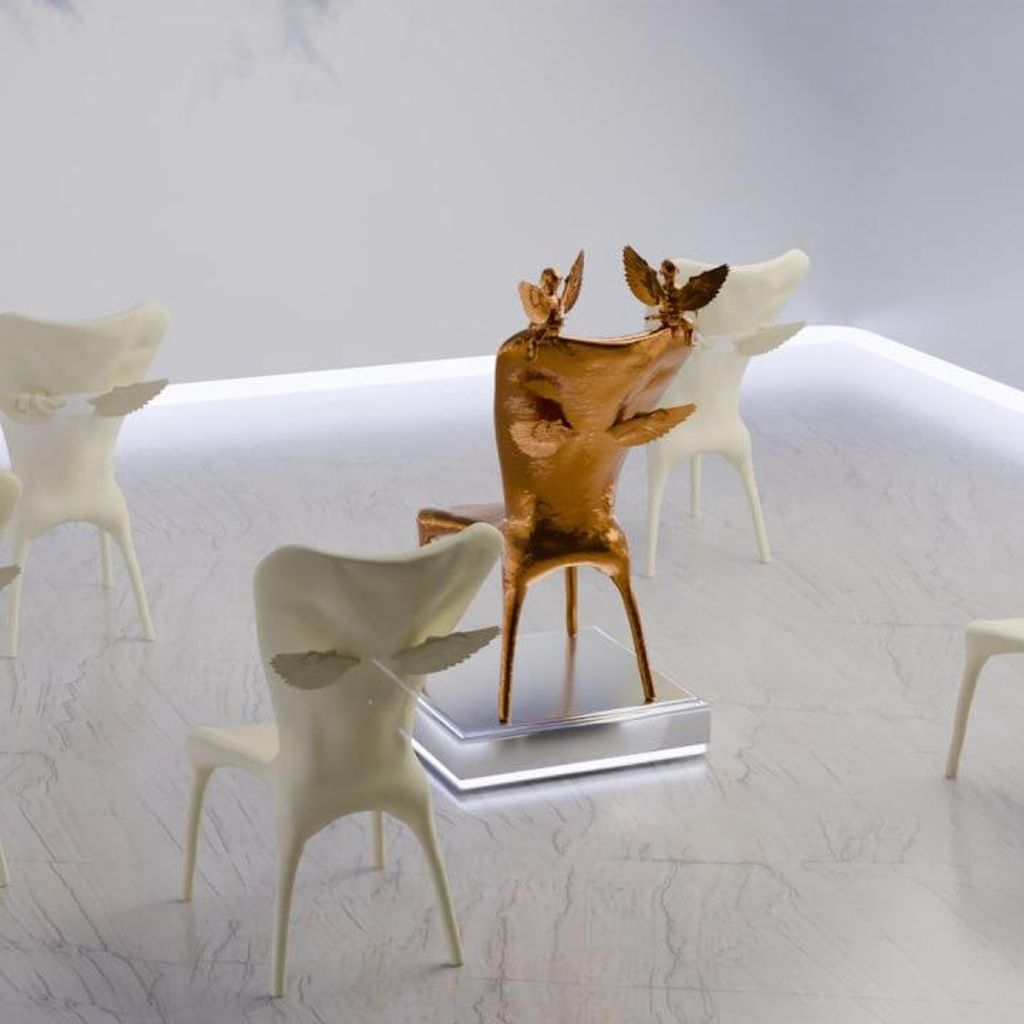 An experiential/furniture/art piece from Pharrell's Echoes series showed last winter in Curio Design Miami virally interacted by Gen Z and endorsed by pop star celebrity Rihanna, the chair is cast in bronze with a luminous supreme gold finish. More than a supreme design object, it is a meditative vessel of soulful furniture as the Shamekh says - an interactive symbol inviting reflection on intention, empowerment, and inner transformation.
