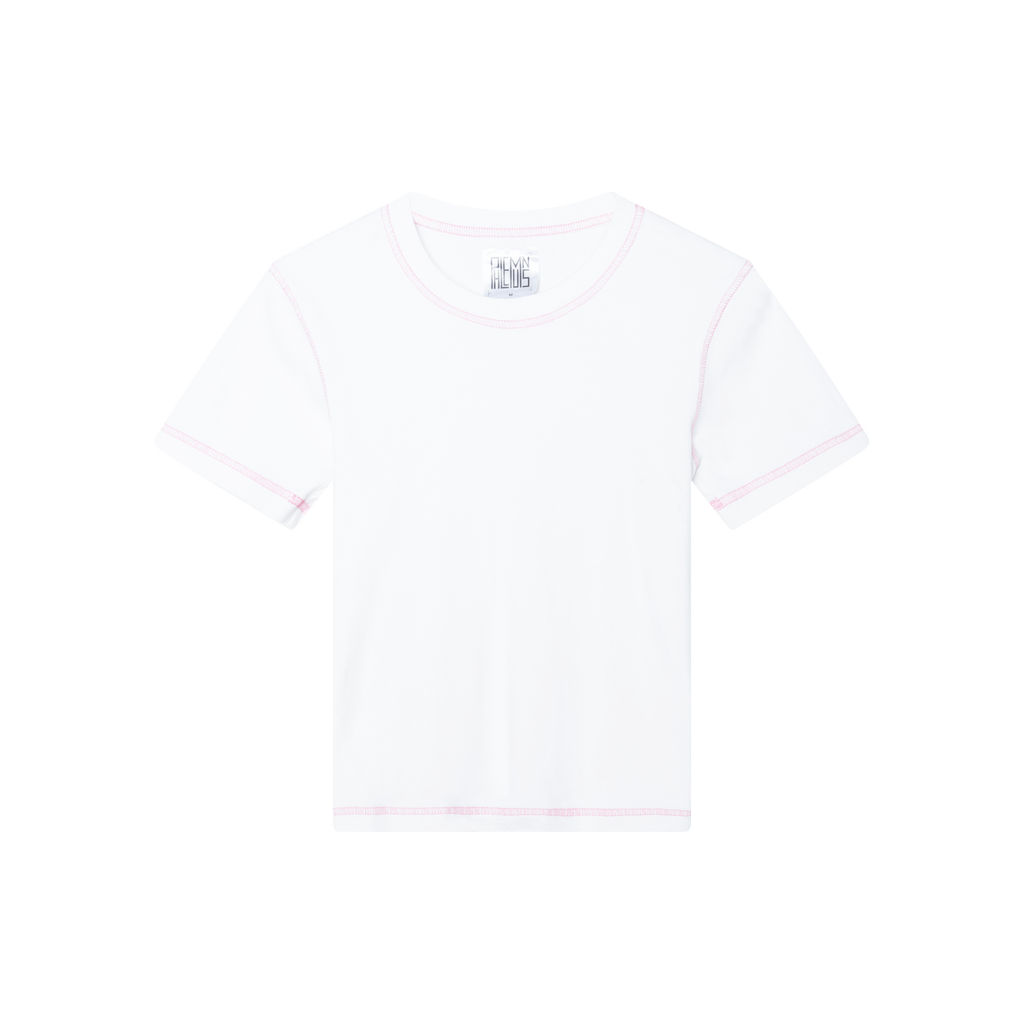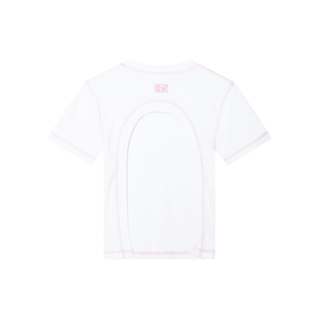 Phlemuns White Cotton Tee features rib knit crewneck, logo embroidered at back collar, cut out at back, and contrast stitching in pink.