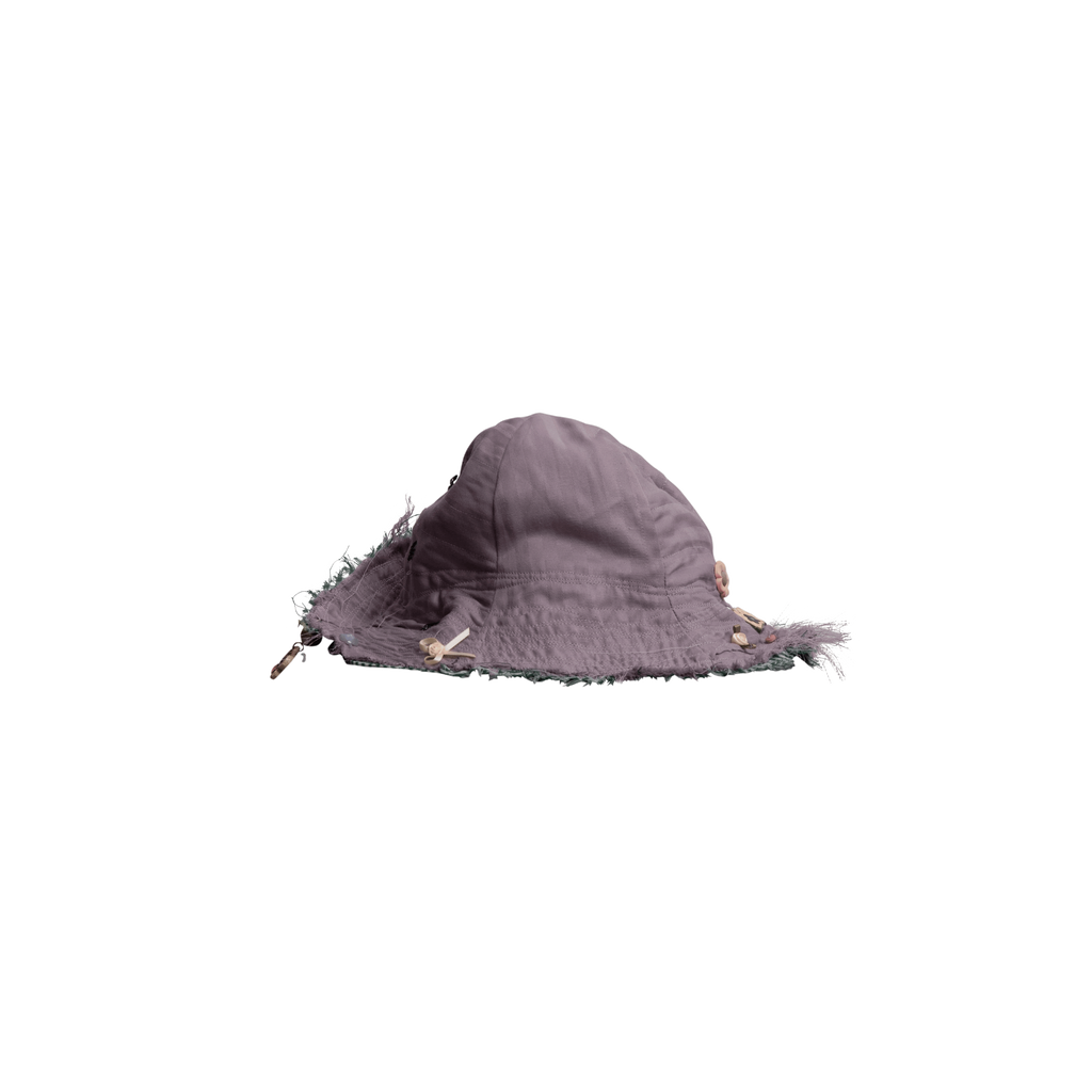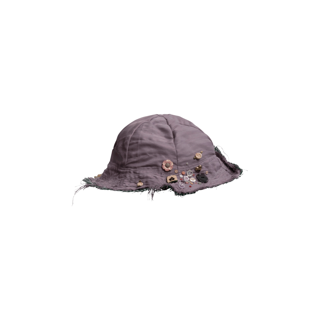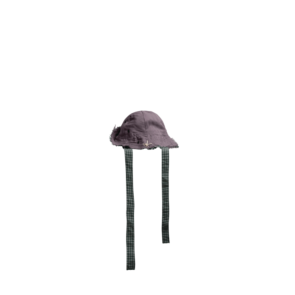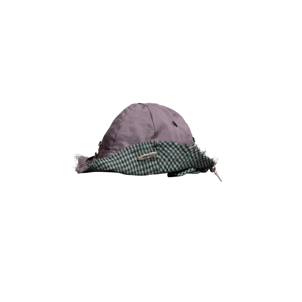 Lavender and green gingham bonnet with self-tie ribbons. Vintage ant beads crawl along an assortment of repurposed buttons and flower themed ceramic charms.