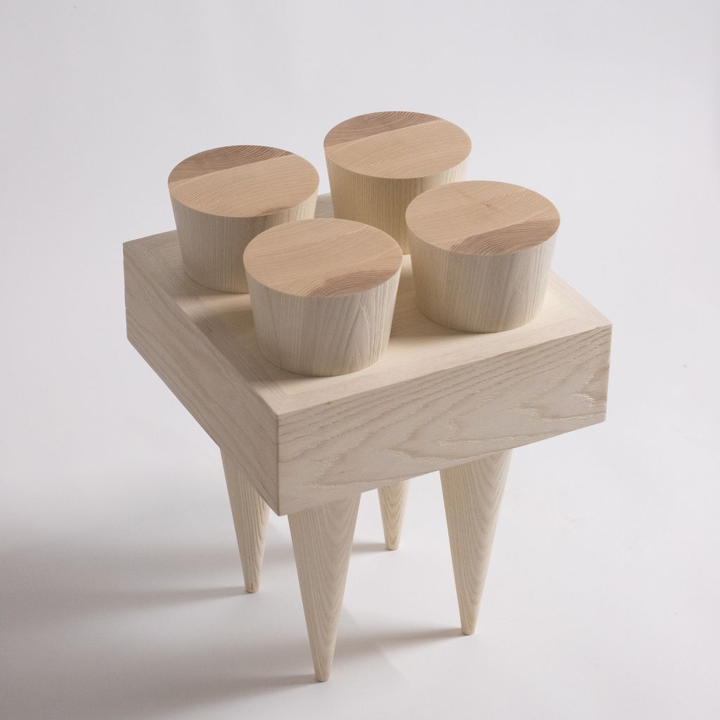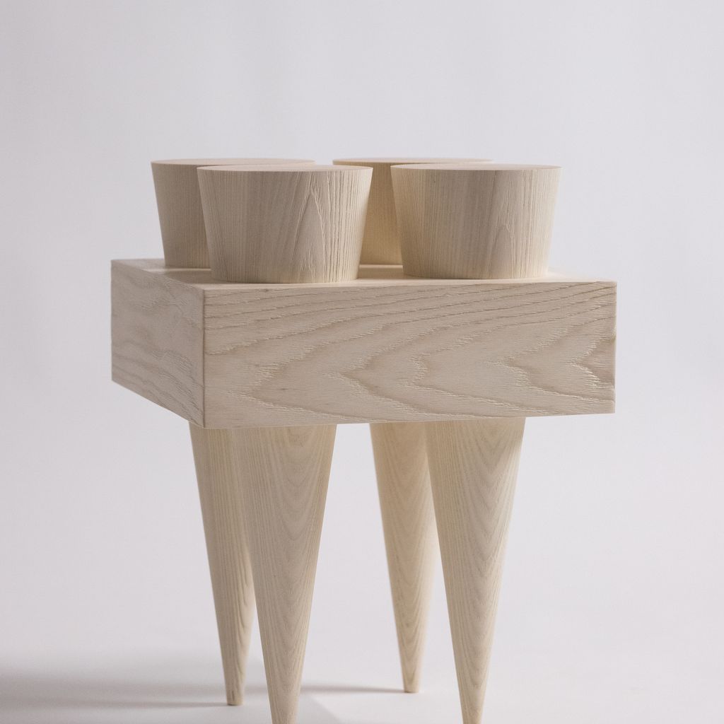 The Pierced Table highlights traditional roles of table-components, and forces a new perspective of what is required for an object to function as furniture. Each cone is hand turned on the lathe, and vertical surfaces are wire-brushed to reveal the texture of the wood.