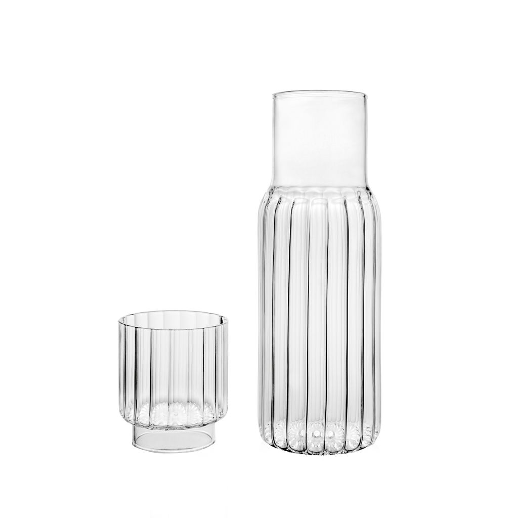 The sleek, architectural silhouette of the PILLAR carafe exudes a refined yet understated presence. Thoughtfully designed, the set includes a PILLAR tumbler that serves as a lid, making it a versatile addition to a nightstand or dining table.