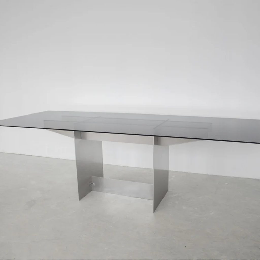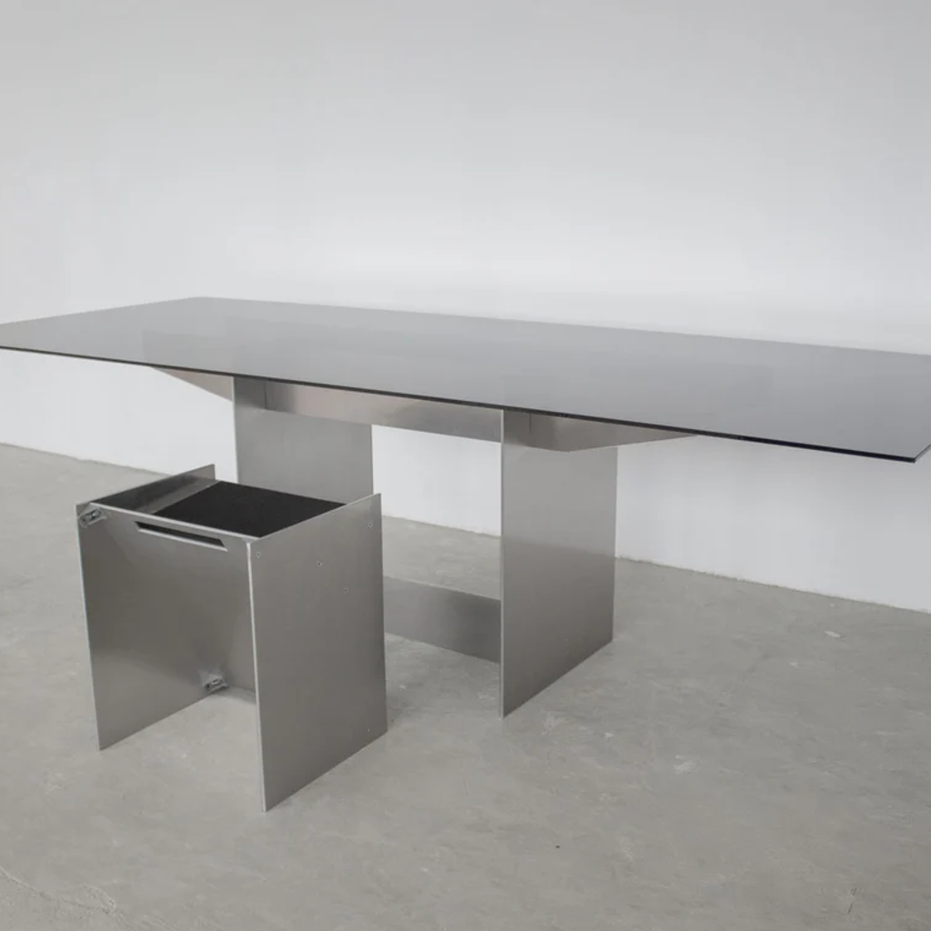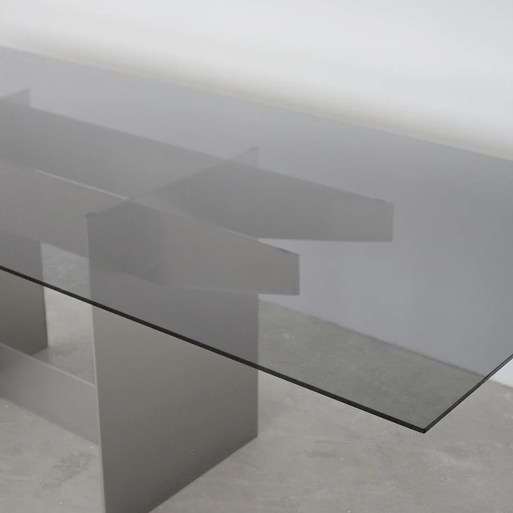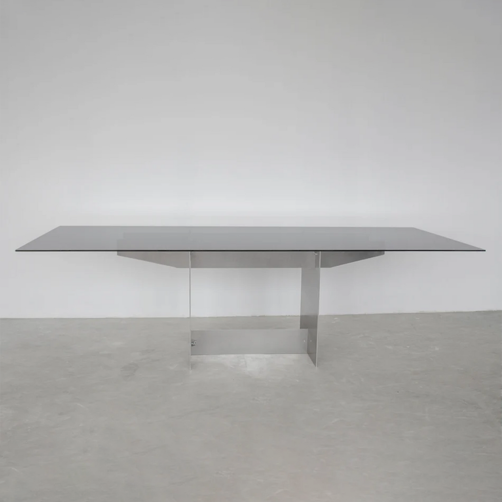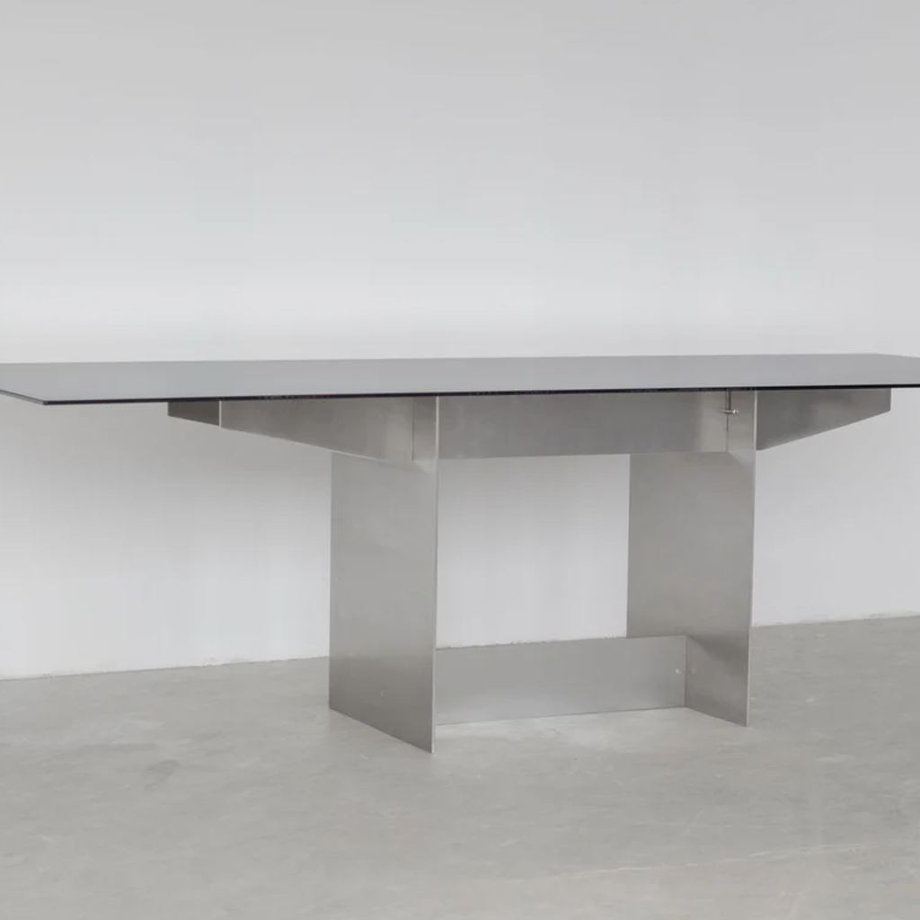 The Pillar table was designed by the artist Jakub Kubica in 2022. The table's base is made of a massive 6mm thick aluminum plate, and two pillars are connected with a vertical dry joint technique. The table top is made of strong, durable 5mm thick dark-toned glass. The table can accommodate up to 8 people and be used as a dining or office table. Produced in-house at our atelier near Berlin in very limited quantities.