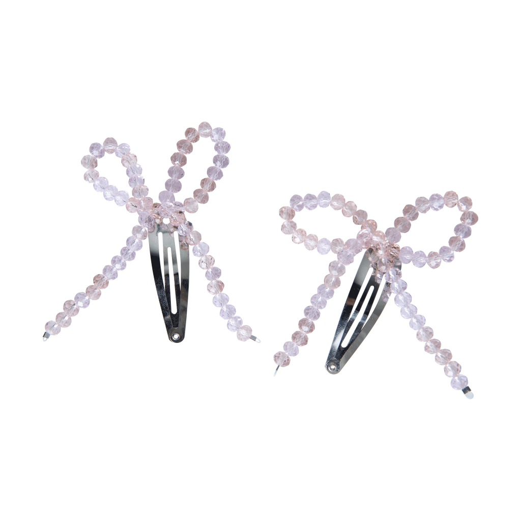 Pink Crystal Bow Clips features pink crystal beads and silver snap clips.