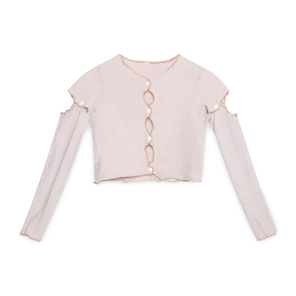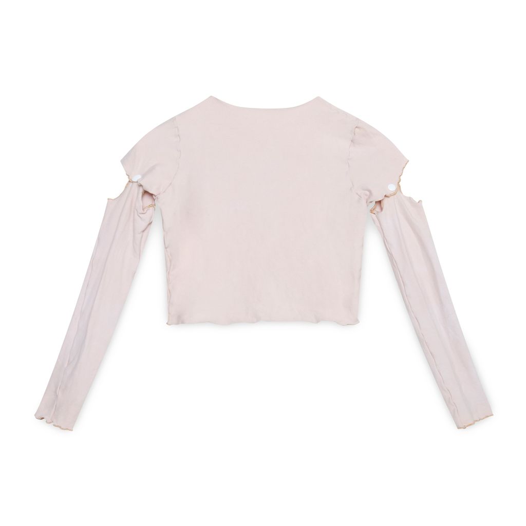 Pink Cutout Crop Top features brown contrast lettuce trim, snap button front closure, and detachable snap button sleeves.