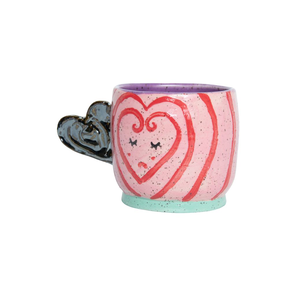 Metal Heart Mug - Pink features red heart design, pink outside, green trim, purple inside, with metal heart handle.