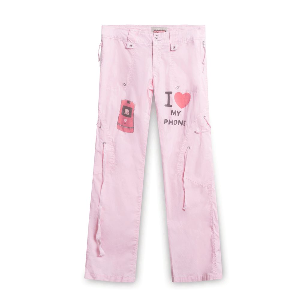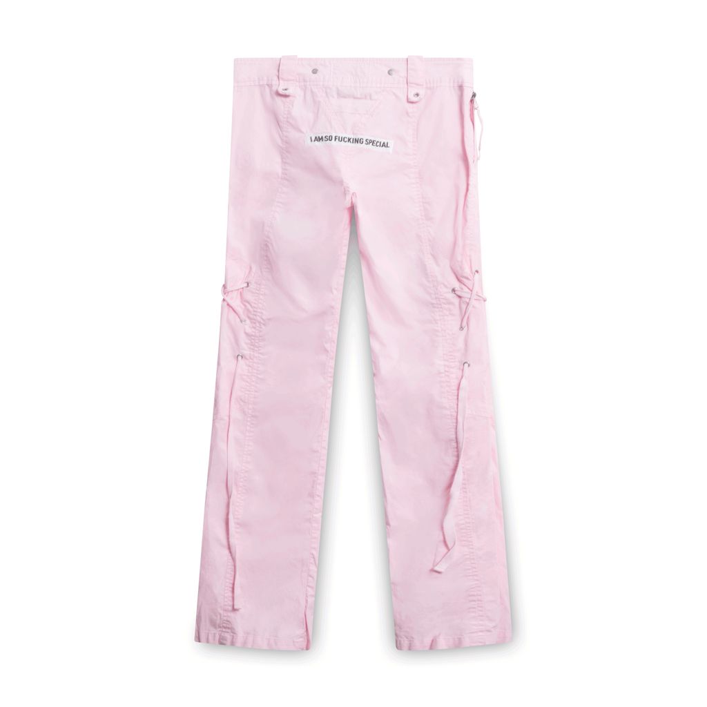 Pink cargo pants featuring "I <3 my Phone" text on the left leg, a pink Motorolla phone on the right leg, and the text "I am so fucking special" sewn on the back.