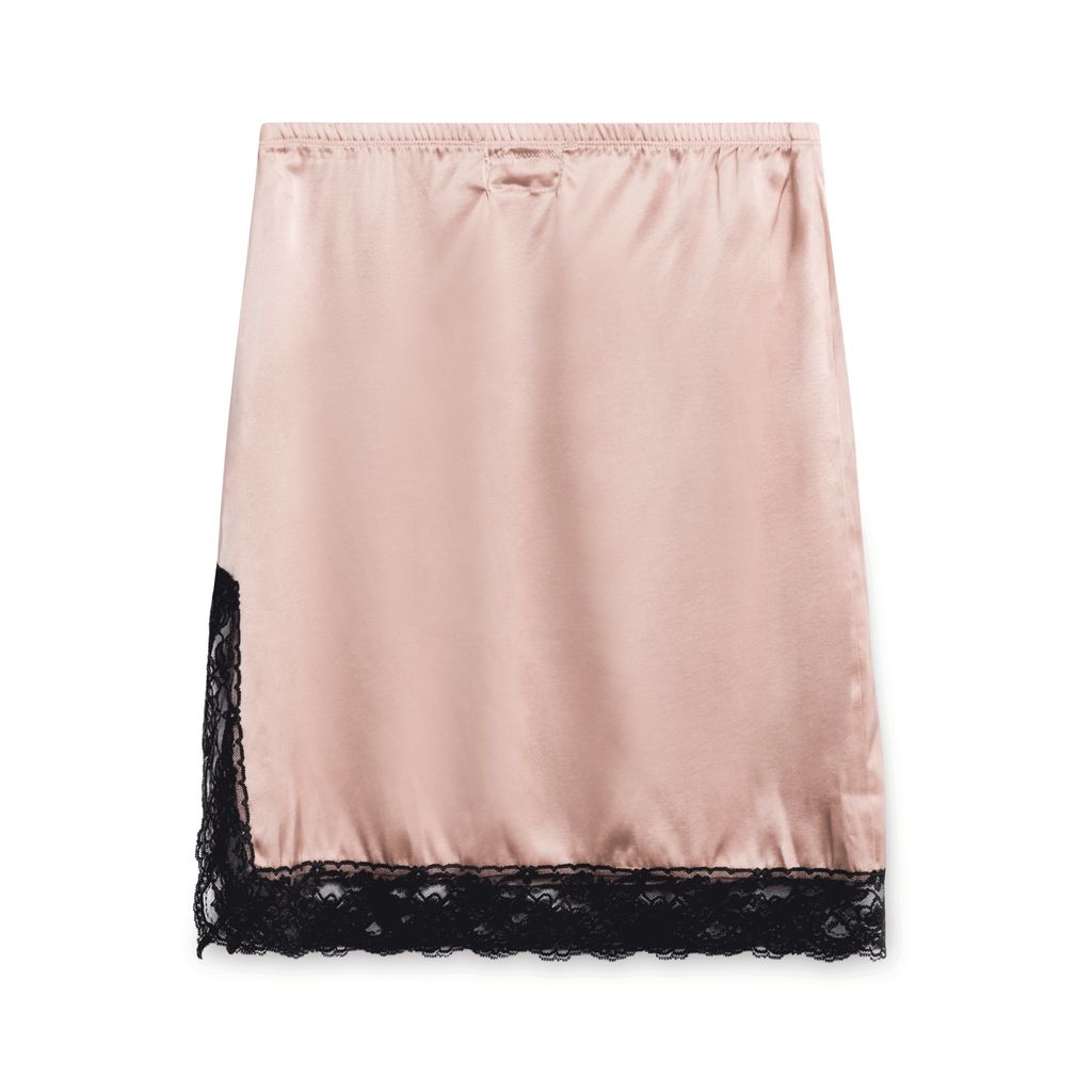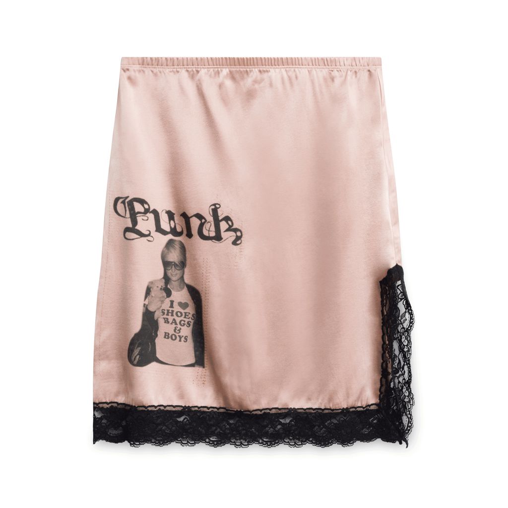 Soft and light pink skirt with an elastic waistband and black lace lining the bottom and left slit of the skirt. A stylized print of Paris Hilton and the text "PUNK" is also featured at the left leg.