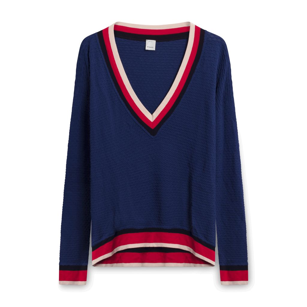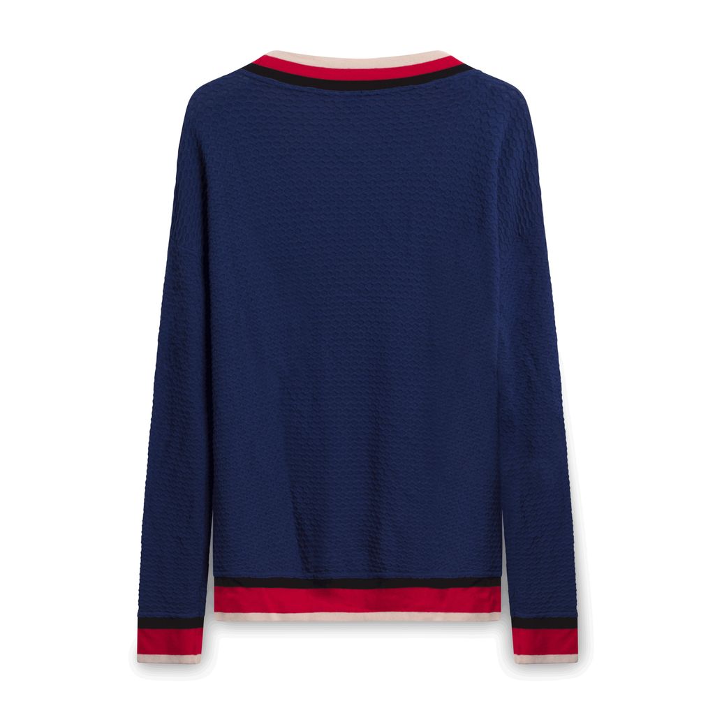 Navy based knit sweater with a ribbed circular pattern. The sweater and sleeve bases along with the collar all feature a pink, red, and black striped pattern.