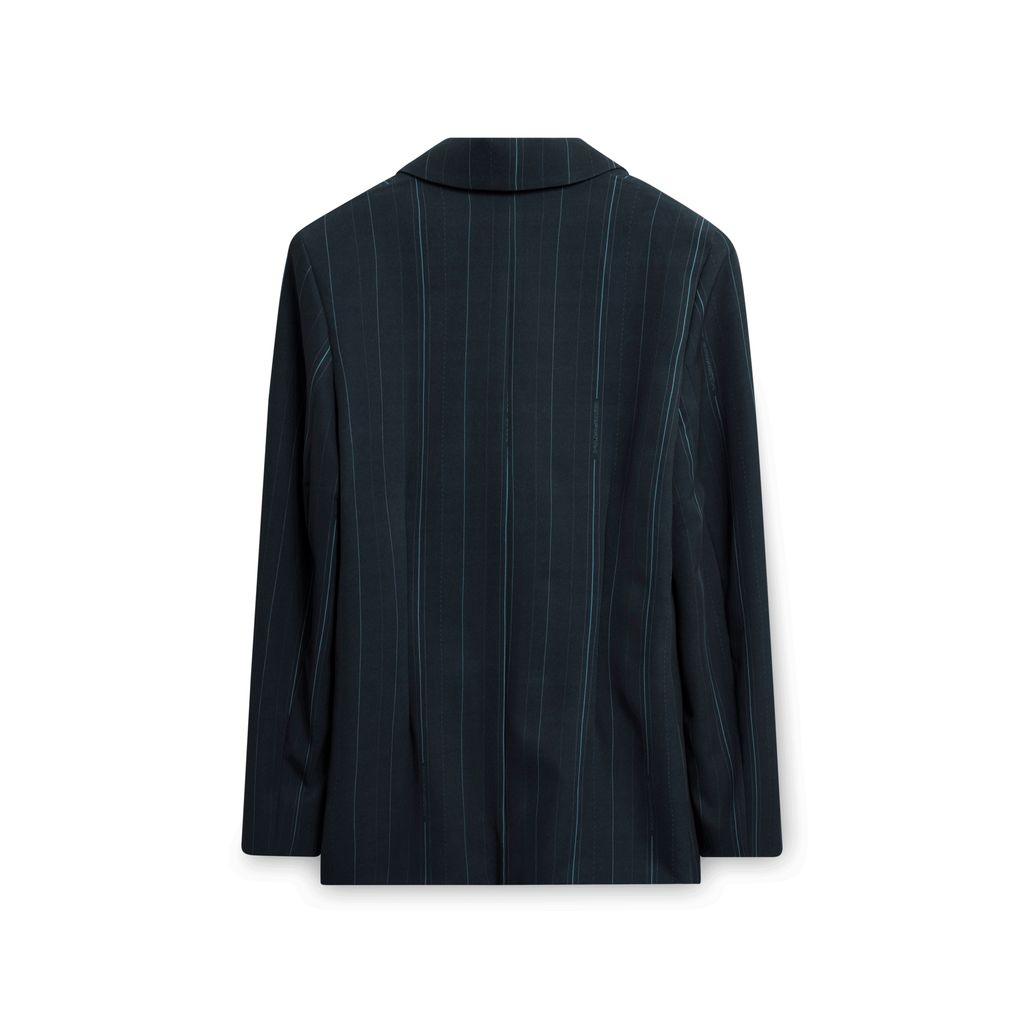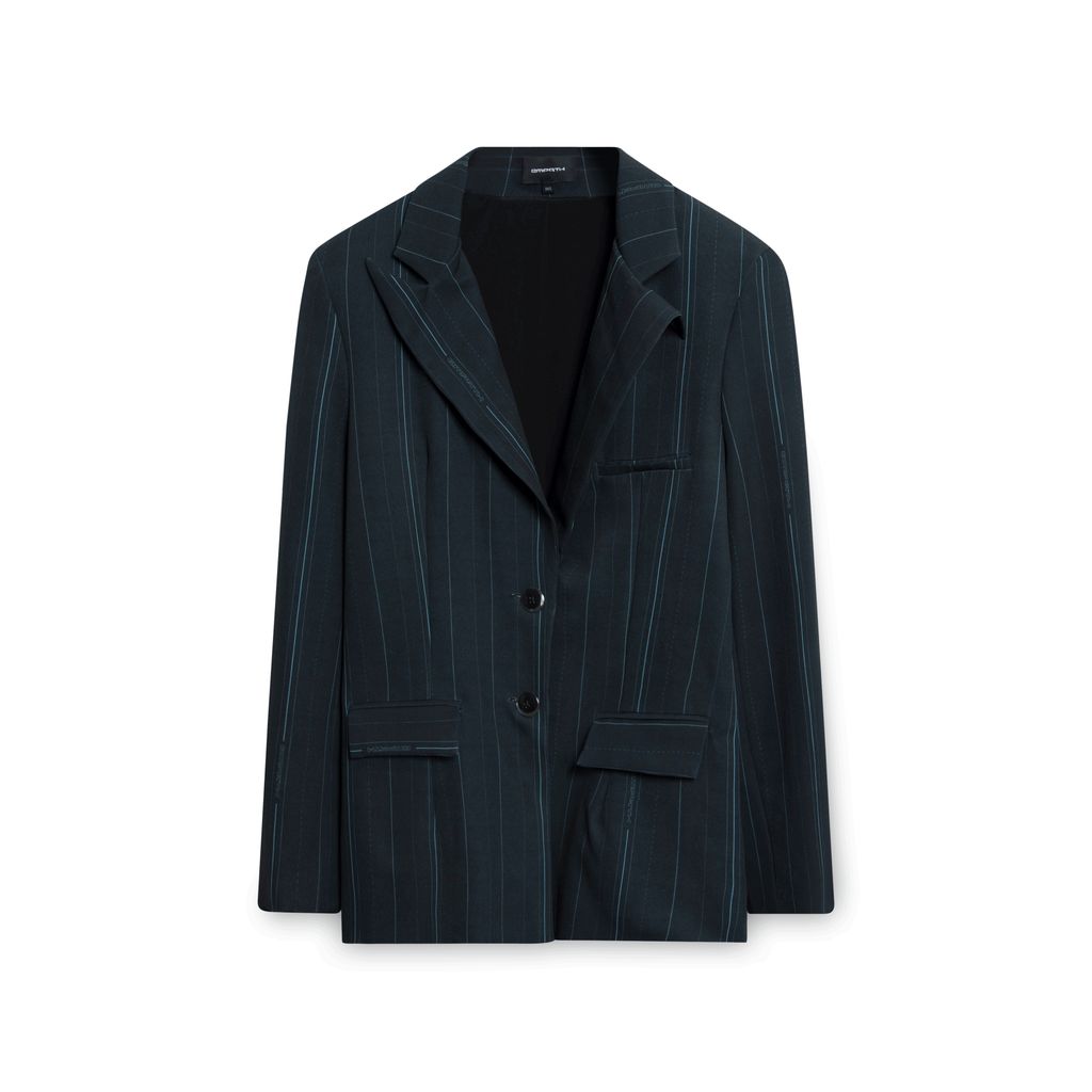 Details include shoulder pads, breast pocket and side welt pockets, black pearl buttons, and the EMPATH logo subtly hidden throughout the pinstripe. Pair it with the matching pinstripe pants or over a mini skirt with some knee-high boots.