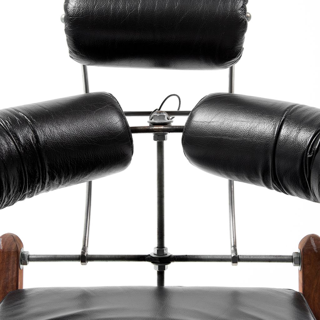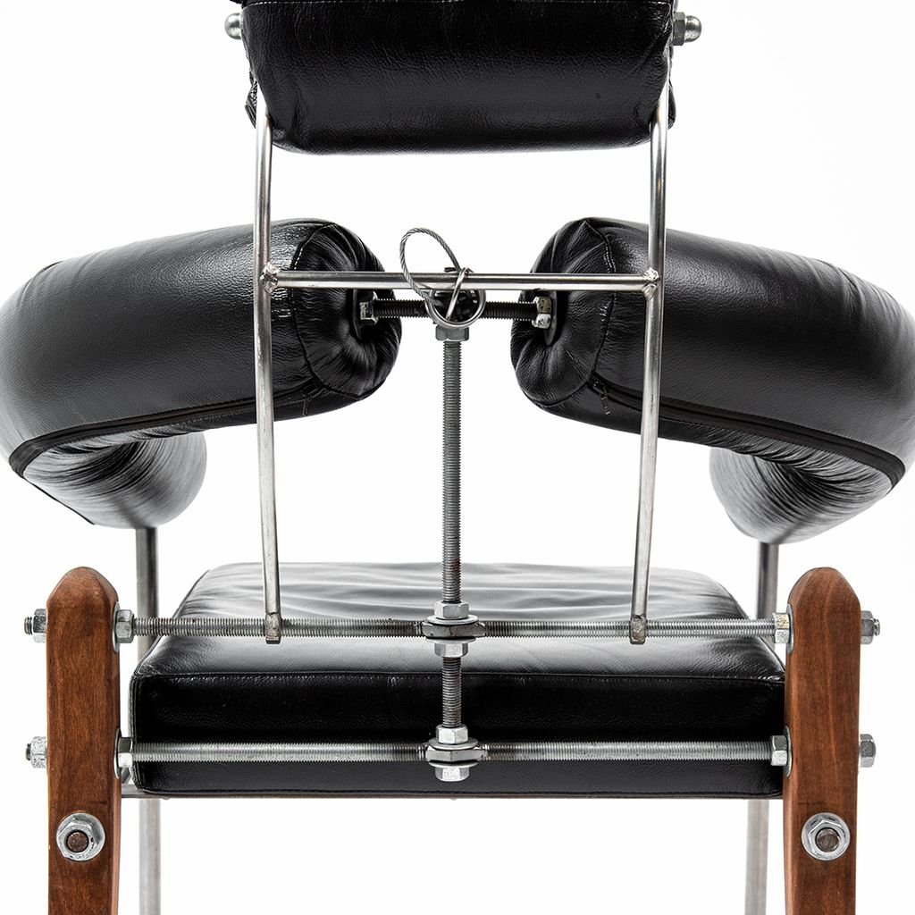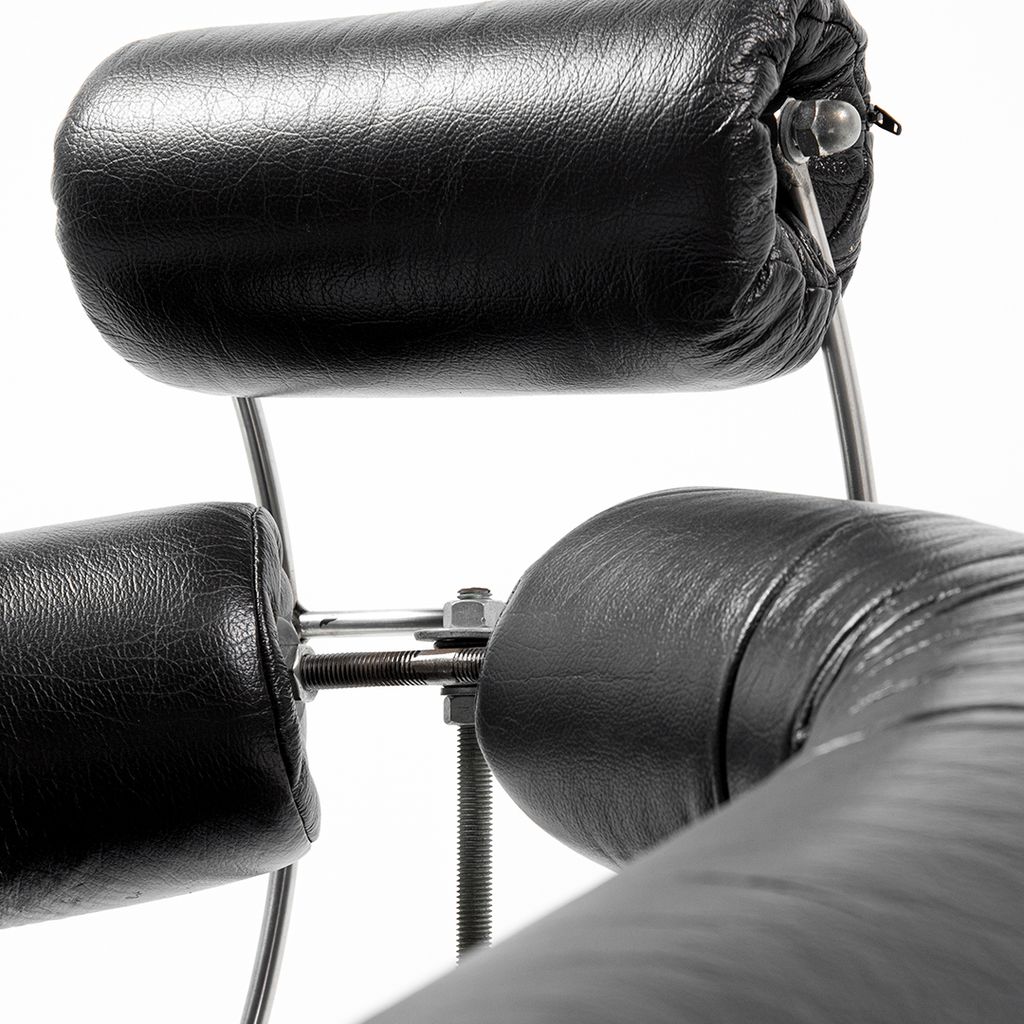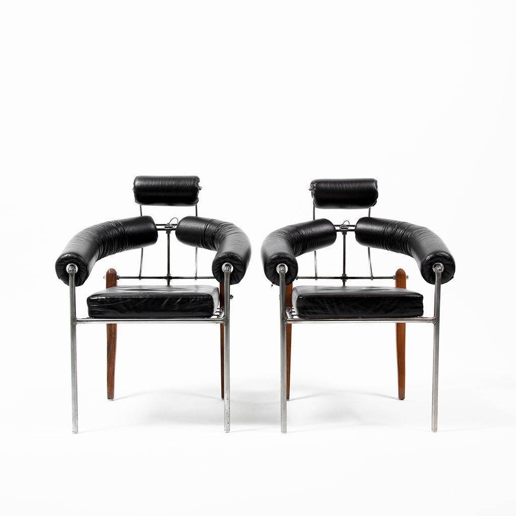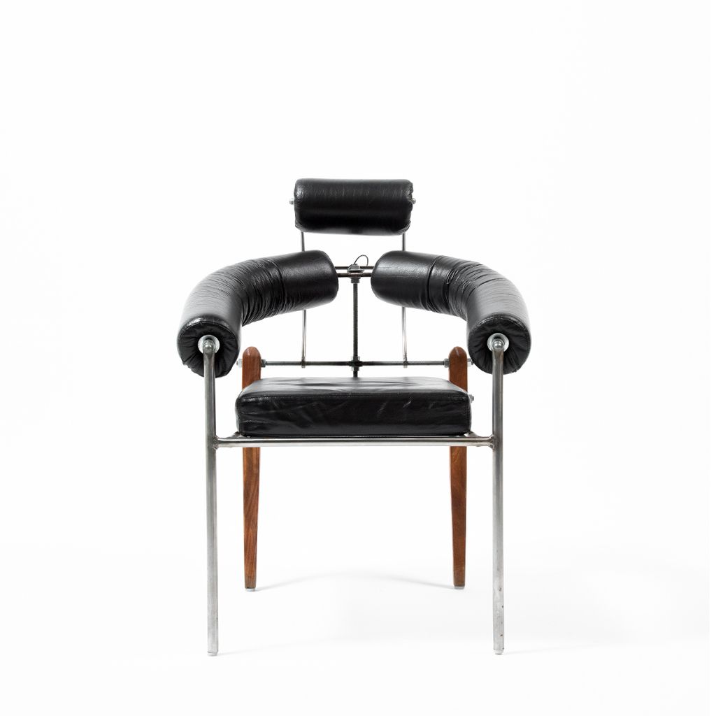 The Pirmin Chair is designed by Heinz Julen and hand crafted in Zermatt from stainless steel, wood, and leather. An extremely comfortable armchair for the dining room, sitting room or office.