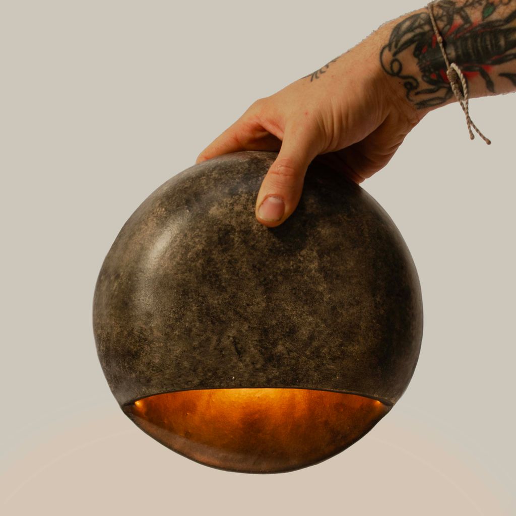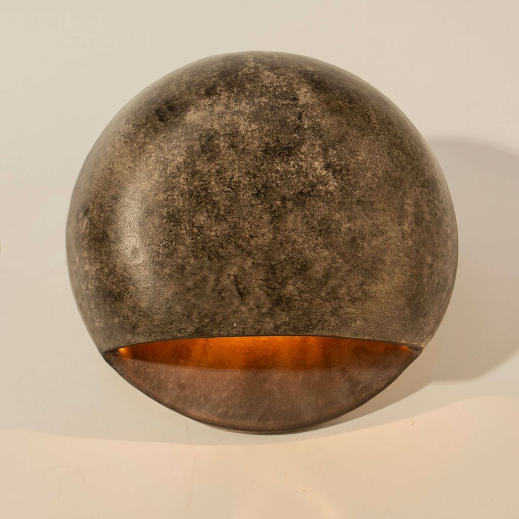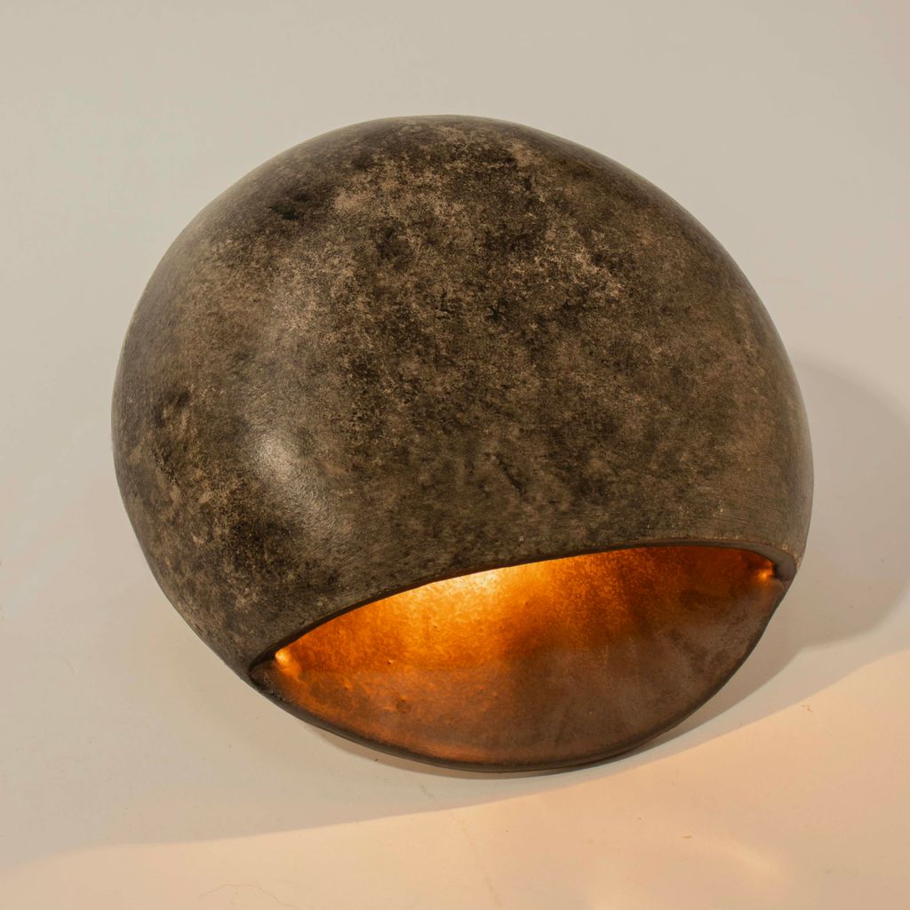 The Pita Sconce is flattened spherical shape, resembling a smooth, rounded stone. The lower portion of the sphere is sliced open to create a wide, crescent-shaped opening that directs the light downward and acts as a window into the golden interior. The exterior of the piece is hand-painted with acrylic paints to achieve the rugged, stone texture with a vividly contrasting interior that amplifies the light. The light source is housed inside the pocket—When illuminated, the design directs the light in a controlled manner, casting a soft, focused beam that enhances the surrounding space without being overpowering.