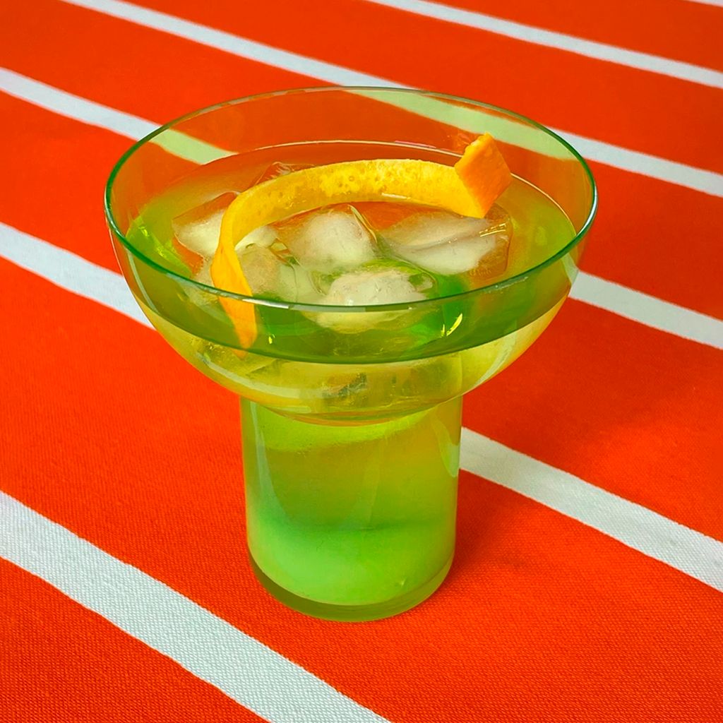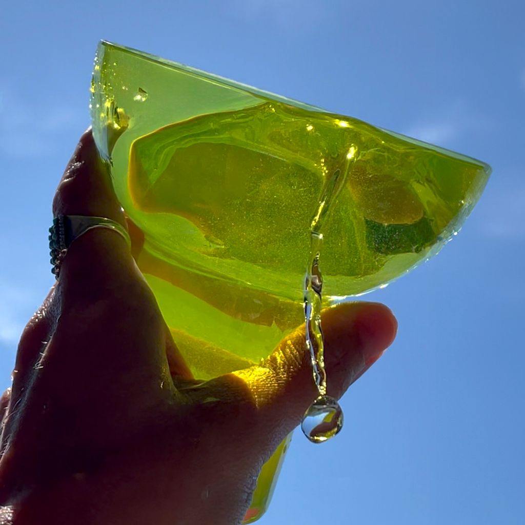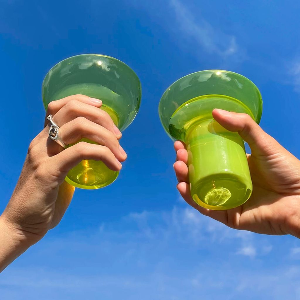 Mouth-blown, crater-shaped glassware blending retro vibes with contemporary flair. A vibrant hoppy green, that invites the sun to dance and reflect. Adding a touch of elegance and charm to every sip.Cheers to joyful moments with PLASH Glass.