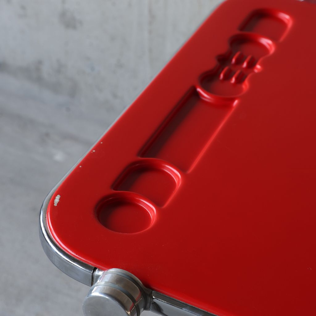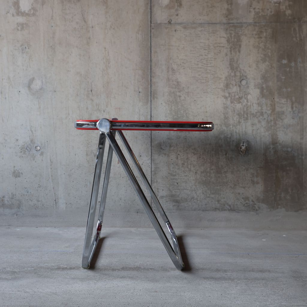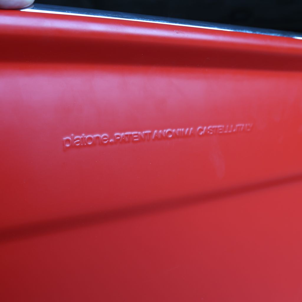 Platone Folding Table by Giancarlo Piretti for Castelli, 1970s in red. This item is in good condition with normal vintage wear to surface and some discoloration and minor marks from age.