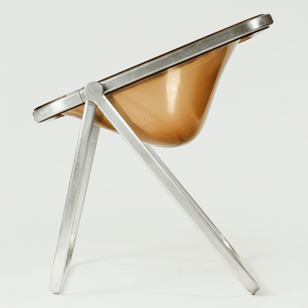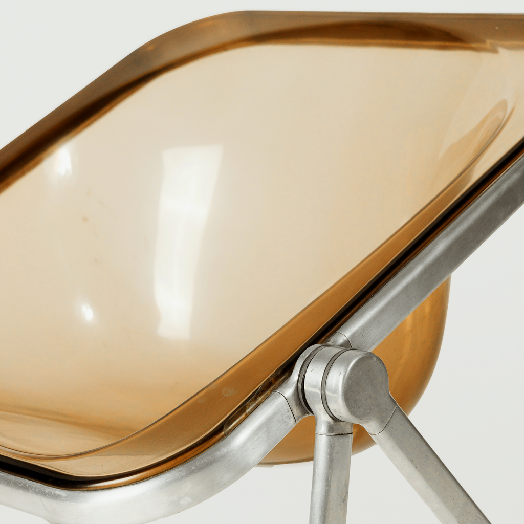 Lauded as an icon of space age furniture, Piretti's elegant curved design balances aesthetics with utility. The smoked umber lucite seat is supported by a foldable aluminum base, allowing the user to stack one on top another or collapse the chair for storage. The original 1969 production for Italian manufacturer Castelli, such as the vintage model above, sits in MoMA's permanent collection. Production Year: 1969 Dimensions: 68 cm W x 60 cm D x 75 cm H Weight: 7kg Condition: Common vintage wear with light scratches and marks