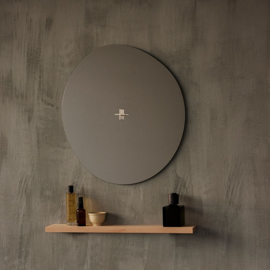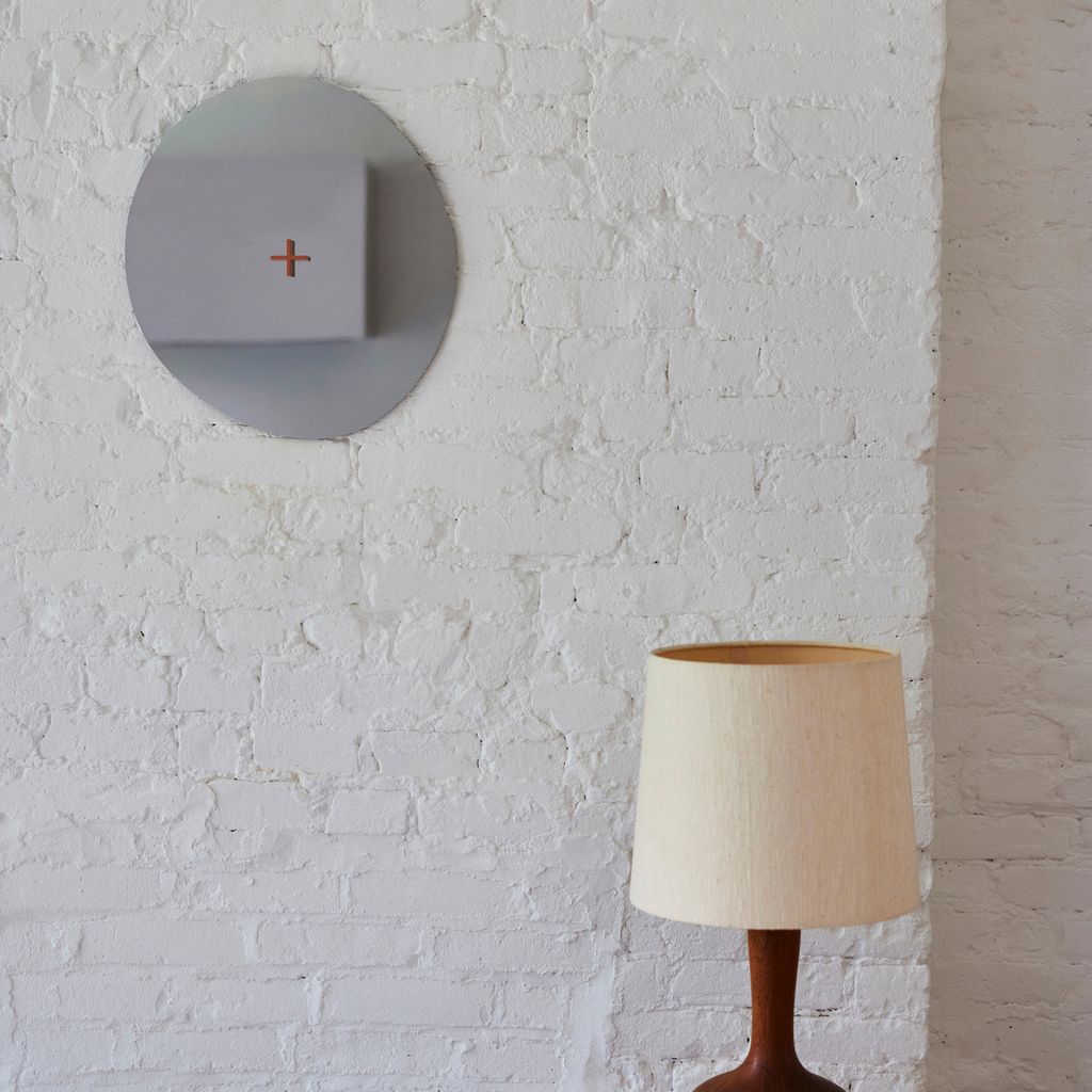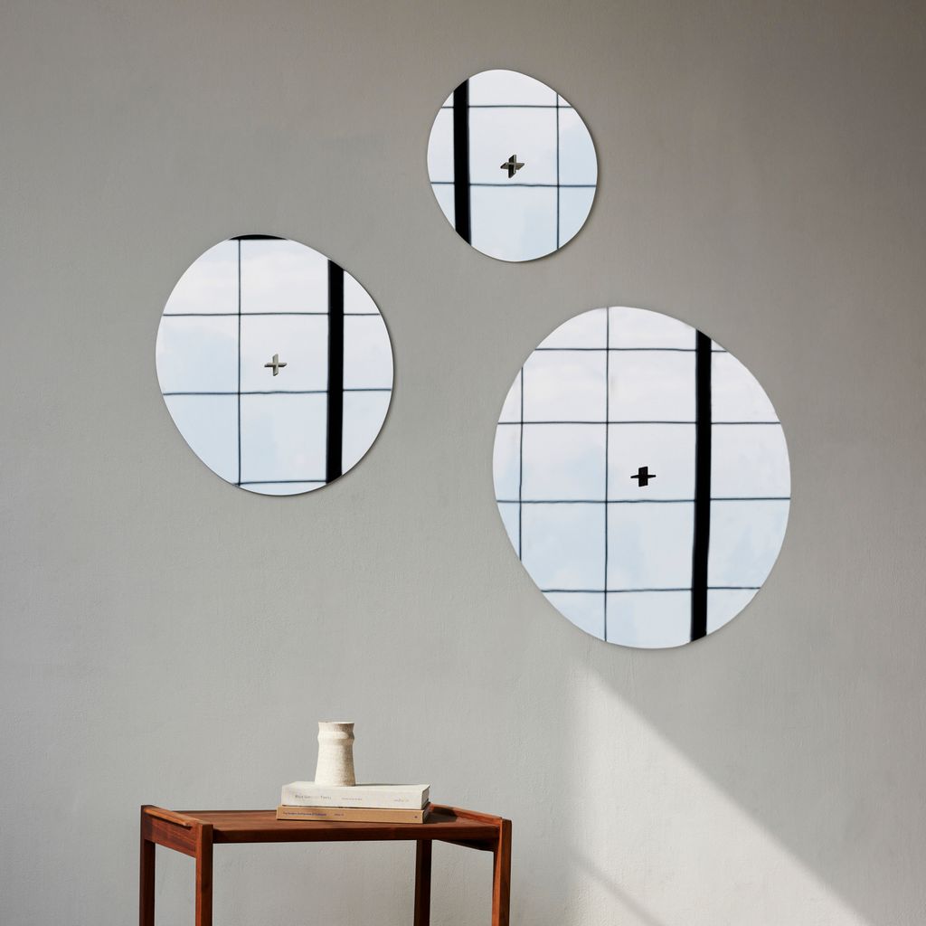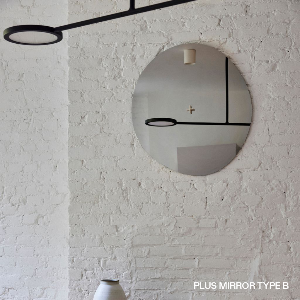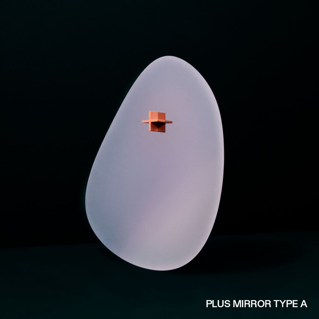 Plus Mirrors are frameless, float away from the wall, and are supported by plus-shaped brackets located along their vertical centers. The mirrors are available in two shapes: Type A (oblong) and Type B (circular). Each shape is available in three sizes. The plus-shape brackets for all of the mirrors are available in four colors as well as hand-polished aluminum.