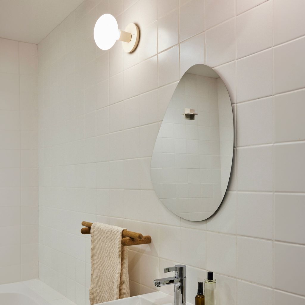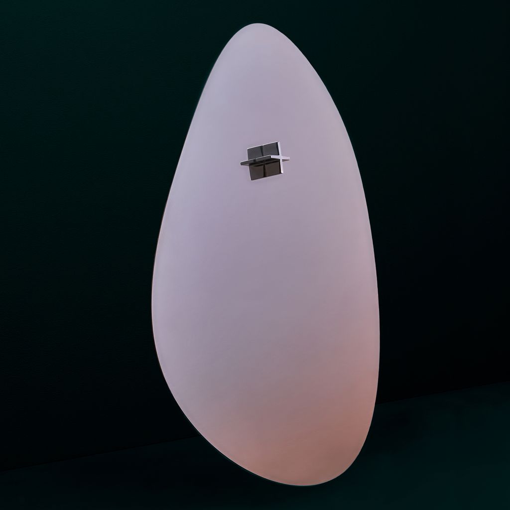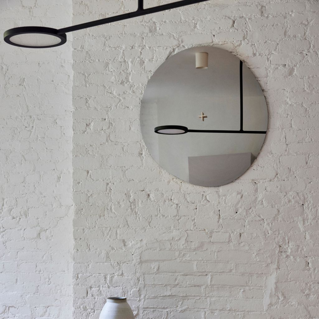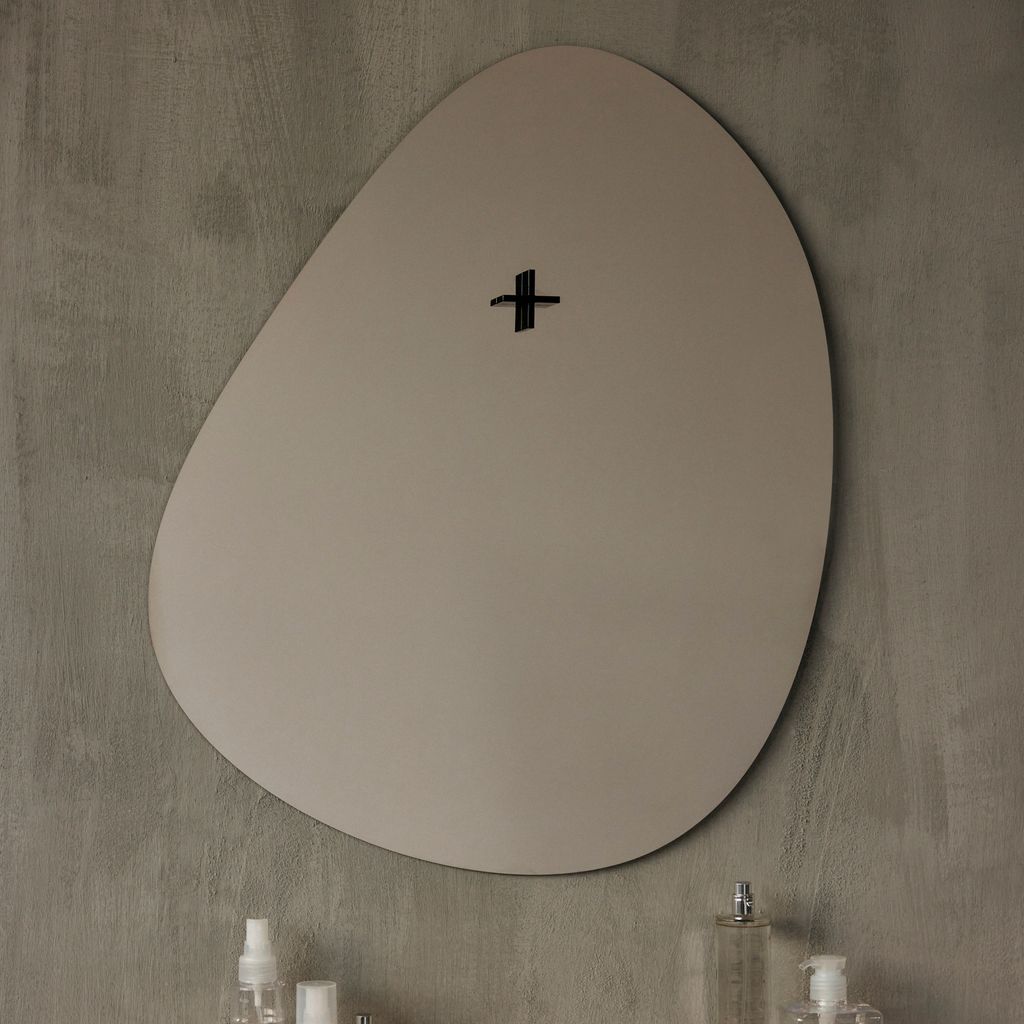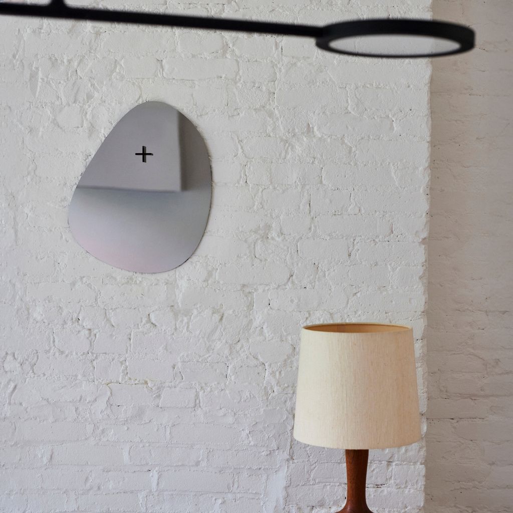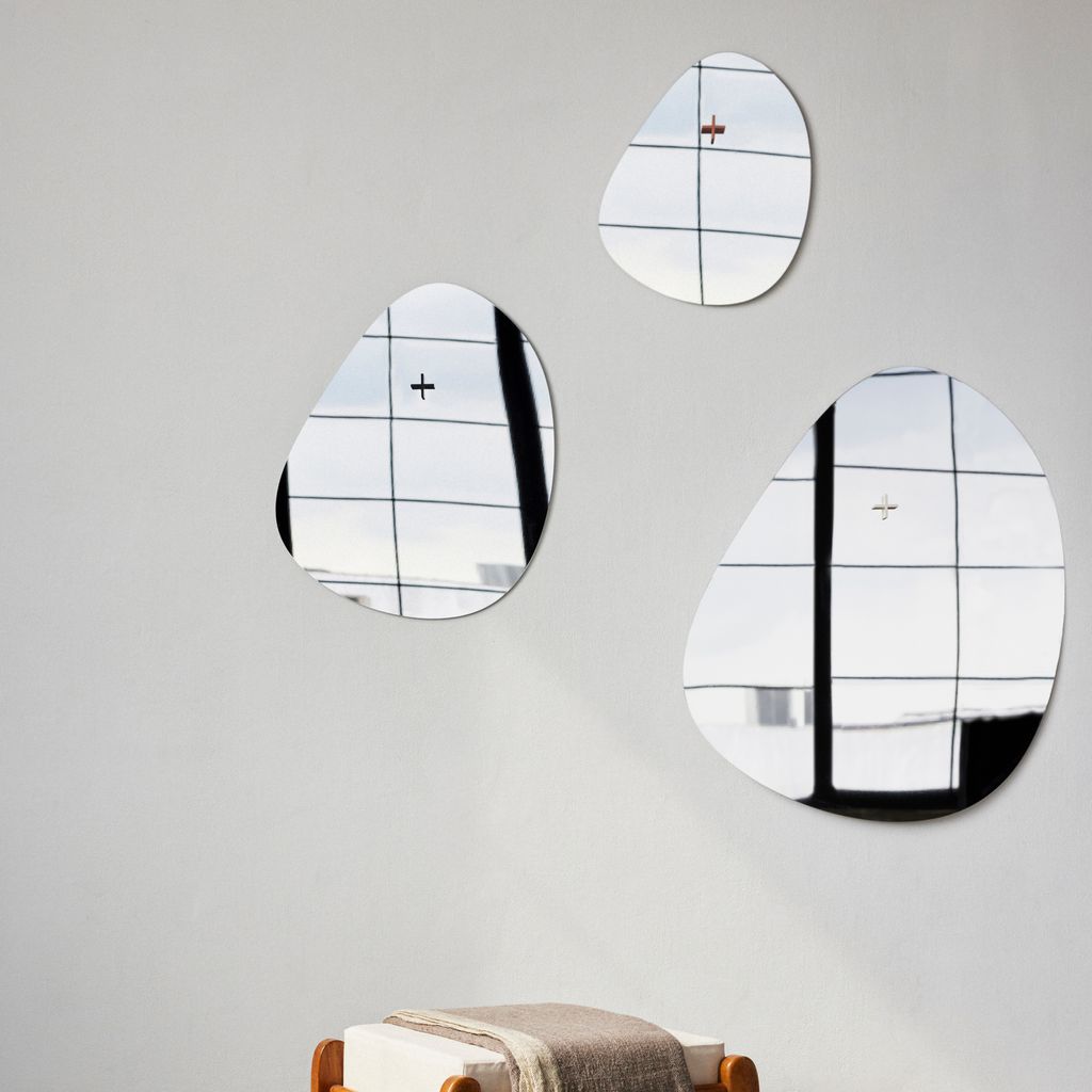 Plus Mirrors are frameless, float away from the wall, and are supported by plus-shaped brackets located along their vertical centers. The mirrors are available in two shapes: Type A (oblong) and Type B (circular). Each shape is available in three sizes. The plus-shape brackets for all of the mirrors are available in four colors as well as hand-polished aluminum.