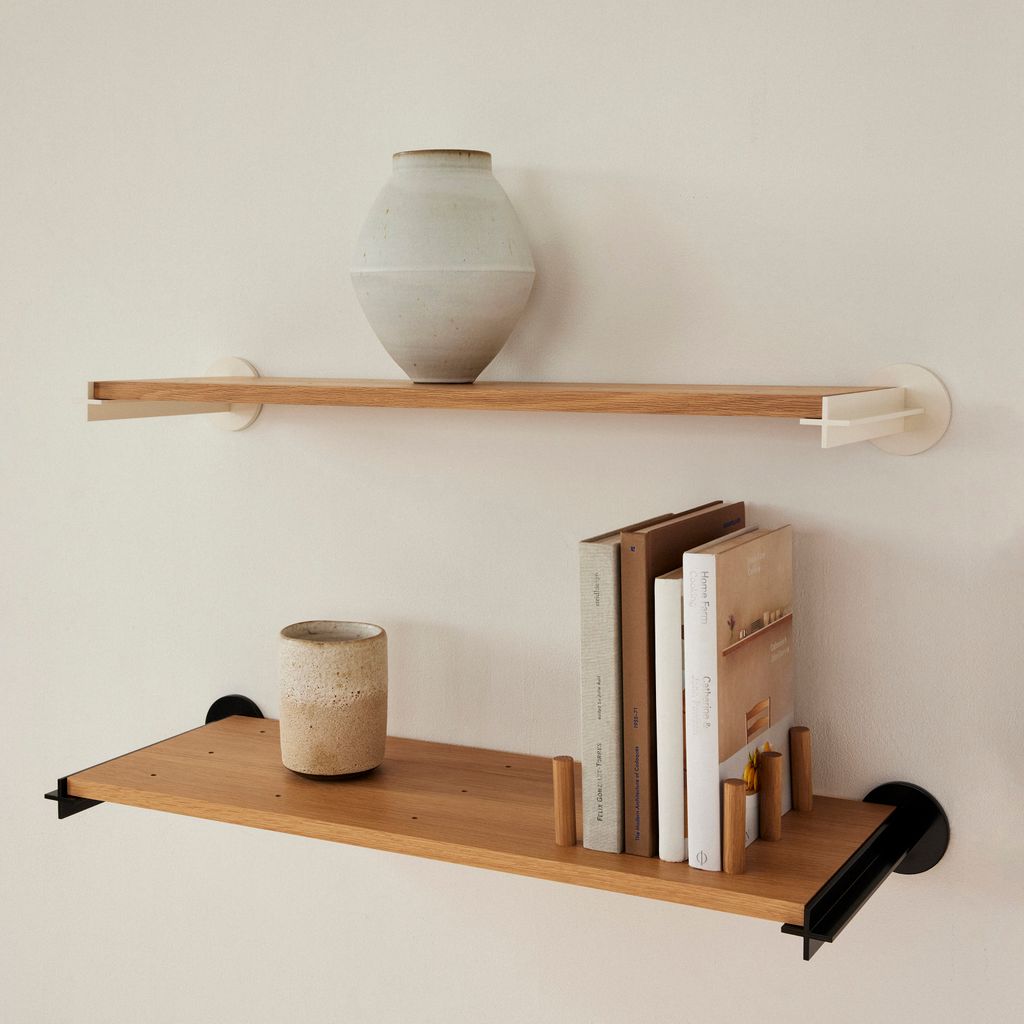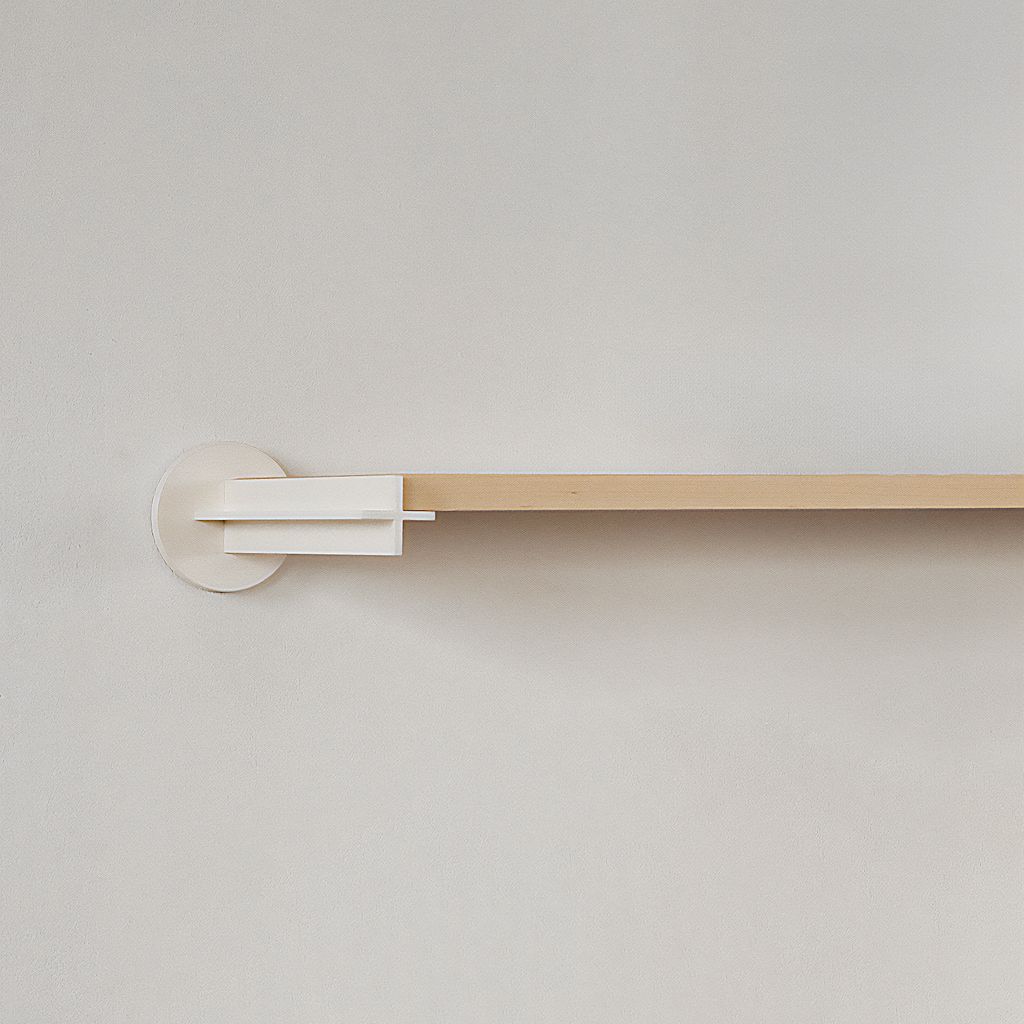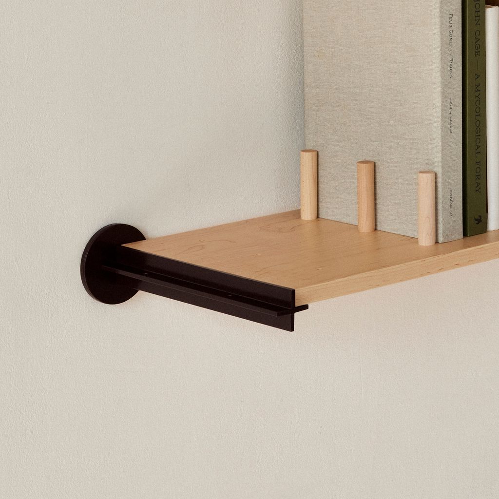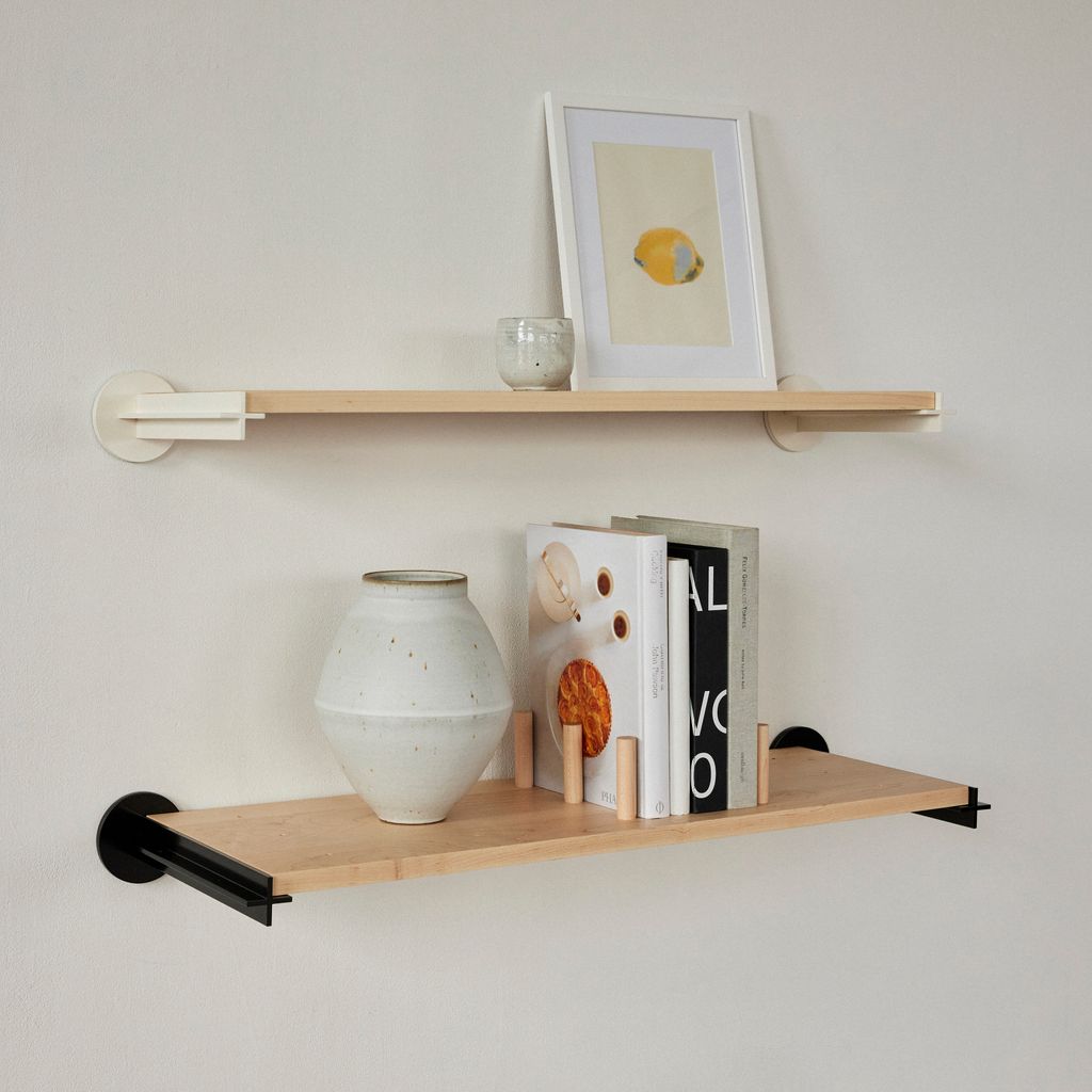 Plus Shelves are designed for both storage and display. They can be used for everyday items, like cookbooks and records, or as a platform for art and other important objects. Install them individually or in series - long runs are particularly beautiful! The shelves are available in either solid Hard Maple or White Oak, with matching round pegs. The pegs can be fitted through regularly-spaced holes in the shelf board surface to keep books and other objects upright.