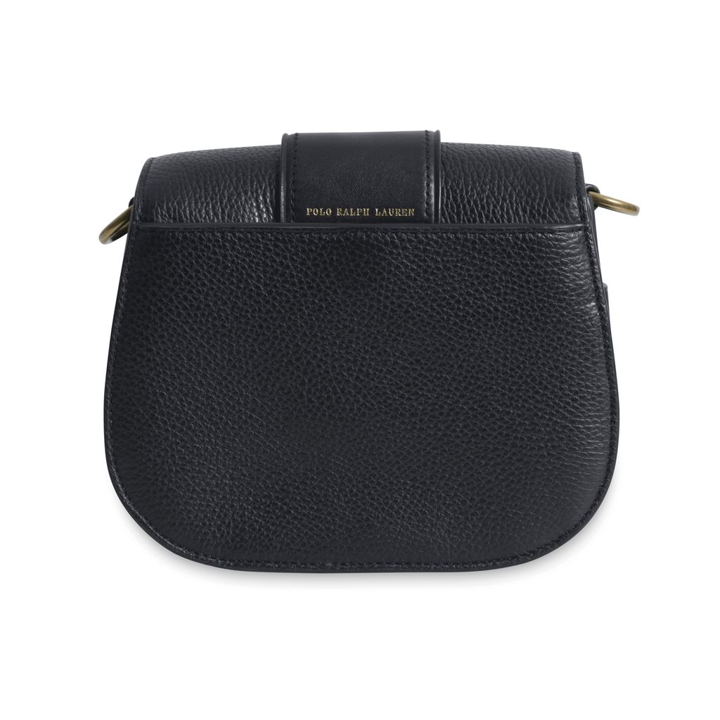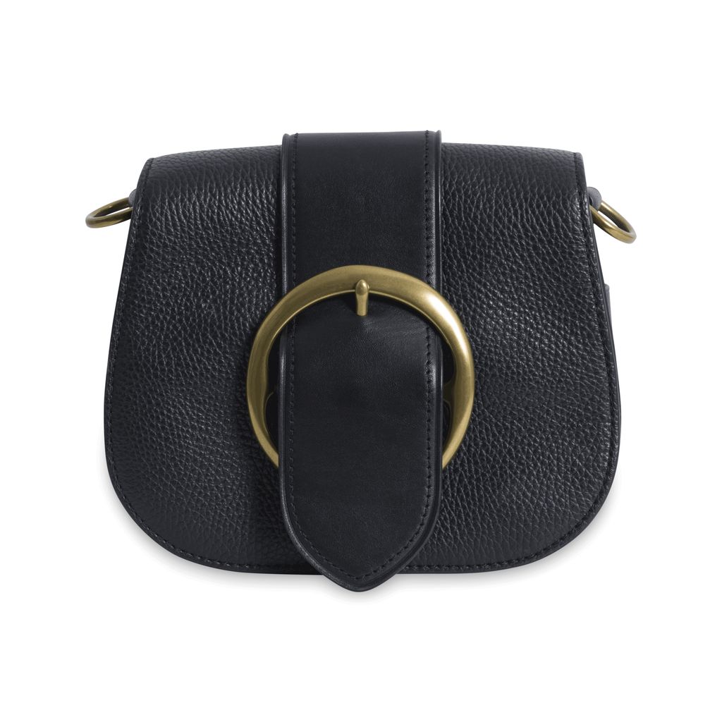 Black circle top purse with a decorative golden buckle. Purse is enclosed with a clasp, and features one large pocket and a smaller secondary internal pocket.