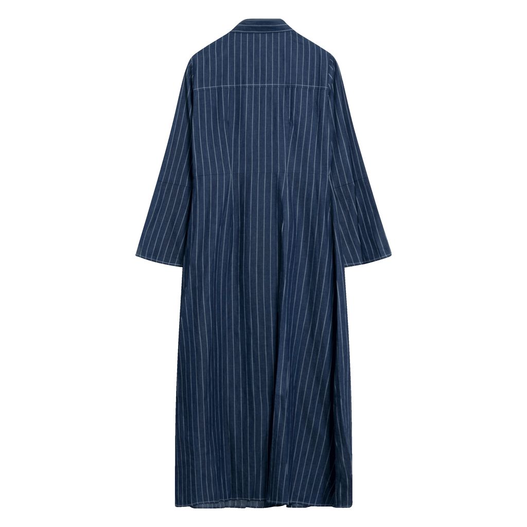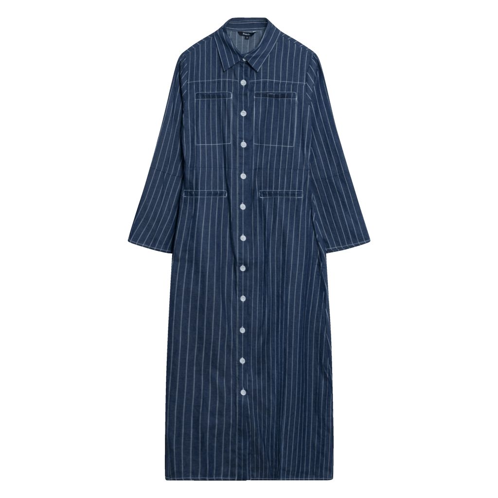 Structured for effortless daytime glam, this pinstriped maxi from Pomelo will have you looking sharp. Features all over contrast pinstripe design, full button down front, set of decorative pockets on chest, welt style pockets at waist, and wide lapels for collar.