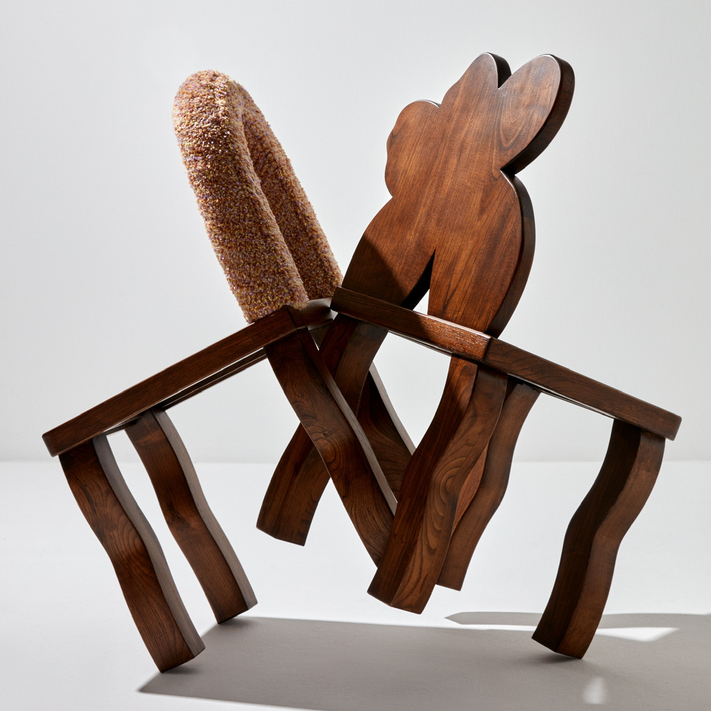 Poppy Chair's dark green tone was chosen to be in harmony with The Honey Chair and to be a color reminiscent of the earth. Crafted from oak wood, it features a distinctive flower design on the back.