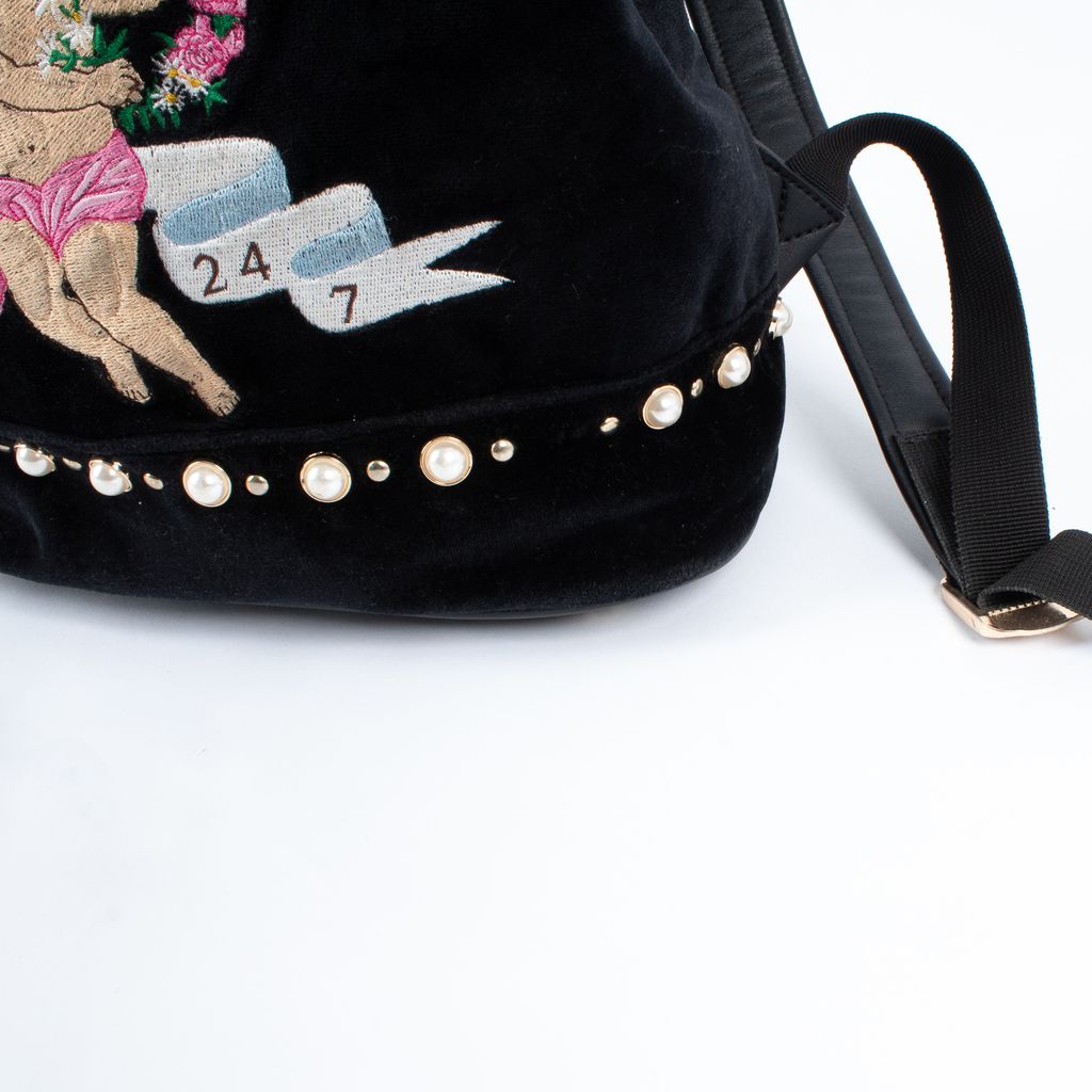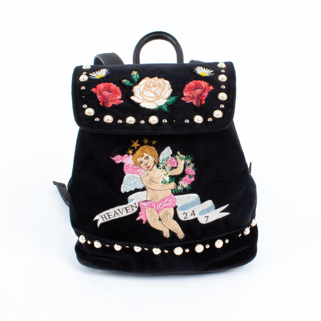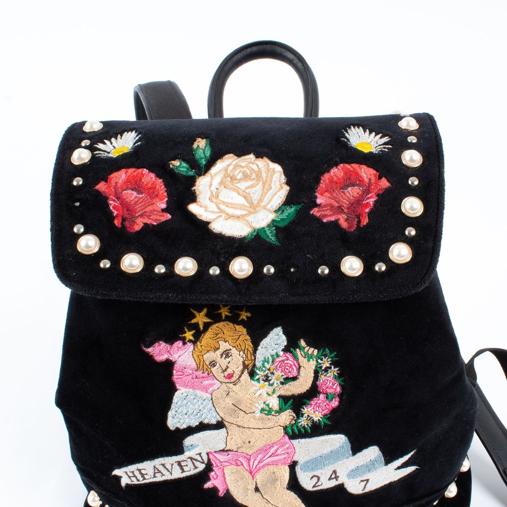Sugar, spice, and everything nice, this precious Poppy Lissiman backpack will have you feeling like you're floating on a cloud. Features all over embroidery including flowers, cherub, and text, pearl details throughout, snap top closure, velvet outer fabrication, and adjustable length straps.