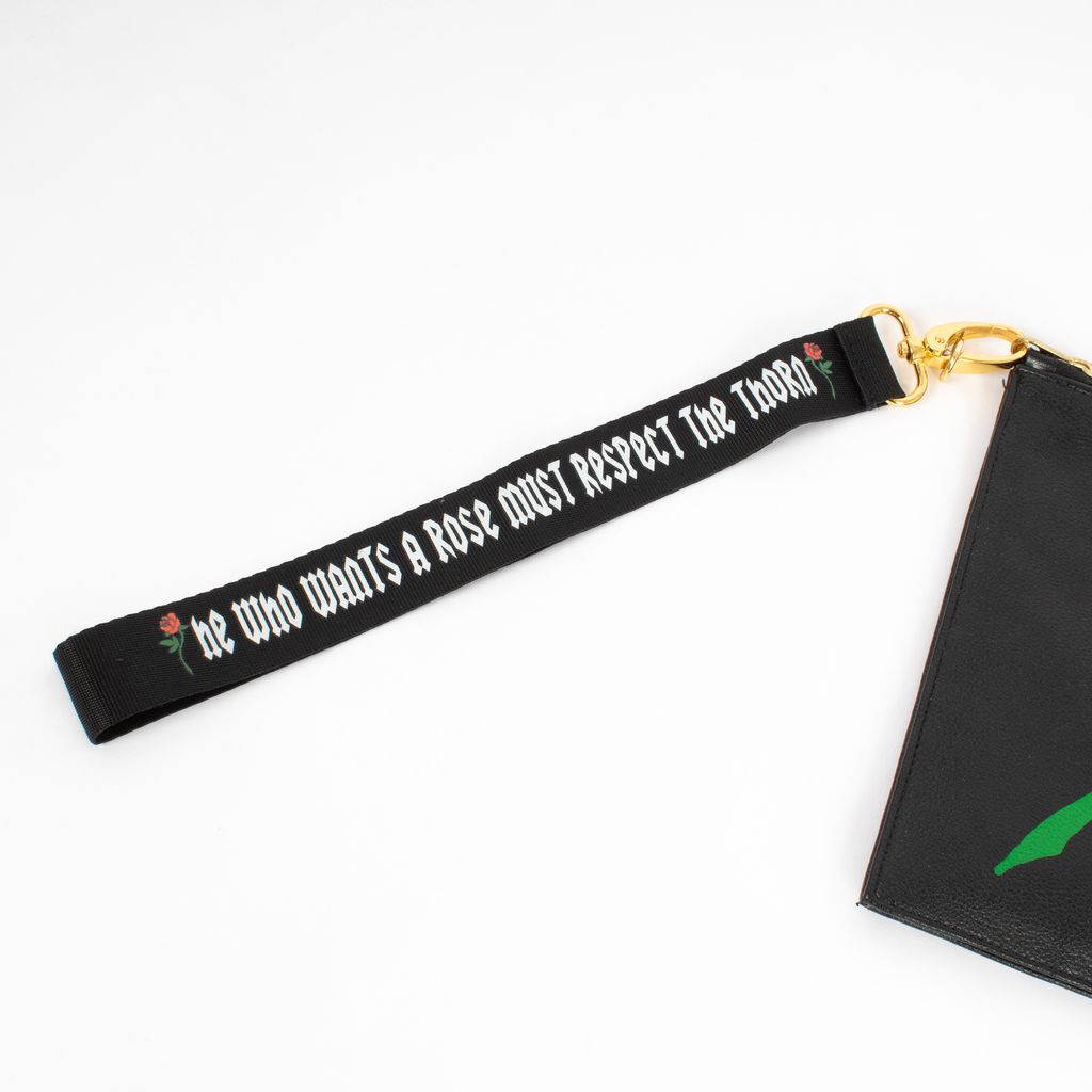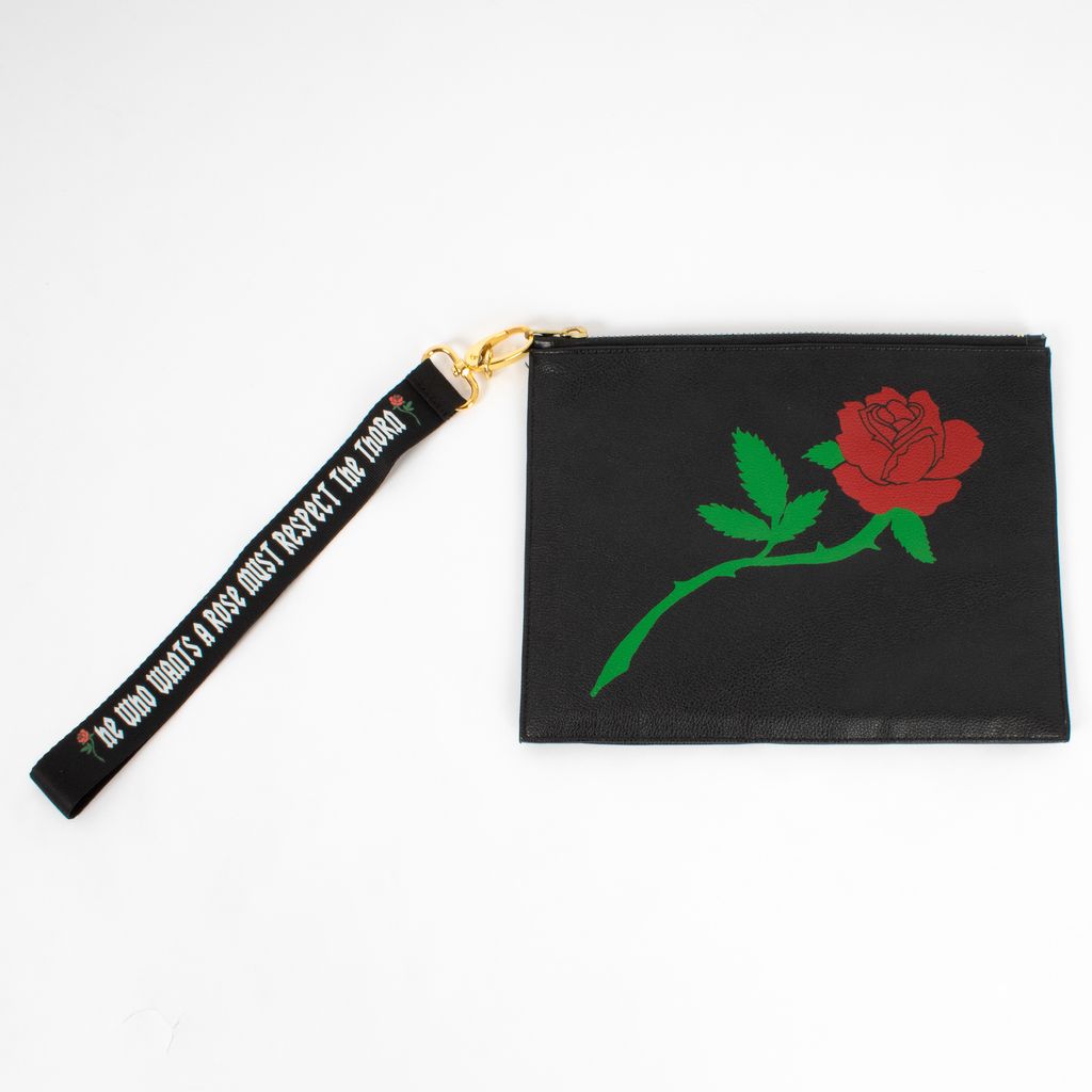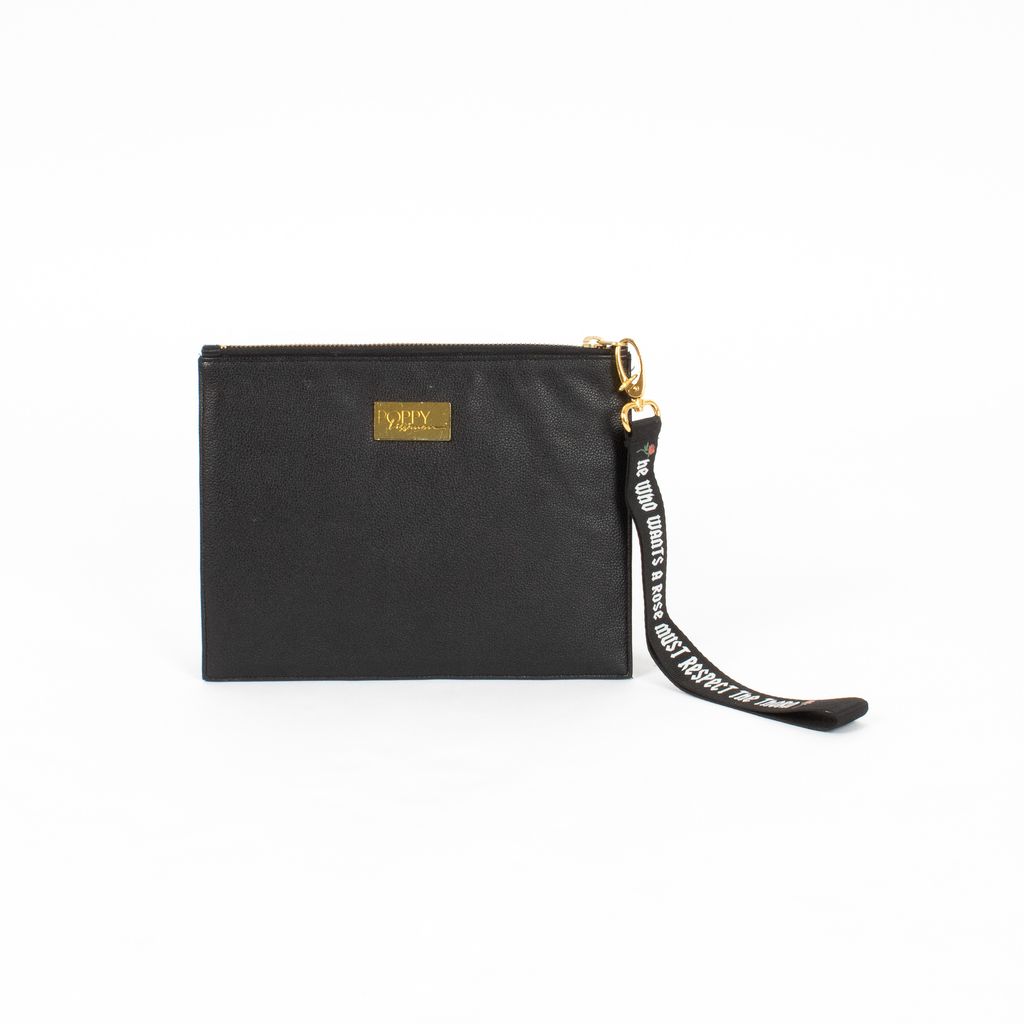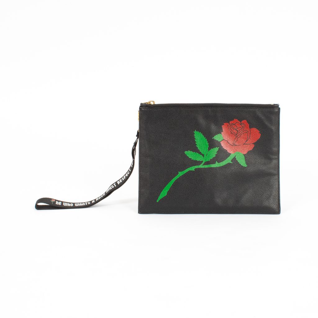 Beautiful and badass, this faux leather clutch from Poppy Lissiman is an easy grab and go piece for a night out. Features rectangular design, printed rose on front, gold Poppy Lissiman logo hardware on back, zip top closure, and detachable printed wrist strap.