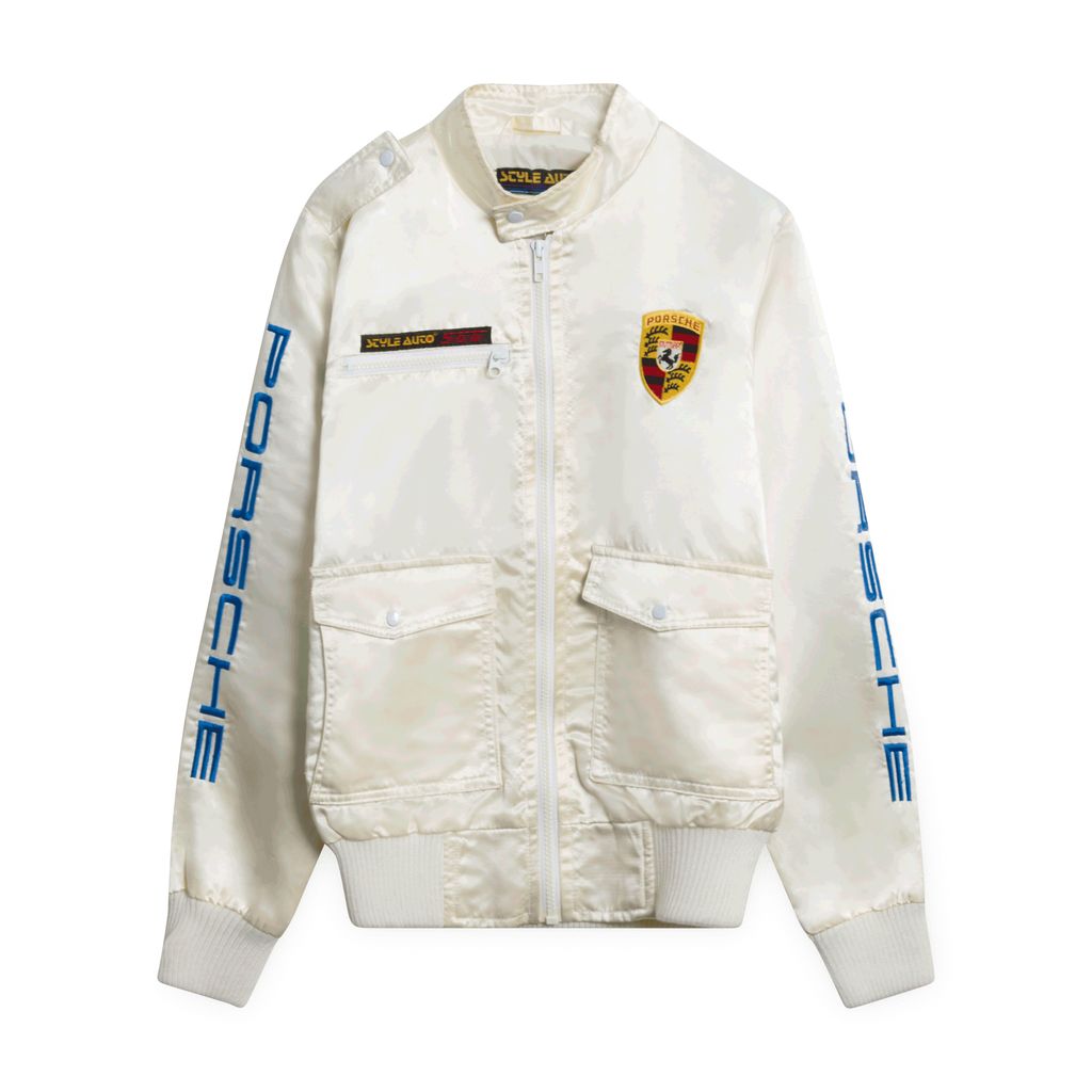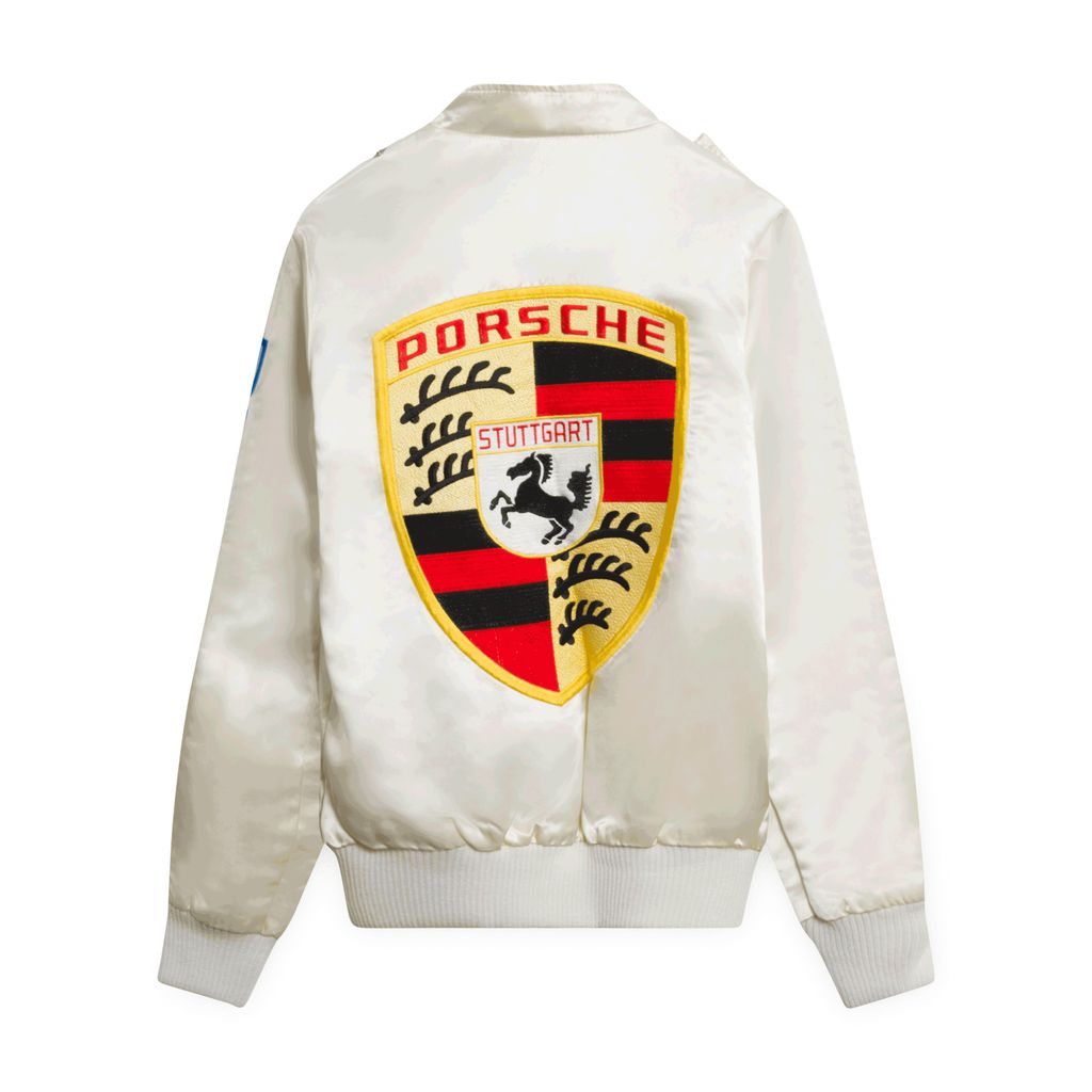 Features reflective yellow satin material with Porsche logo patch on front and on back