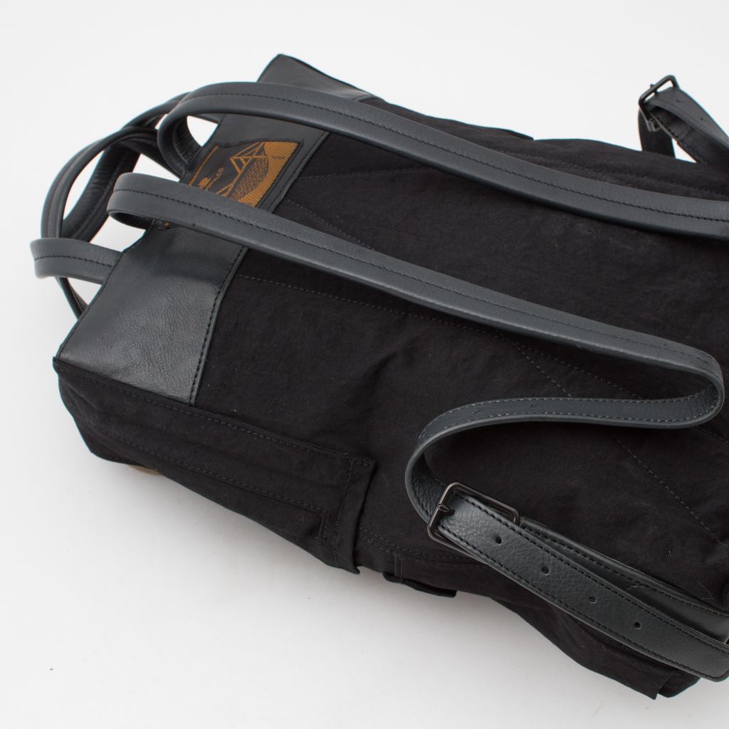 Bridge webbing structure keeps the weight close to the body and makes this lightweight bag extremely strong. Double handles make it comfortable to carry. Zips closed, exterior zipper pocket. 12 liters. Handmade in Japan. Patent Pending.
