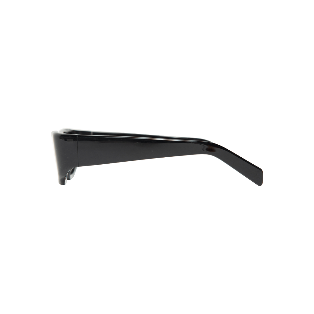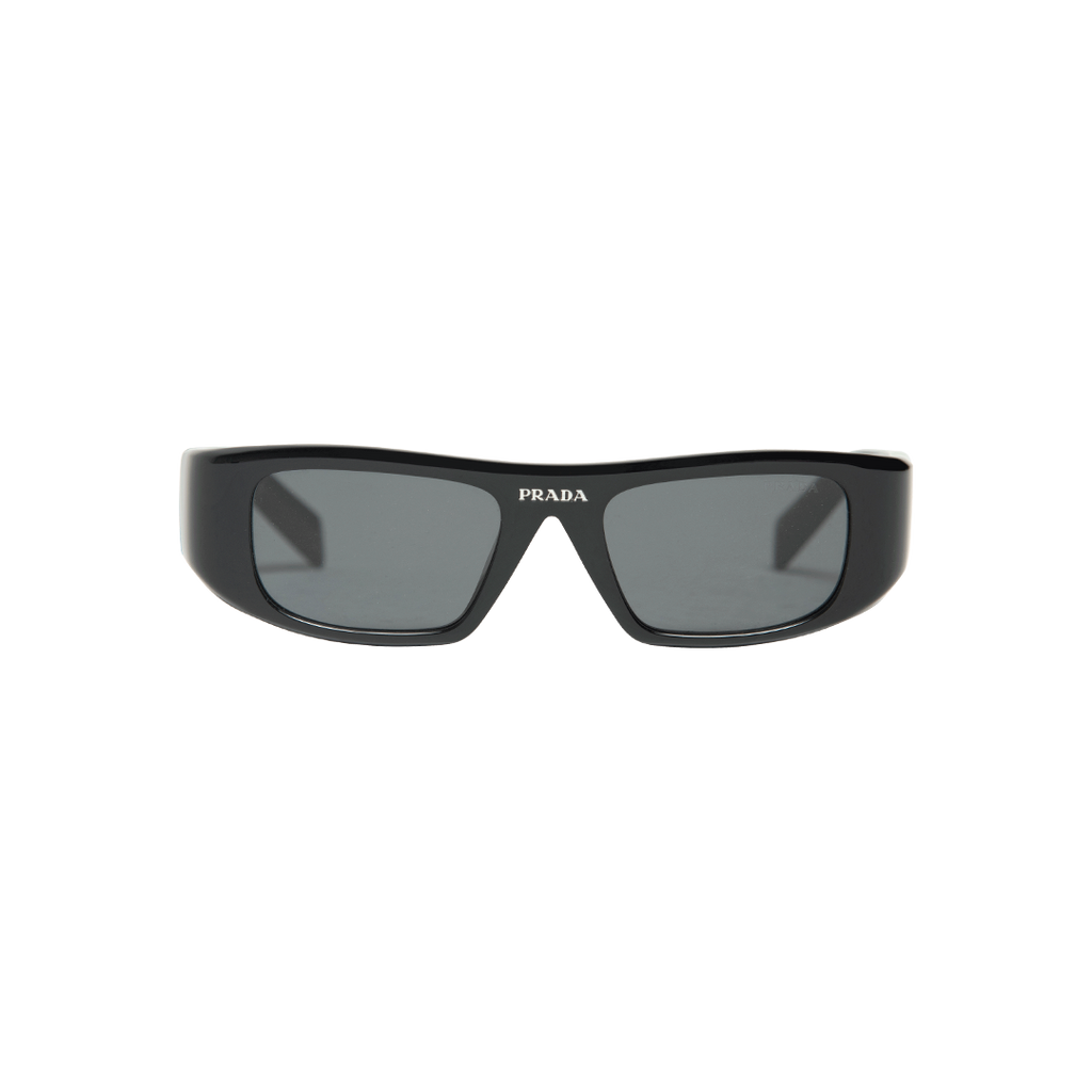 Prada Black Rectangular Sunglasses features acetate rectangular frames, grey tinted lenses, lens decal, logo print on front, straight arms, and curved tips.