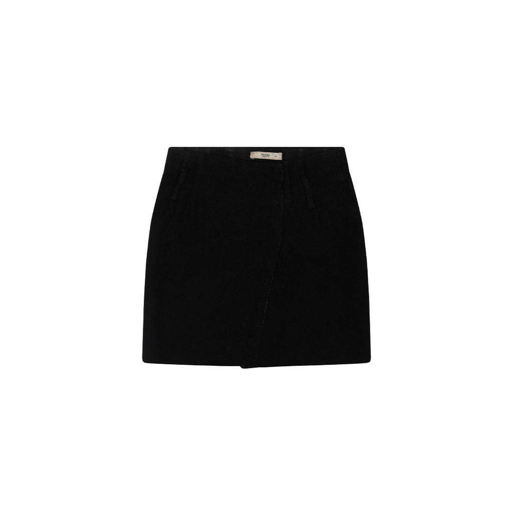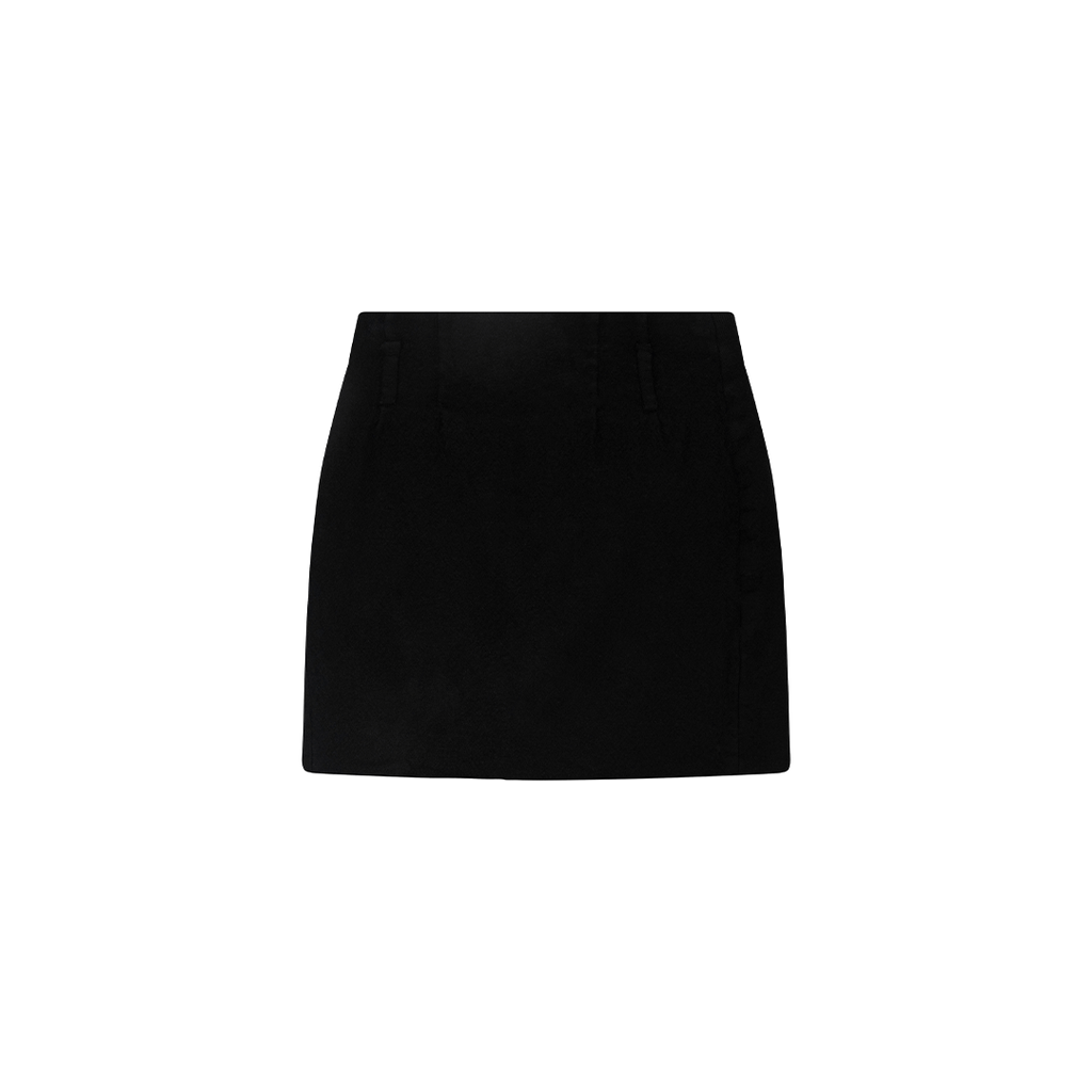 Prada Black Wool Mini Skirt features 3 snap button closures at front, belt loops, and split in front.