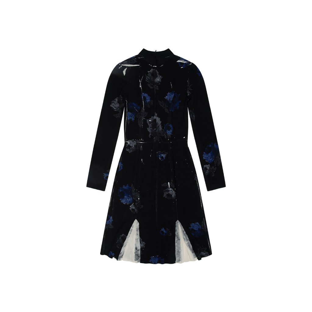 Prada Floral Dress features back zip closure, mock neck collar, and floral design through out.