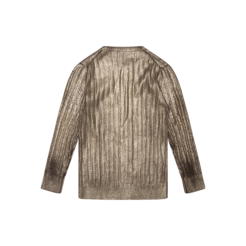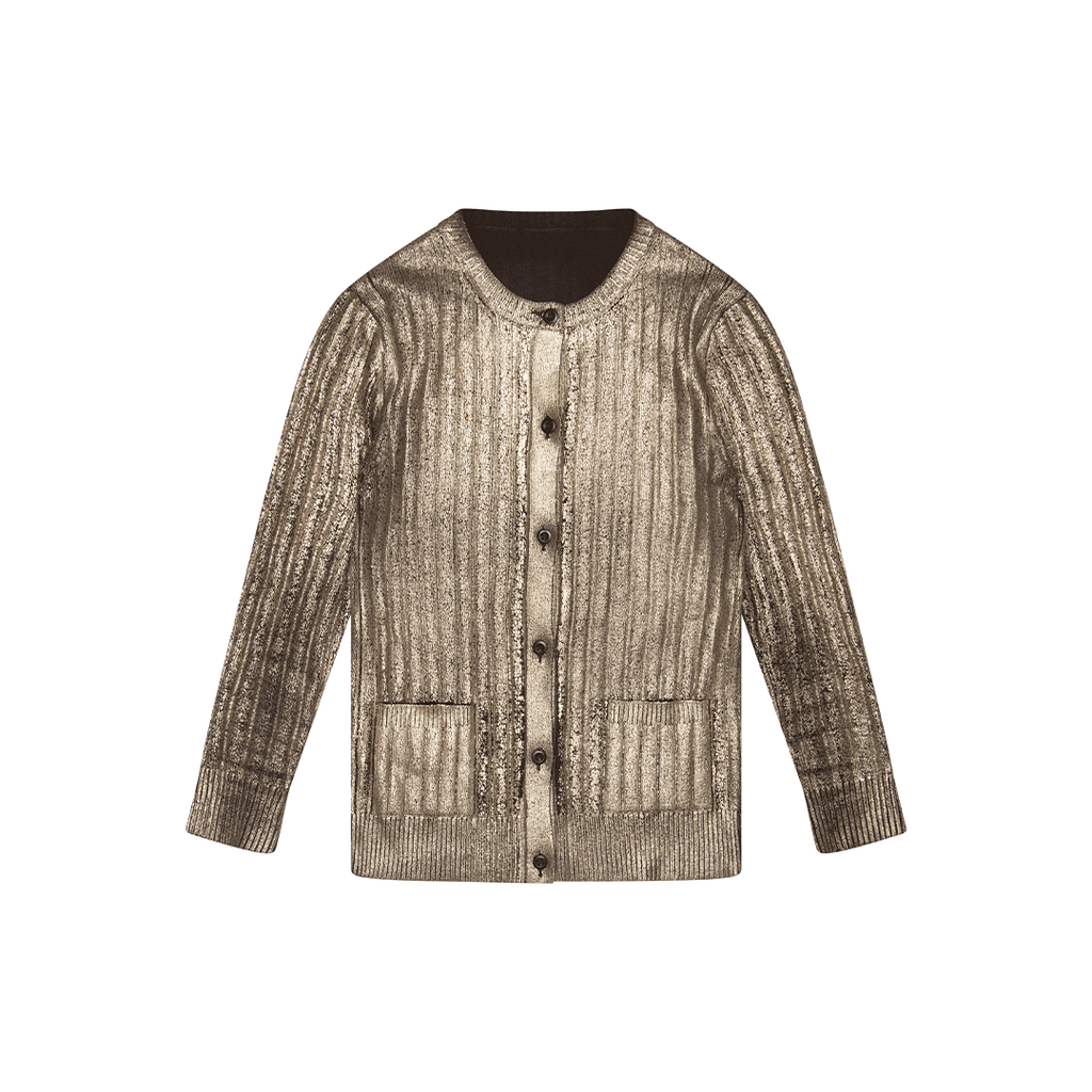 Prada Gold Cardigan features fold metallic detail throughout, front button closure and two front slit pockets.