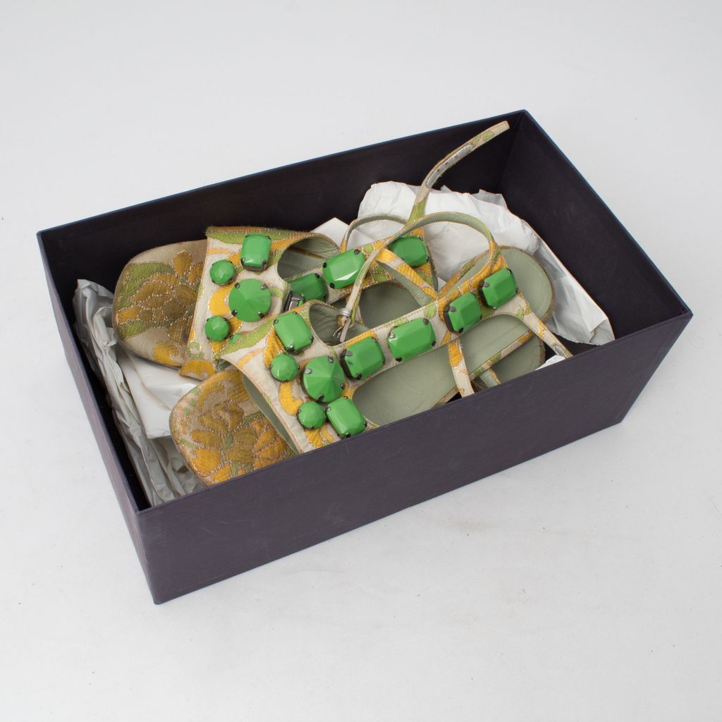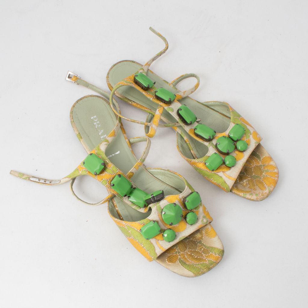 Prada jeweled retro style fabric covered leather strap sandals. Great used condition with normal to light wear. Comes with original box.