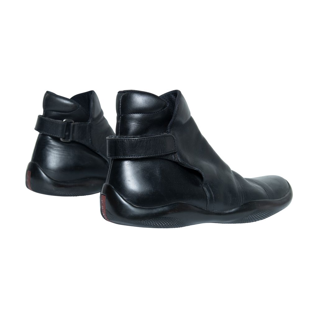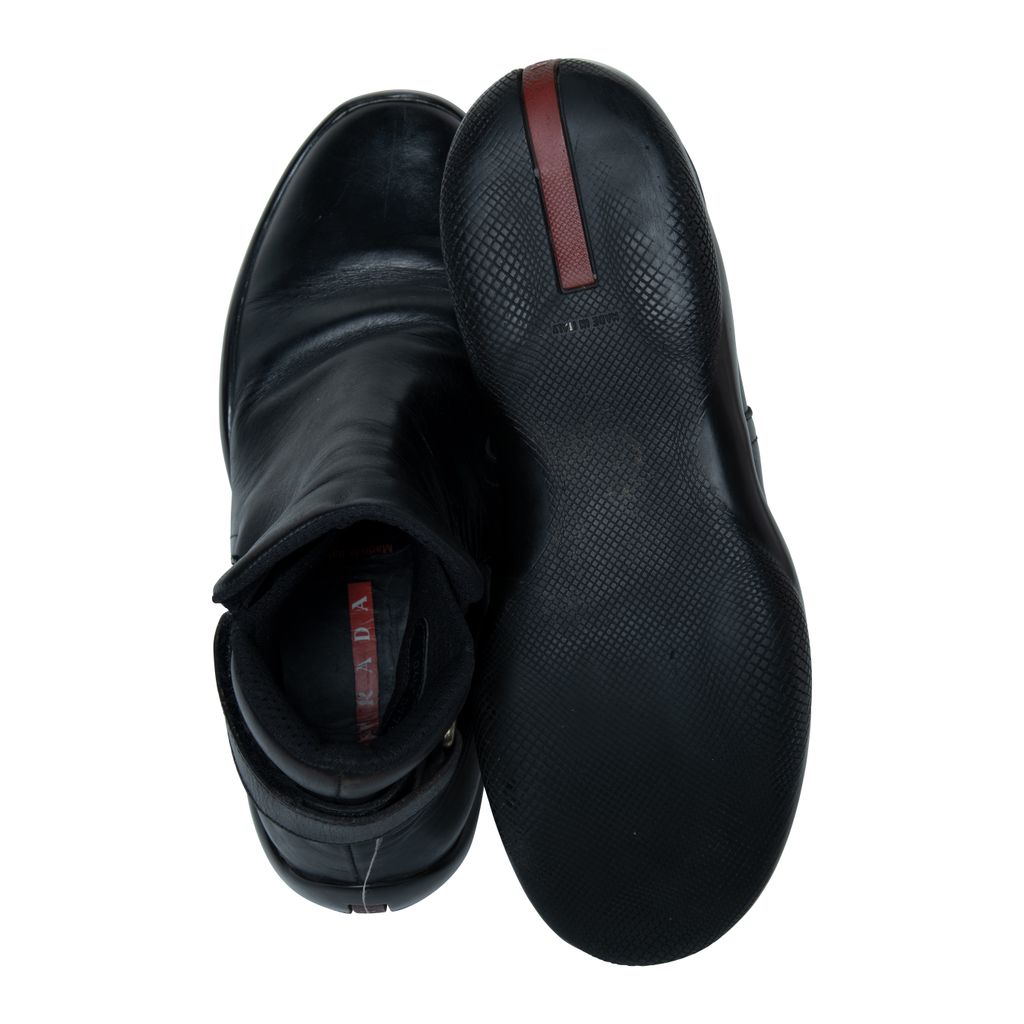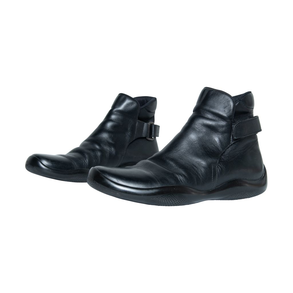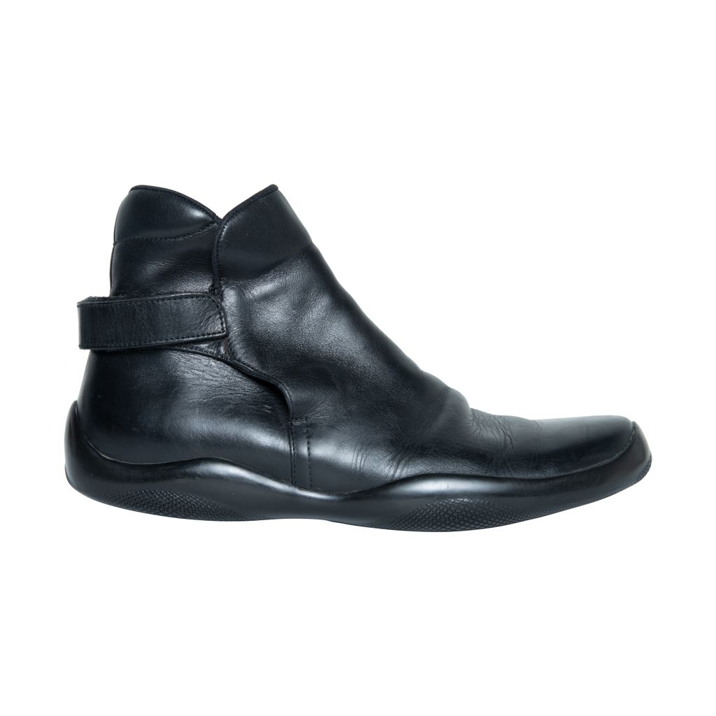 Prada leather boots features leather throughout, velcro strap at back, and rubber gum sole.