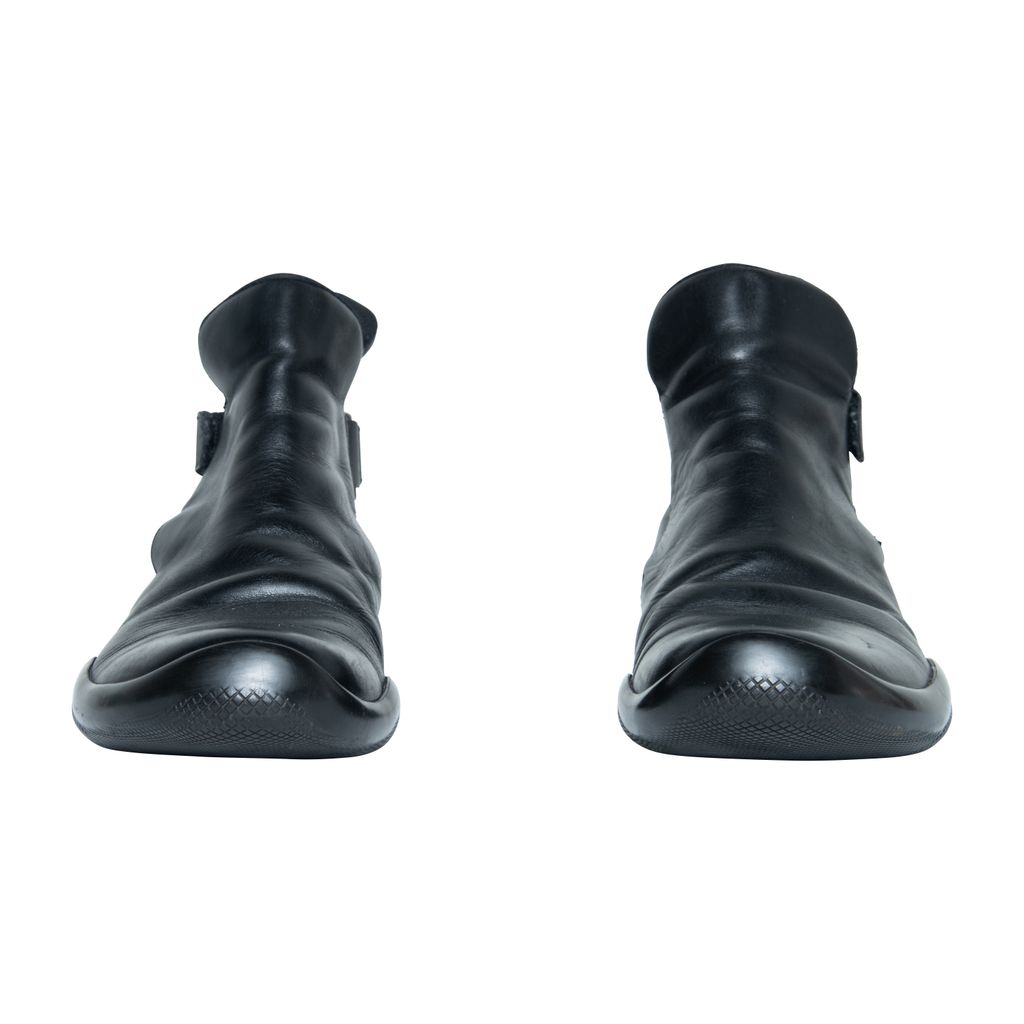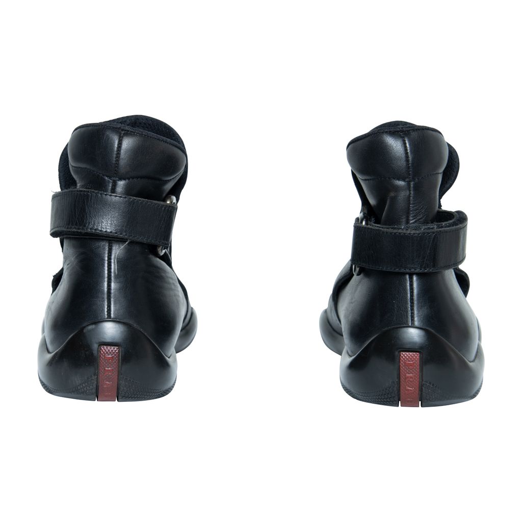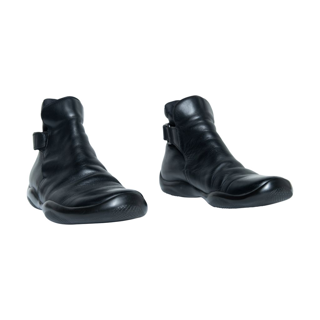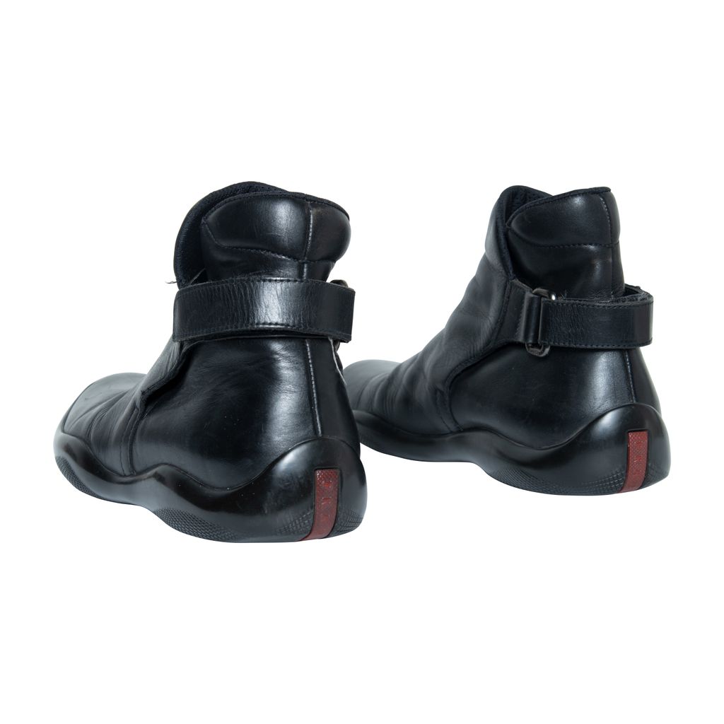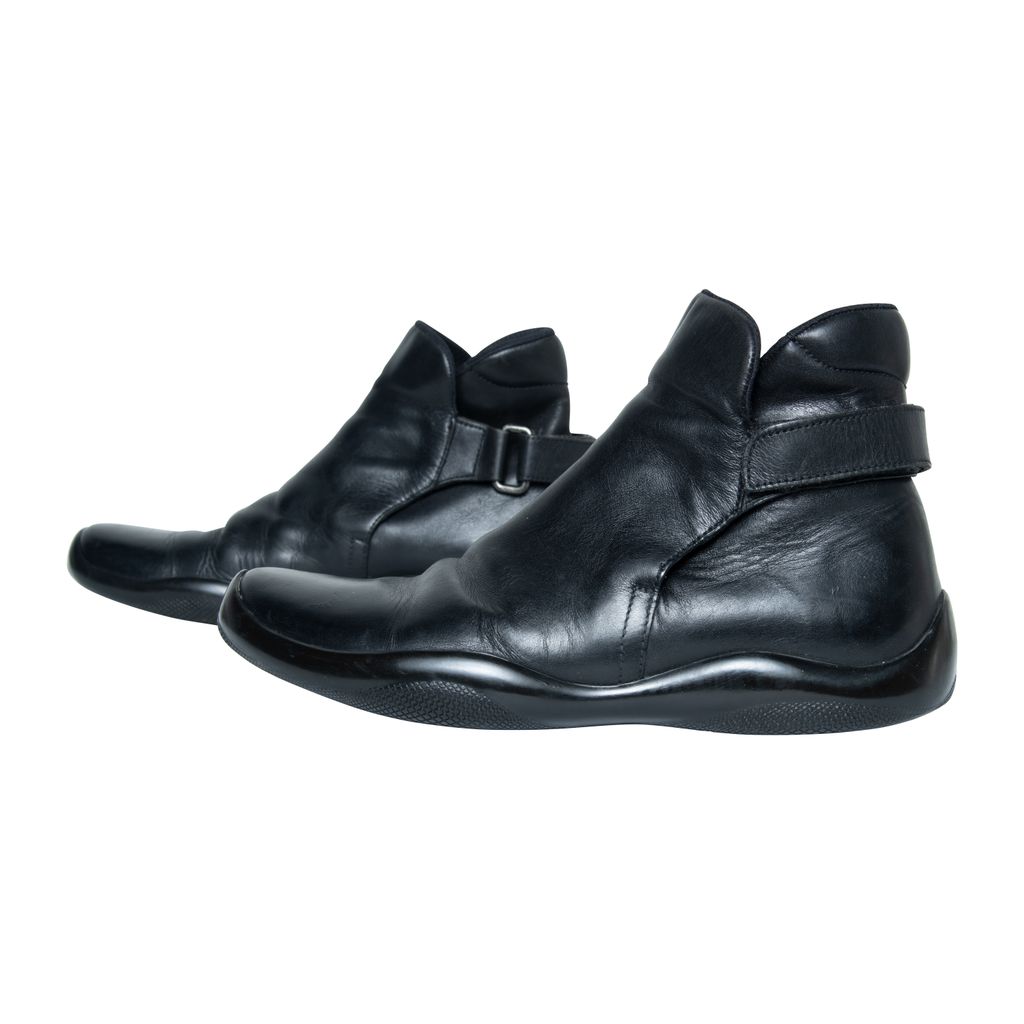 Prada leather boots features leather throughout, velcro strap at back, and rubber gum sole.