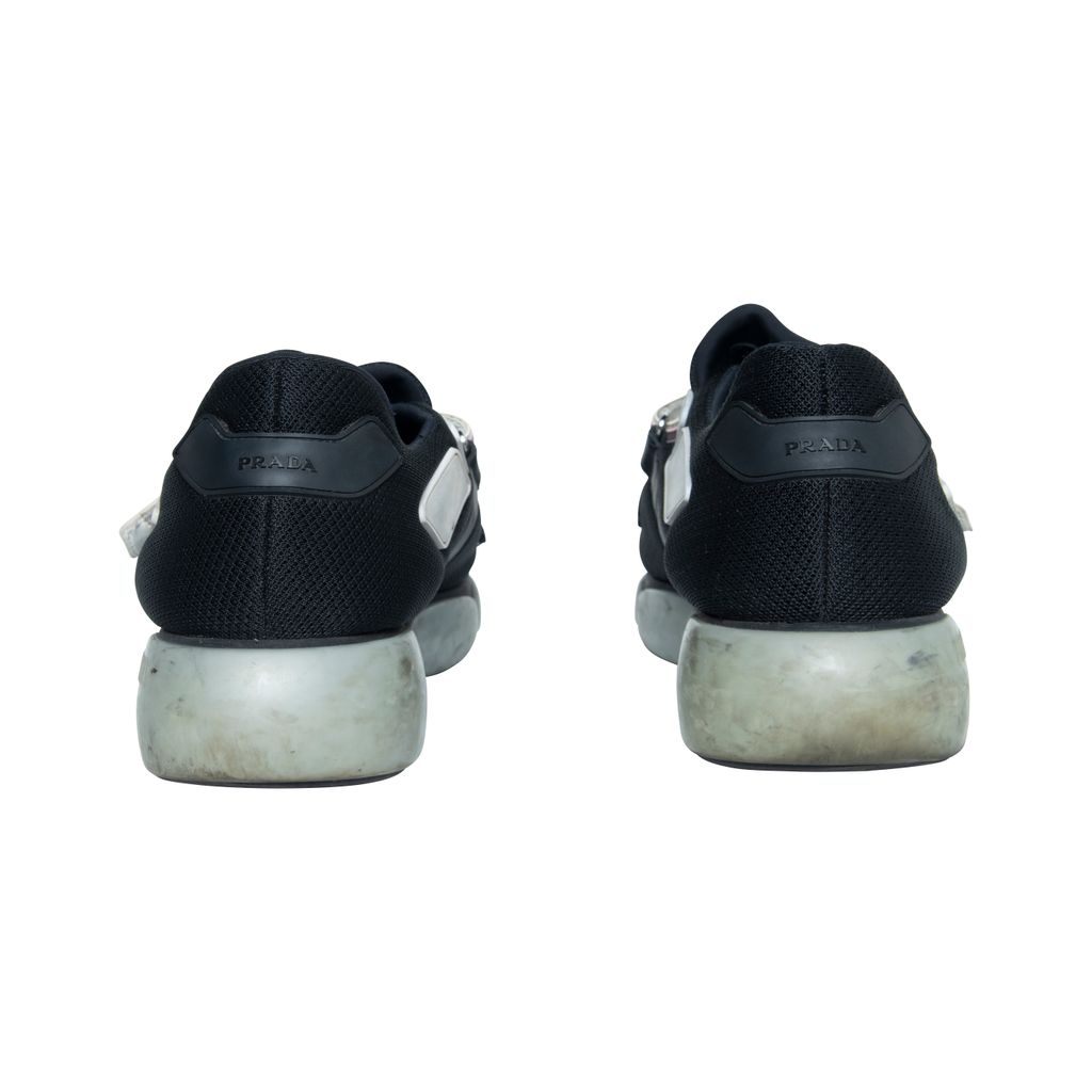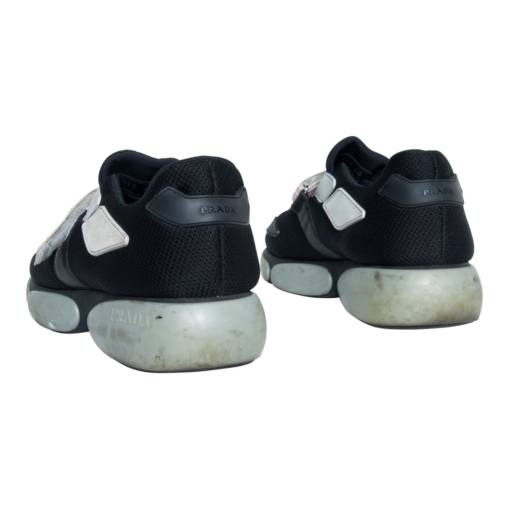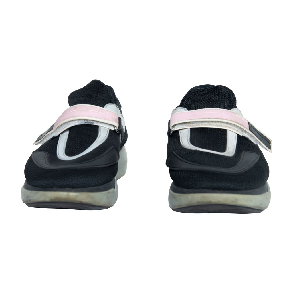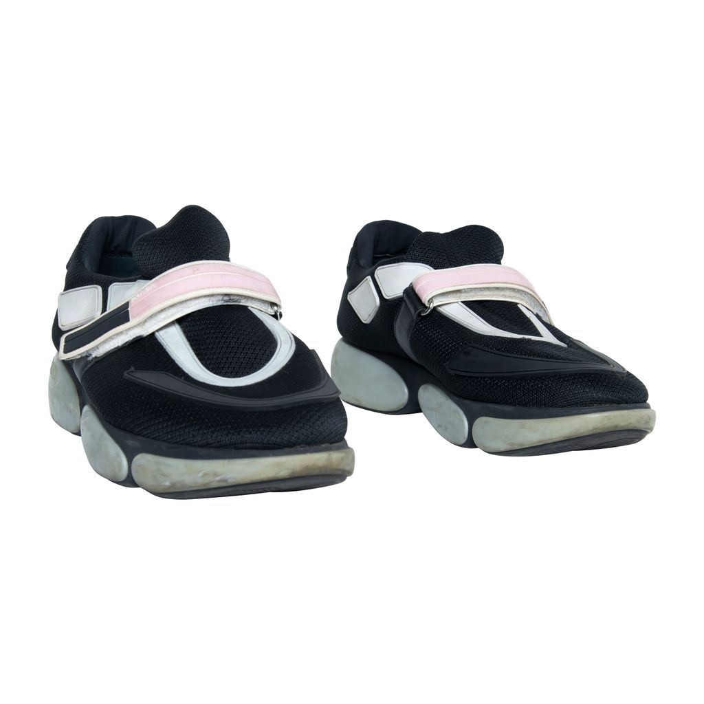 Prada Leather Trim Embellishment Sneakers features rubber trim, round toe with leather trim embellishments, and velcro strap closure at uppers.