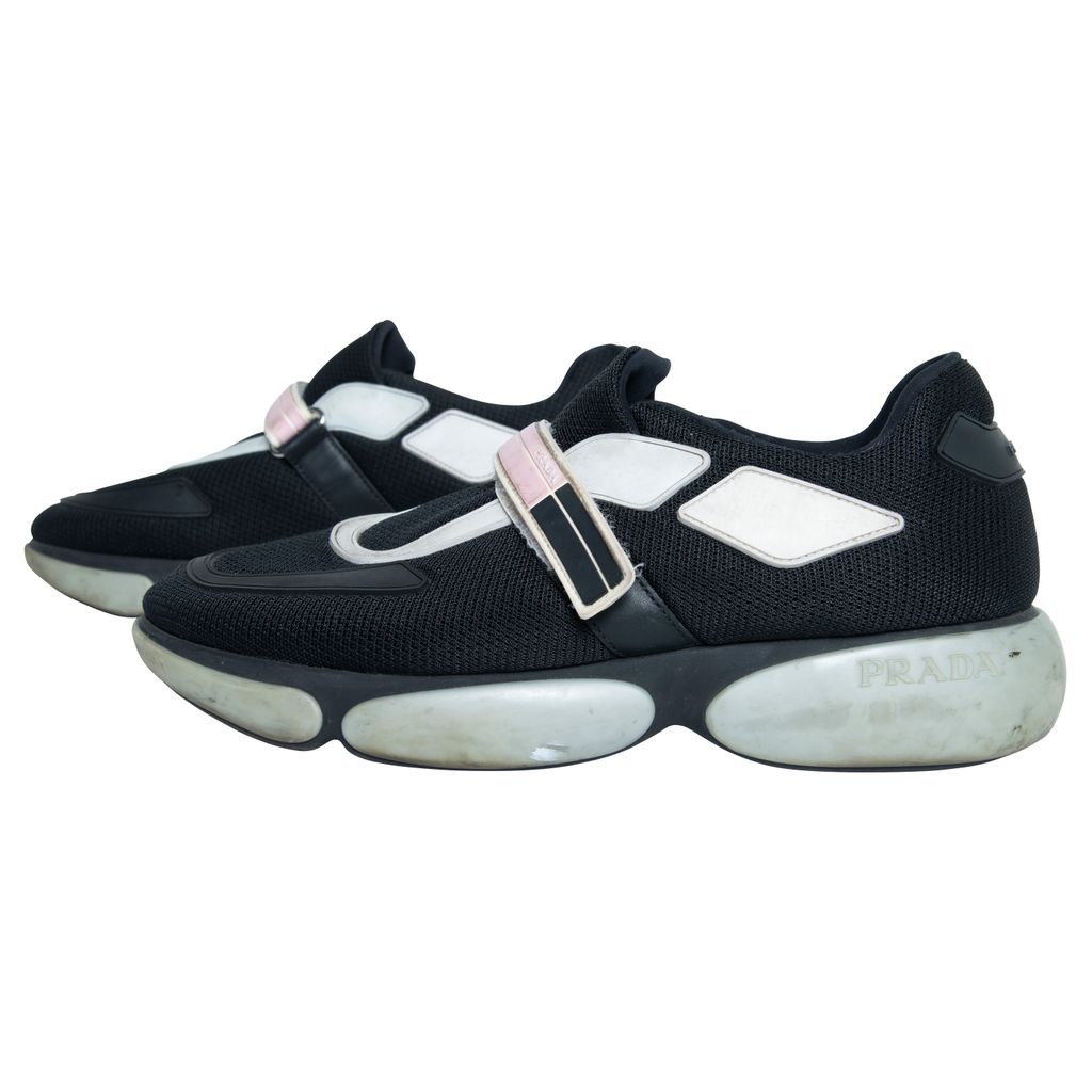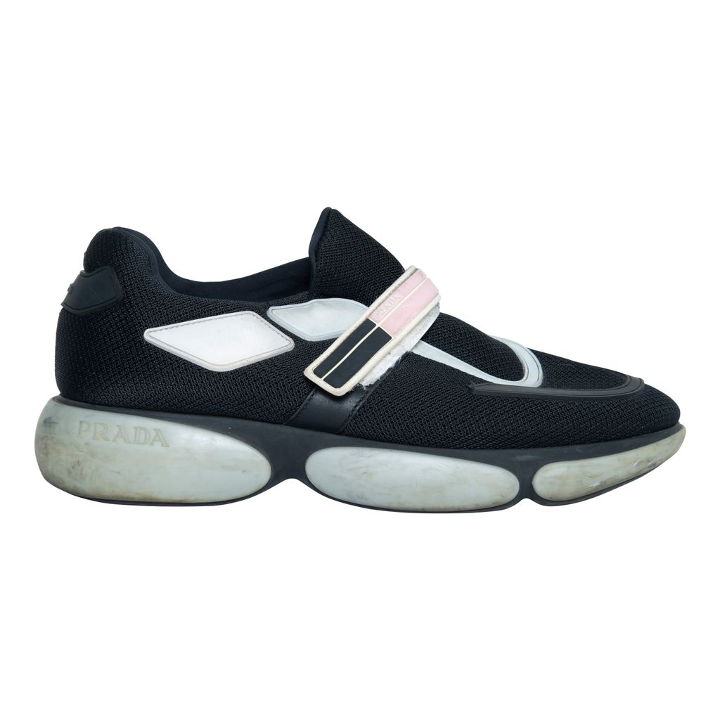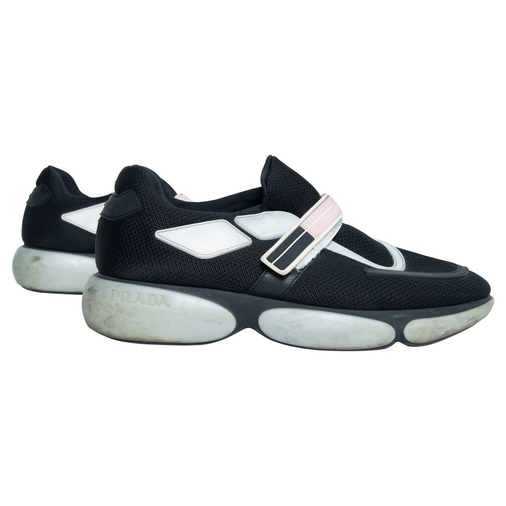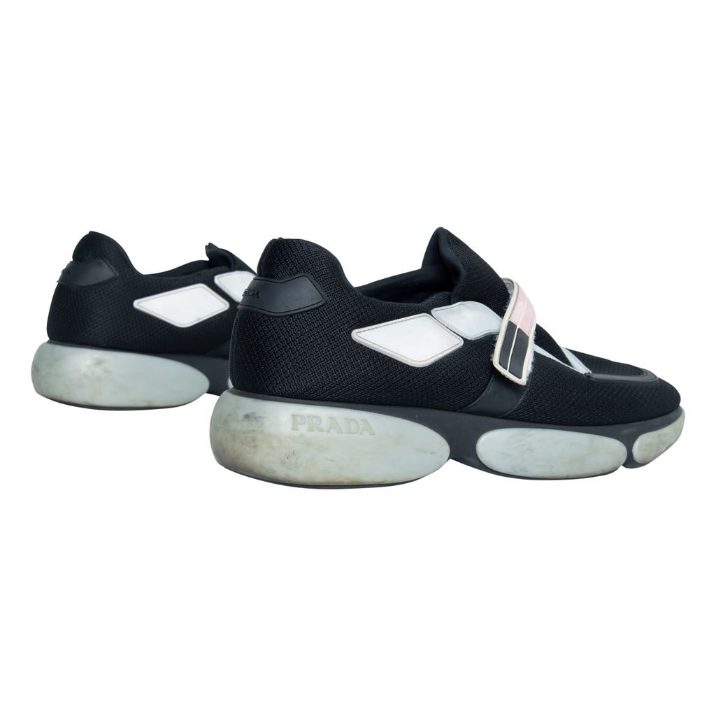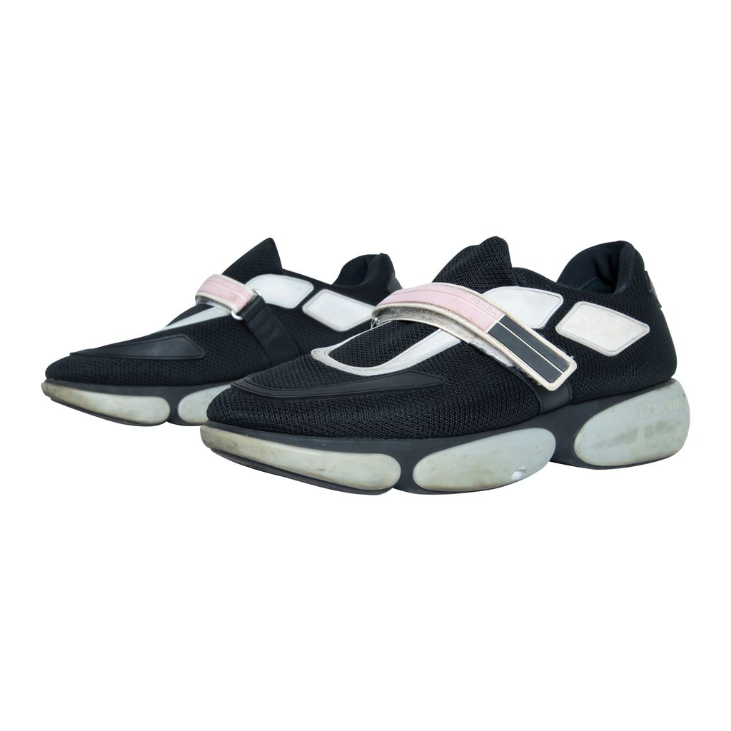 Prada Leather Trim Embellishment Sneakers features rubber trim, round toe with leather trim embellishments, and velcro strap closure at uppers.