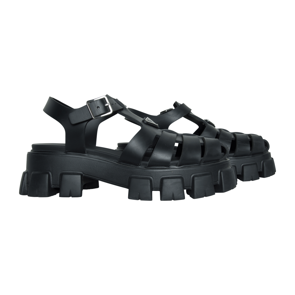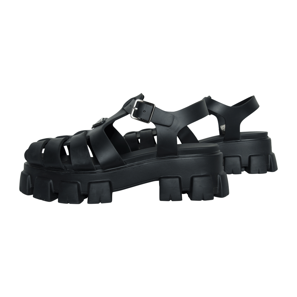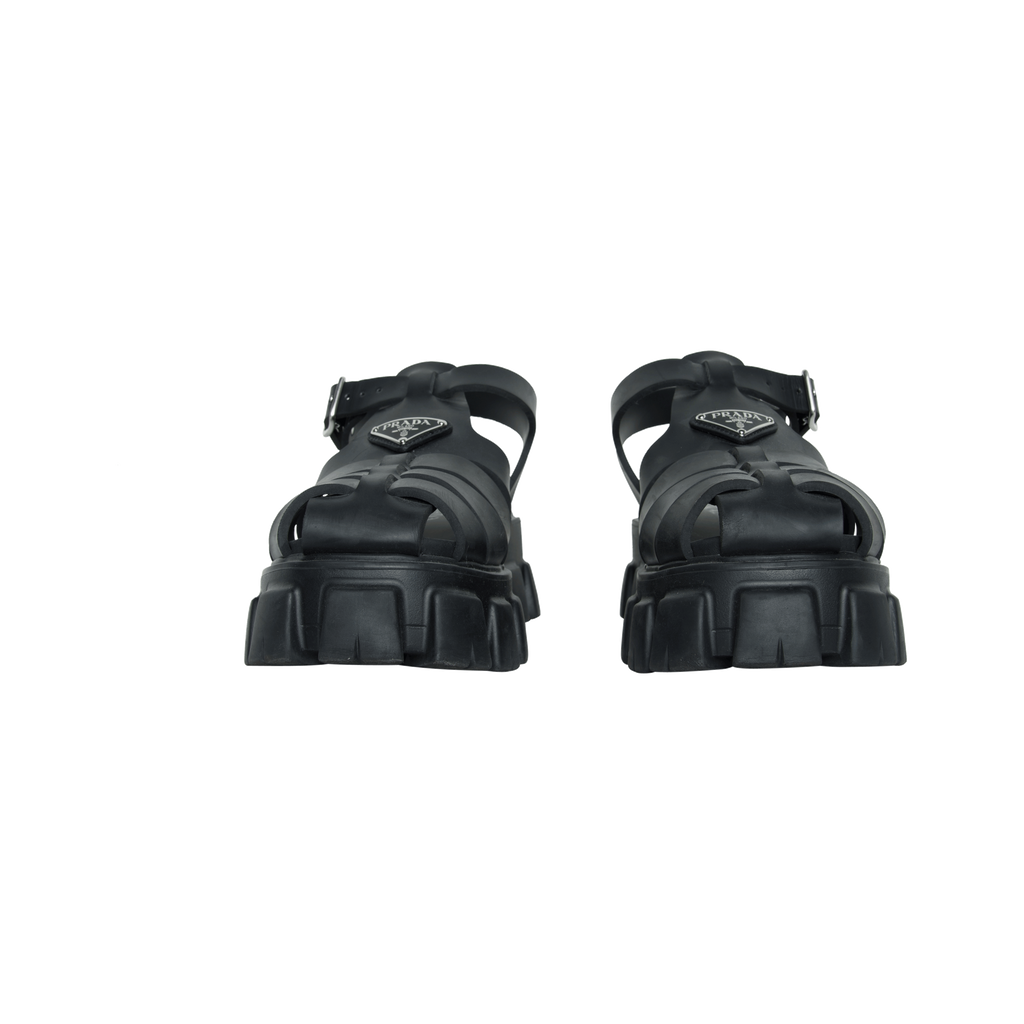 Prada Men's Monolith Rubber Chunky-Sole Fisherman Sandals feature round toe, lugged rubber platform sole, caged vamp, adjustable ankle strap, chunky heel, and signature enameled triangle logo.