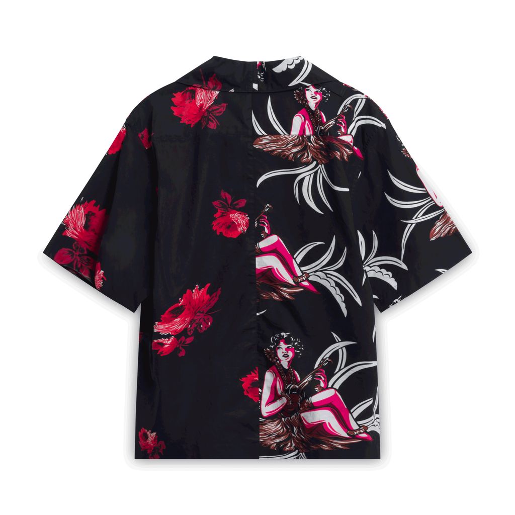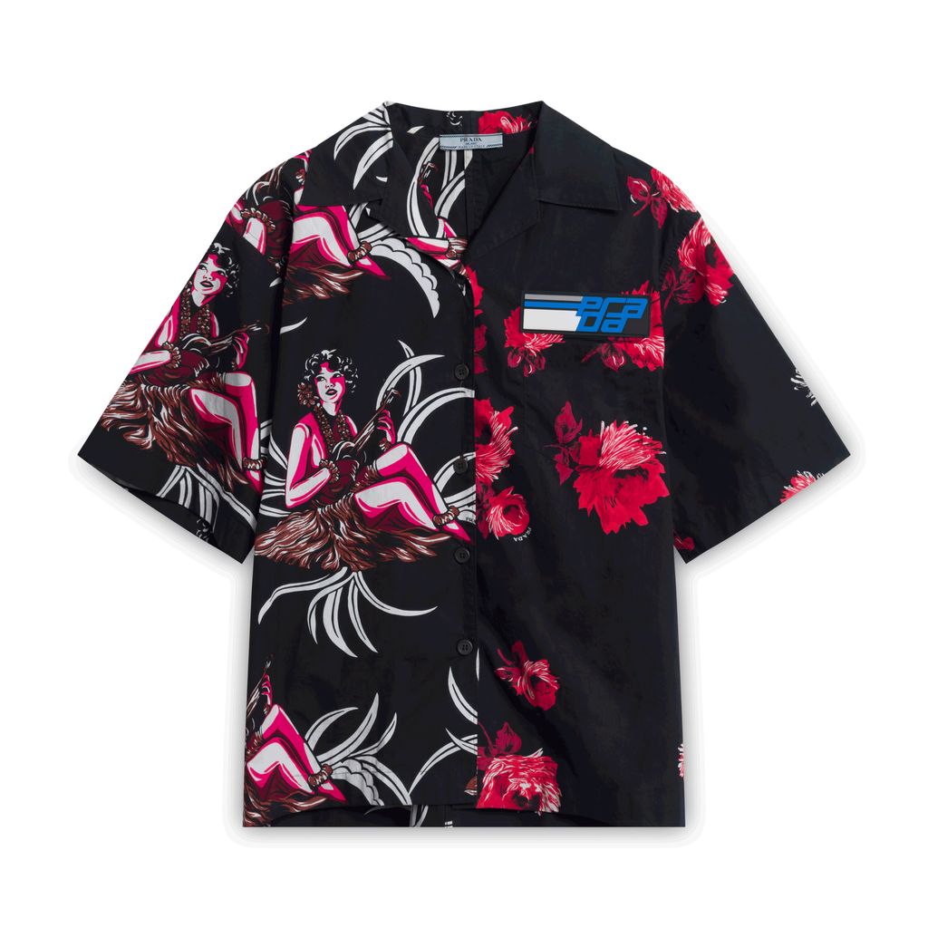 This floral Hawaiian shirt is bold with it's hot pink, white, and black coloring. Rubberized Prada logo is on the left chest.