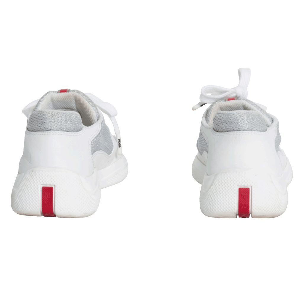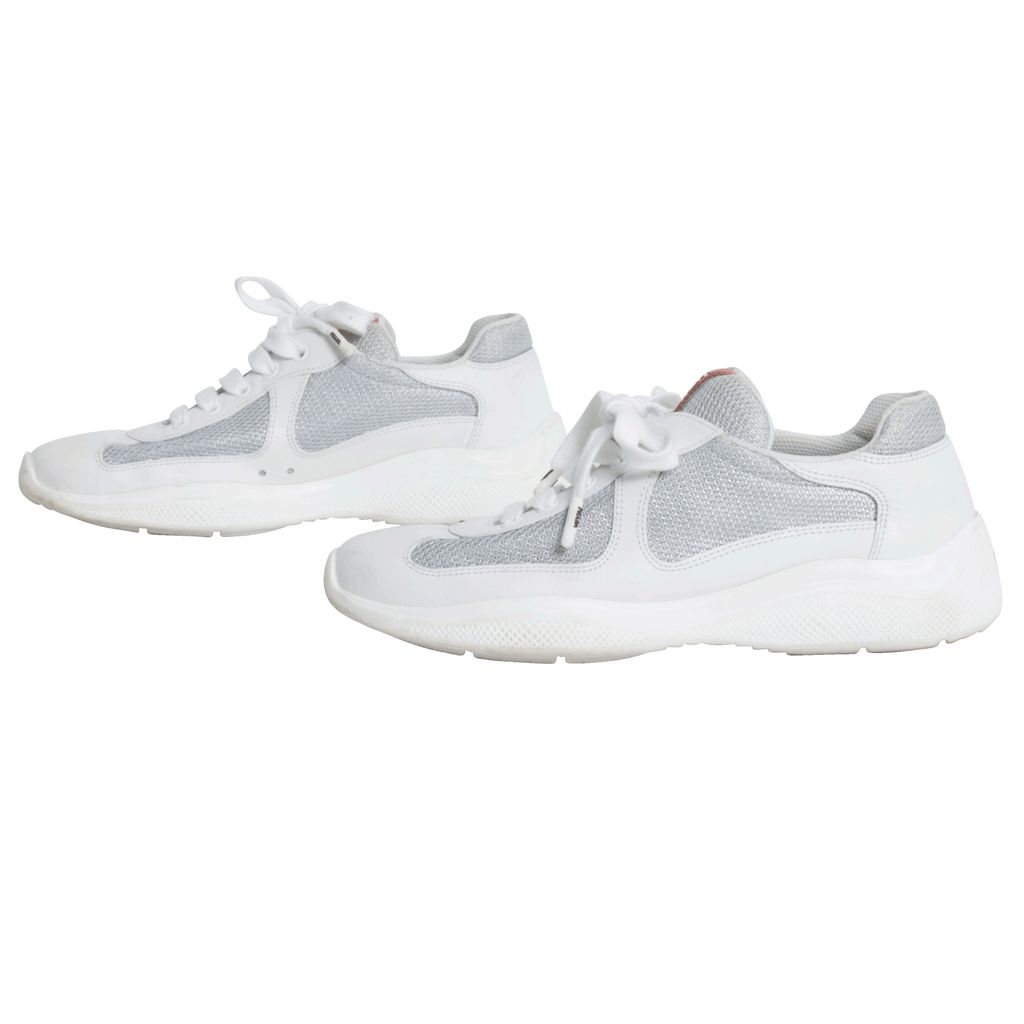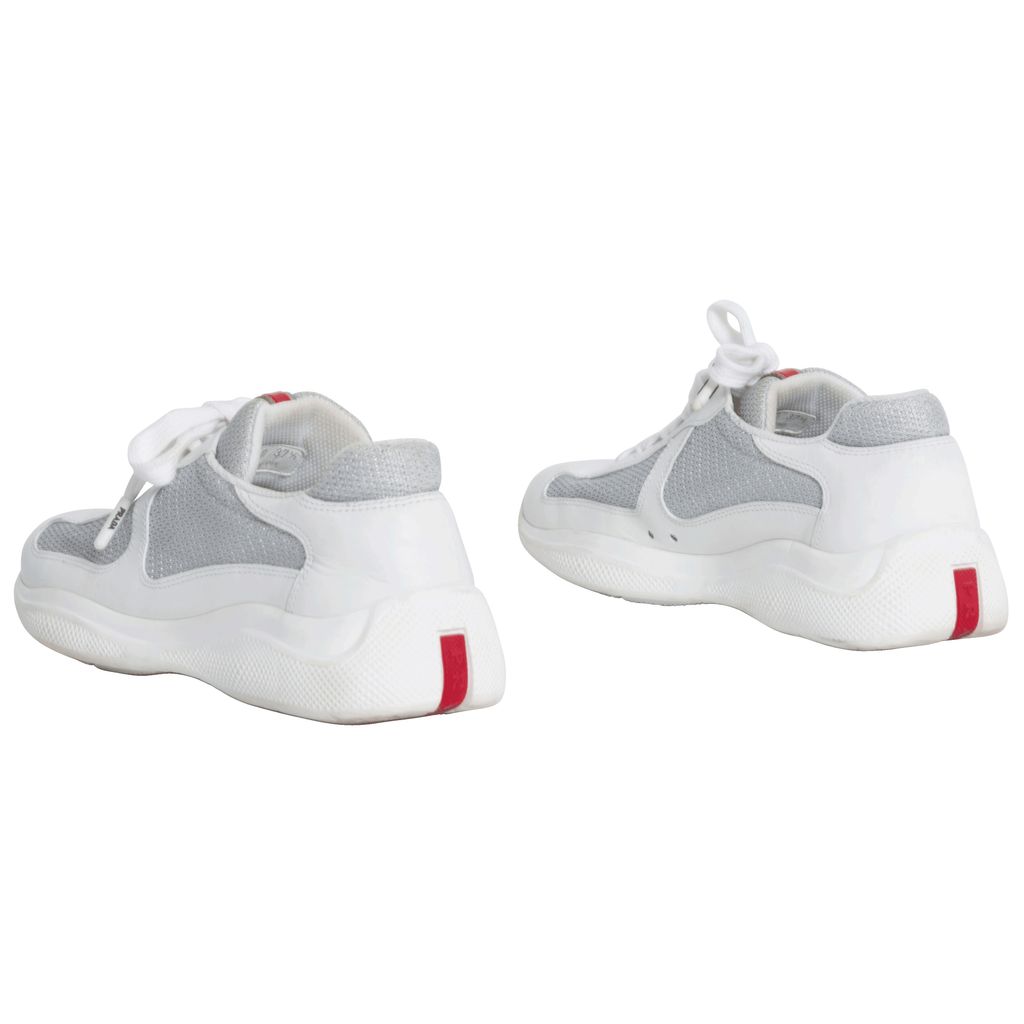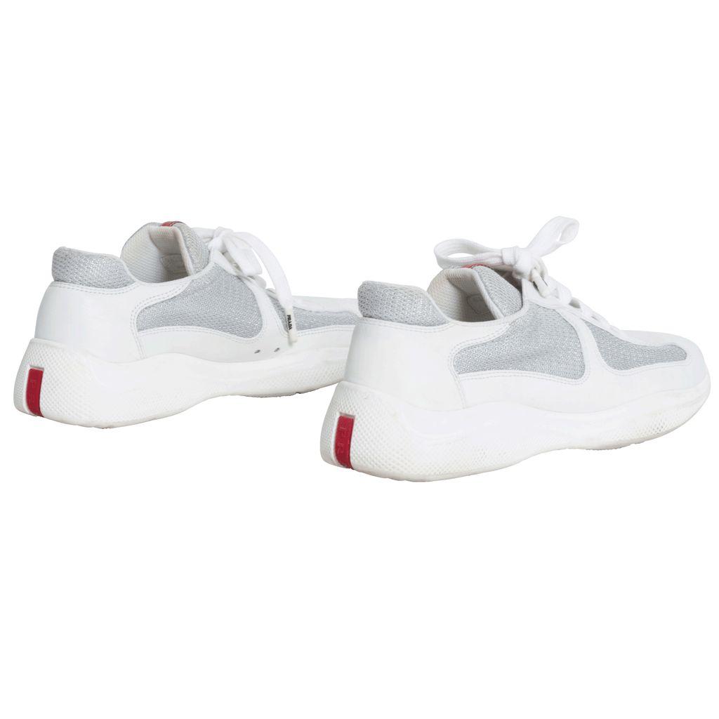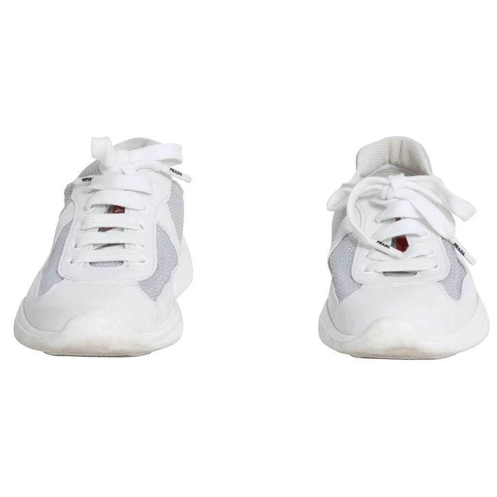 These iconic leather and technical fabric sneakers designed for the Luna Rossa crew have a sporty, contemporary design and restyled details and lines. These white and silver leather and technical fabric sneakers from Prada feature an almond toe, contrasting panels, lace-up front fastening, brand embossed tongue, branded insole, and a ridged rubber sole. Tech Specs Pre-Owned Sole: 100% Rubber Outer: 100% Calf Leather, 100% Nylon