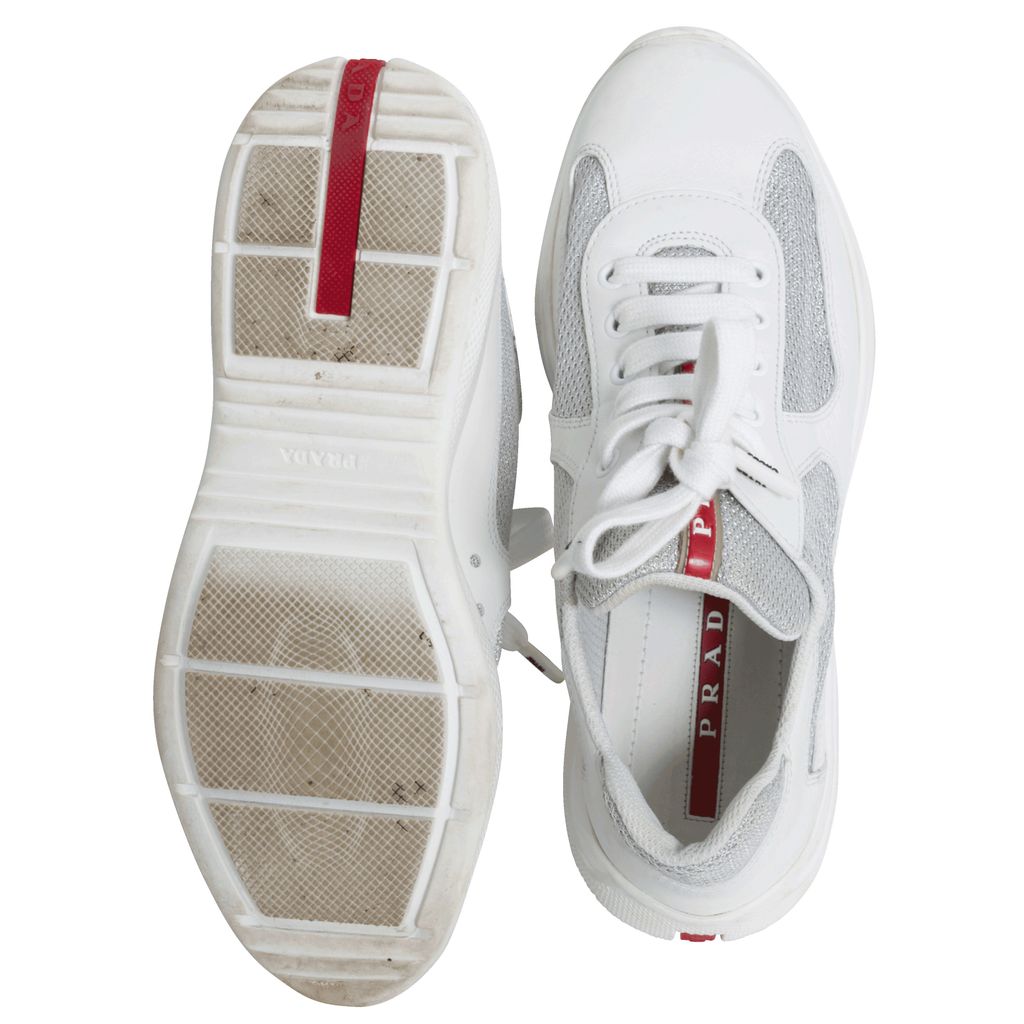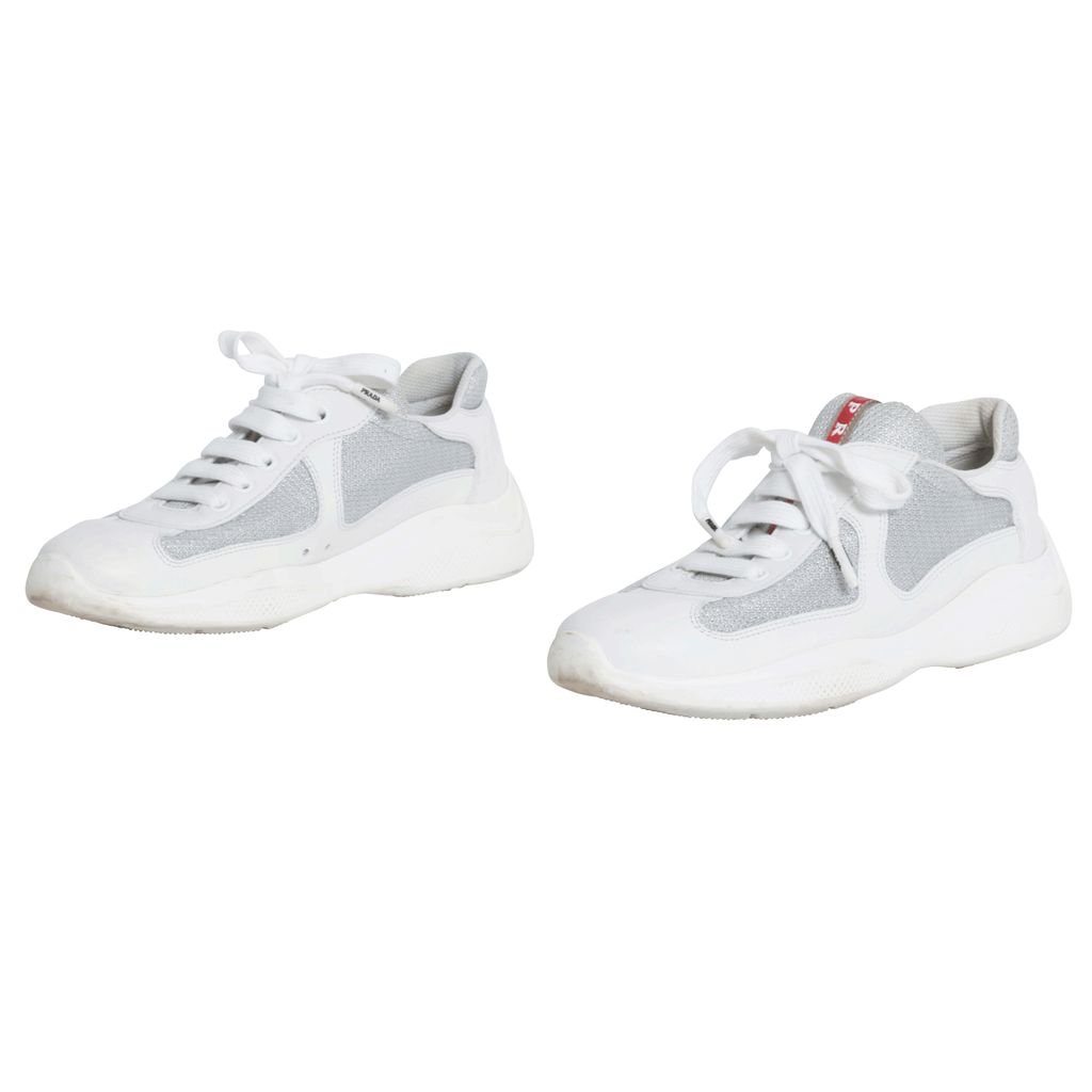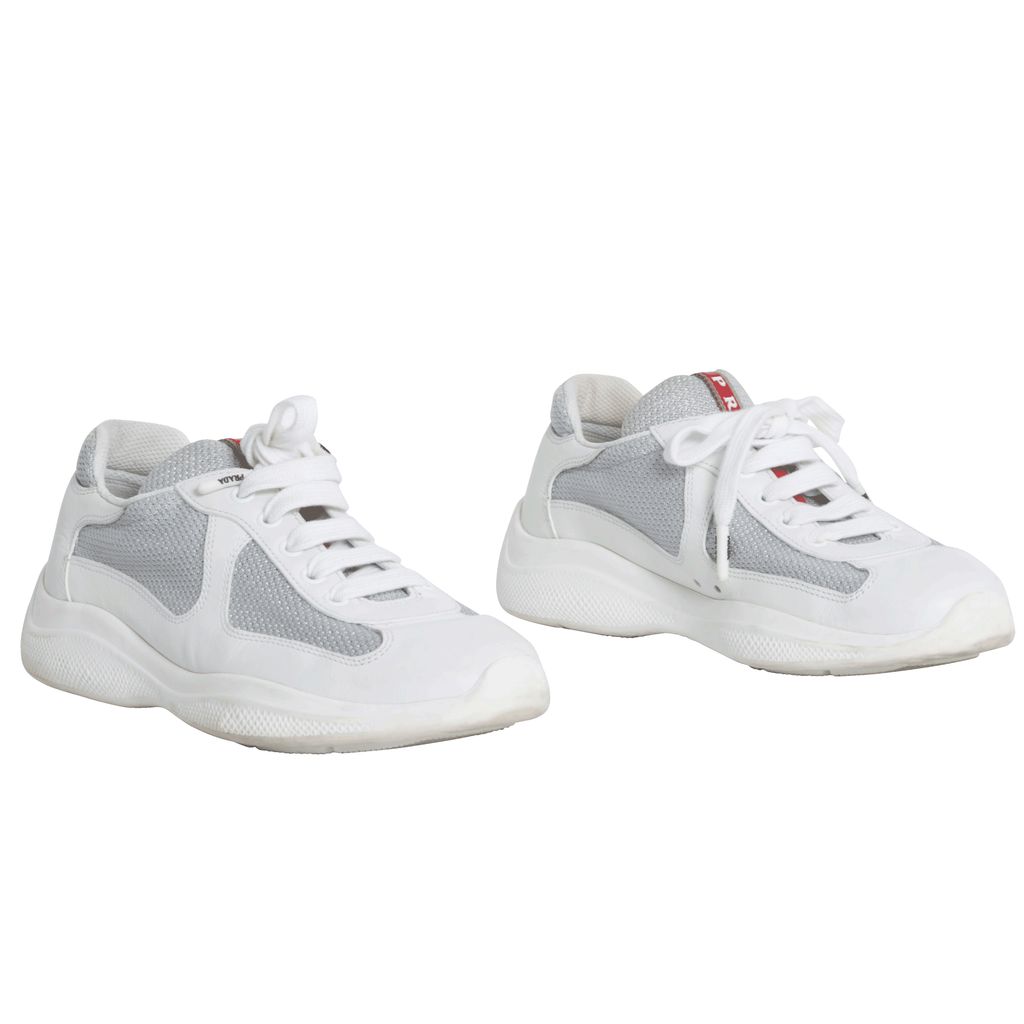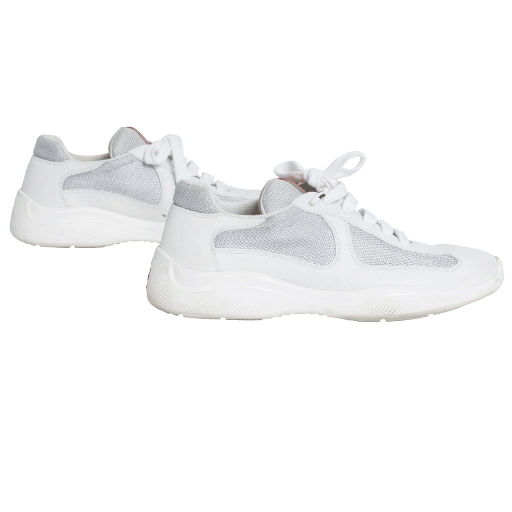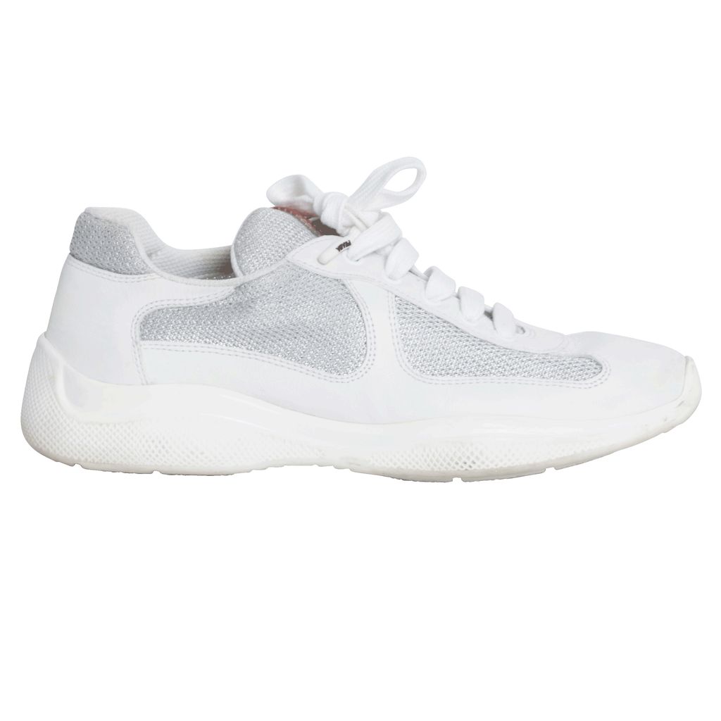 These iconic leather and technical fabric sneakers designed for the Luna Rossa crew have a sporty, contemporary design and restyled details and lines. These white and silver leather and technical fabric sneakers from Prada feature an almond toe, contrasting panels, lace-up front fastening, brand embossed tongue, branded insole, and a ridged rubber sole. Tech Specs Pre-Owned Sole: 100% Rubber Outer: 100% Calf Leather, 100% Nylon