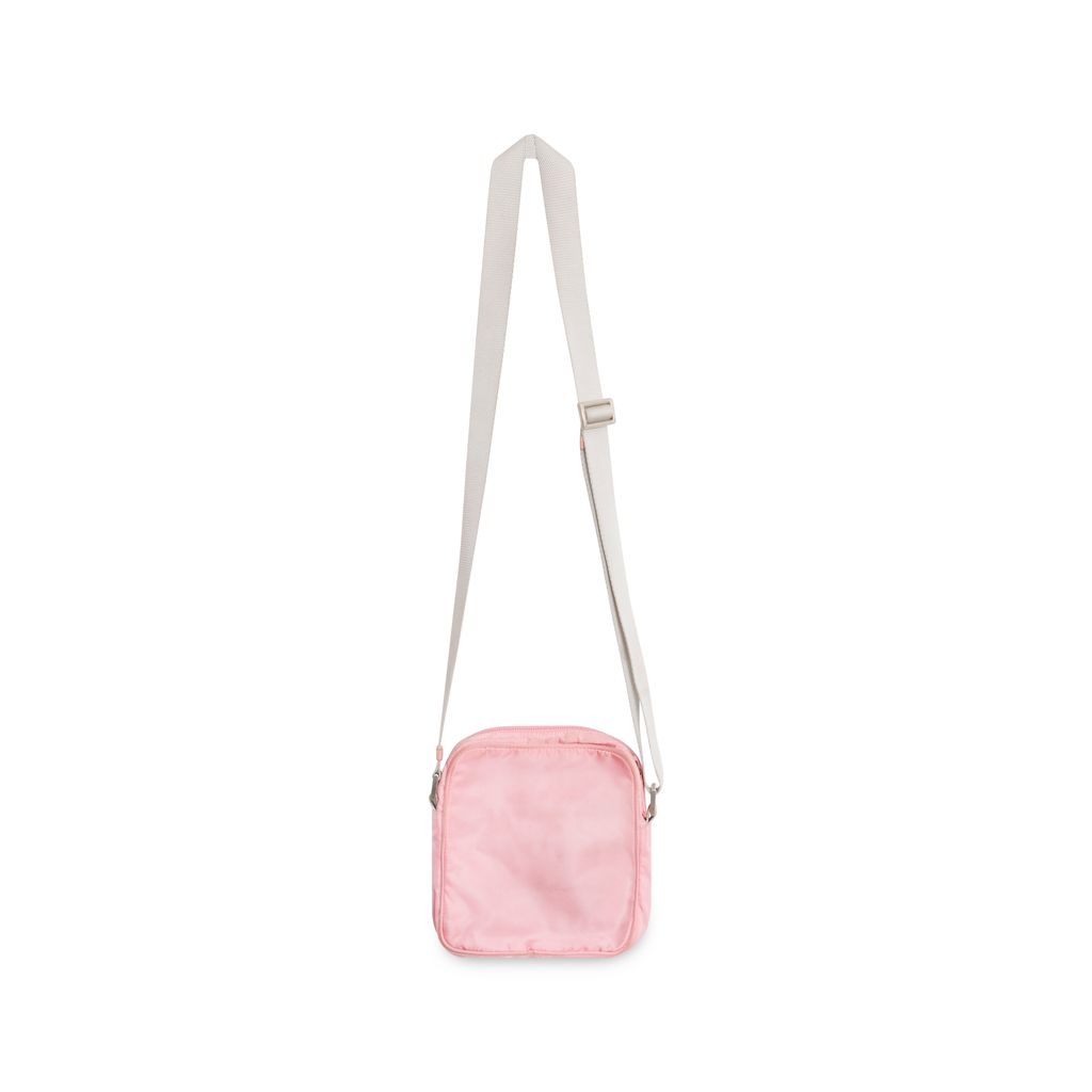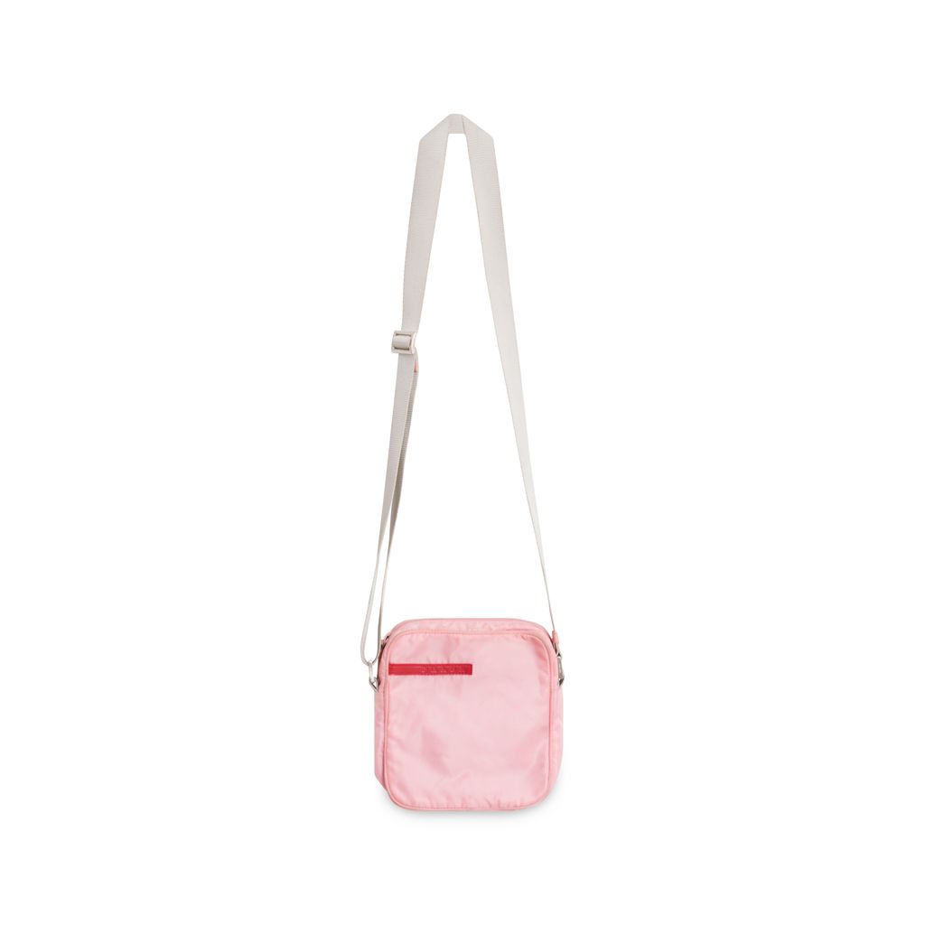 Prada Pink Nylon Crossbody Bag features red logo patch on front, zipper closure, logo lining, hidden zipper pocket on inside, adjustable crossbody strap.