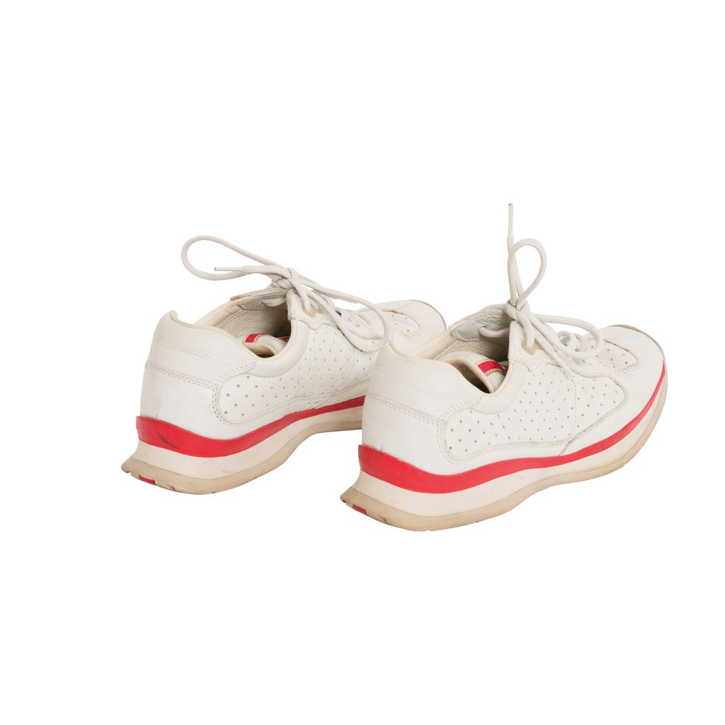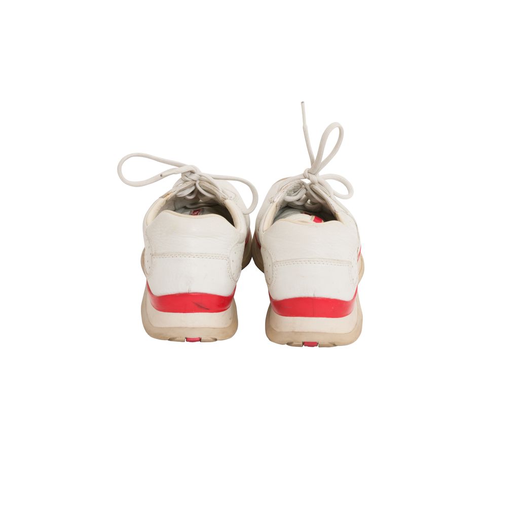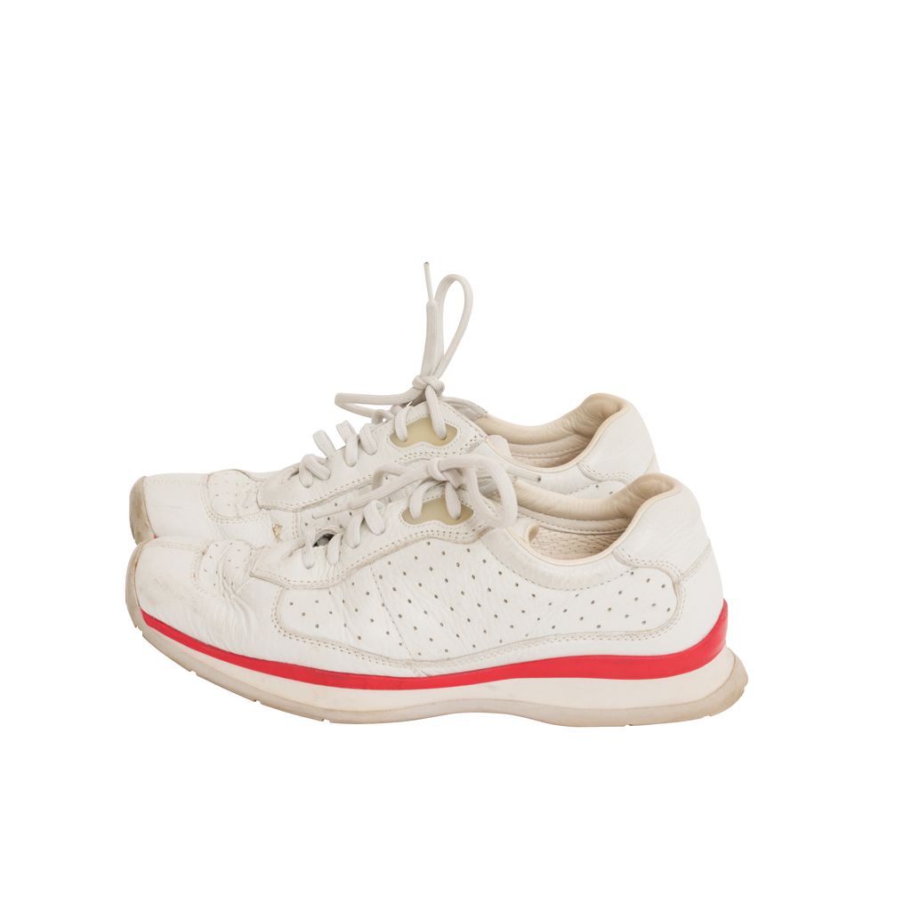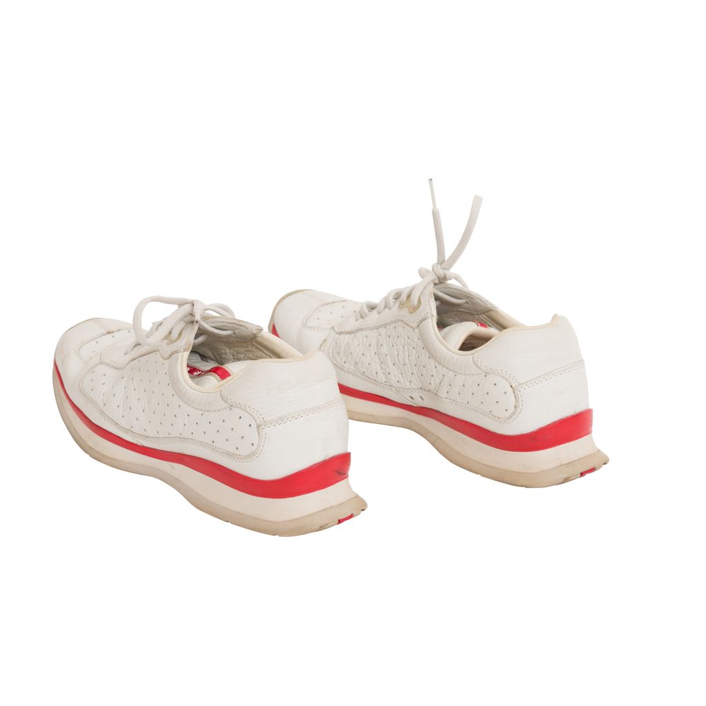 Prada Square Toe Sneakers features square toe, leather material, red lining around outsole and down tongue, moderate wear throughout.